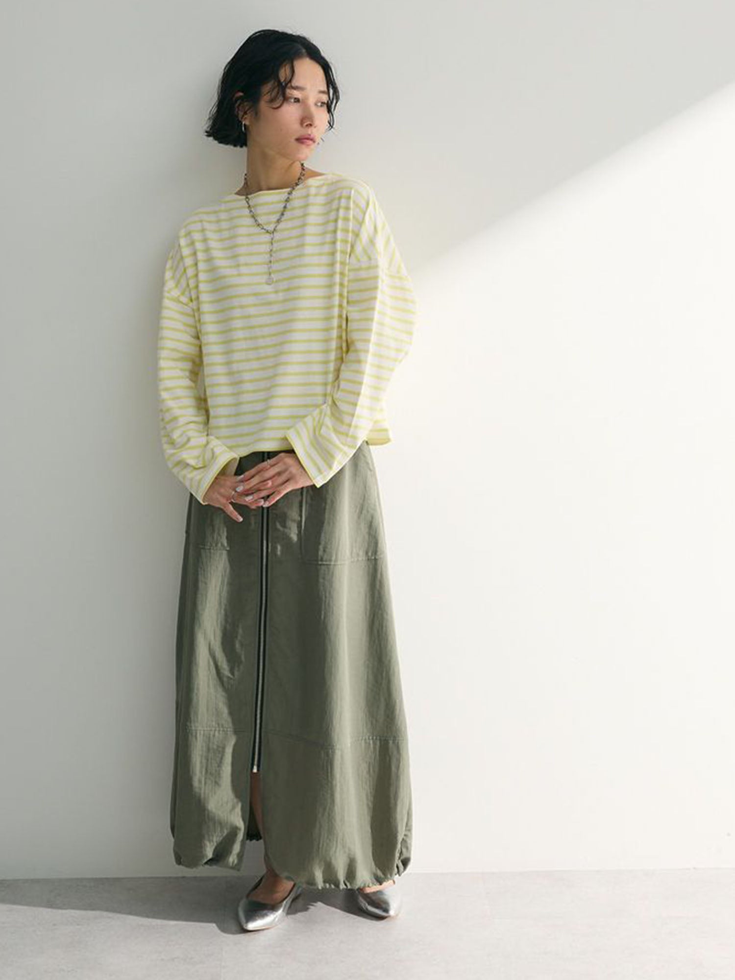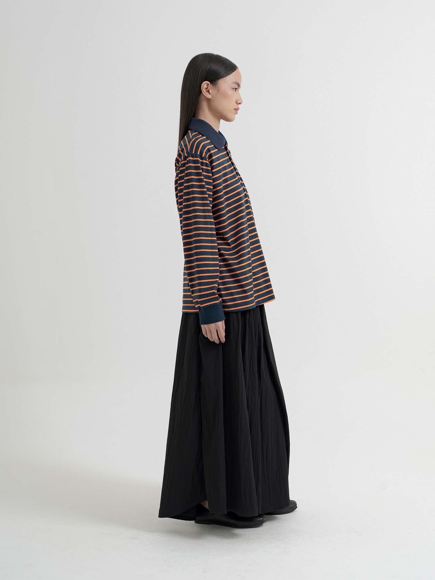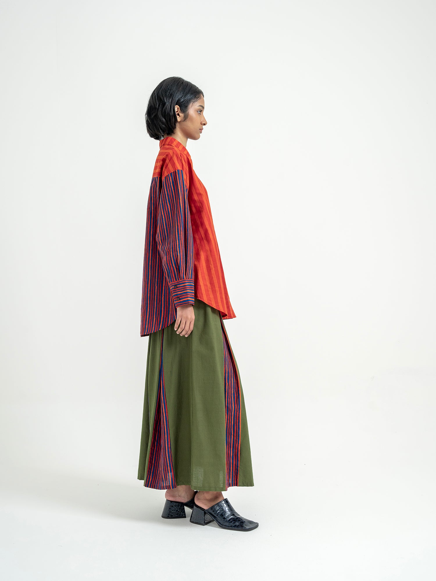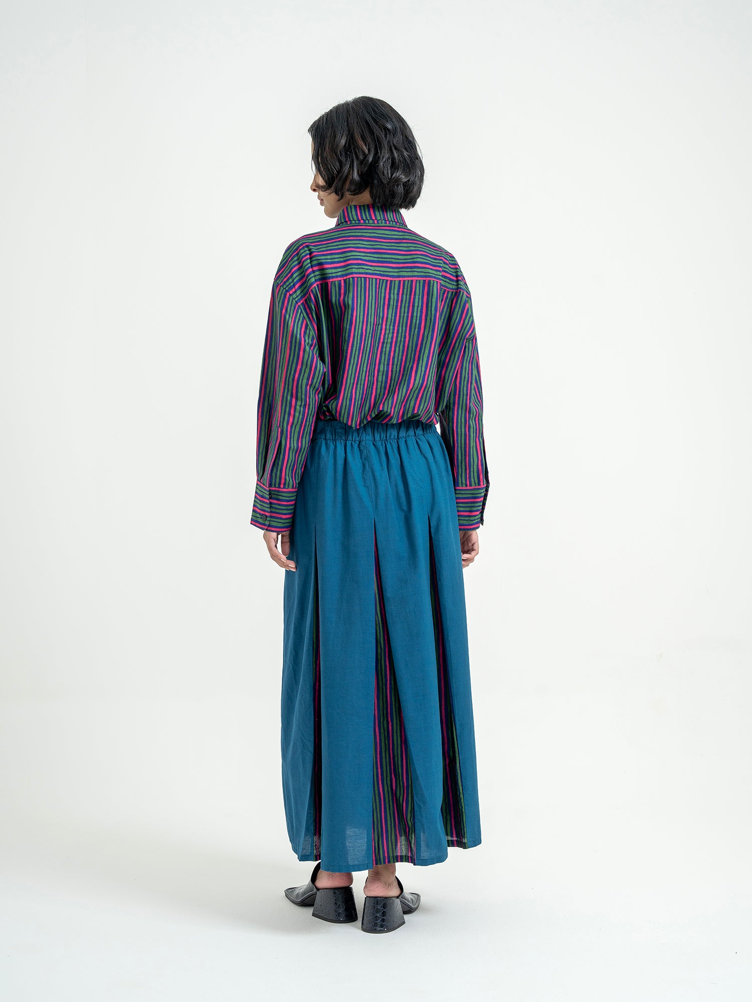 Melvin in Imabari Mermaid Skirt and Iruka Striped Pullover. A bright pop, balanced with effortless movement.