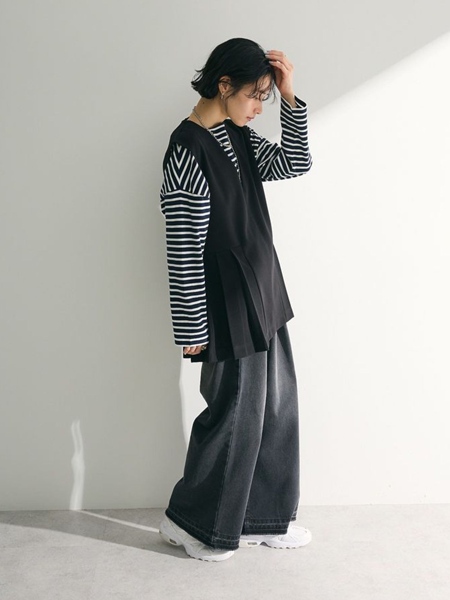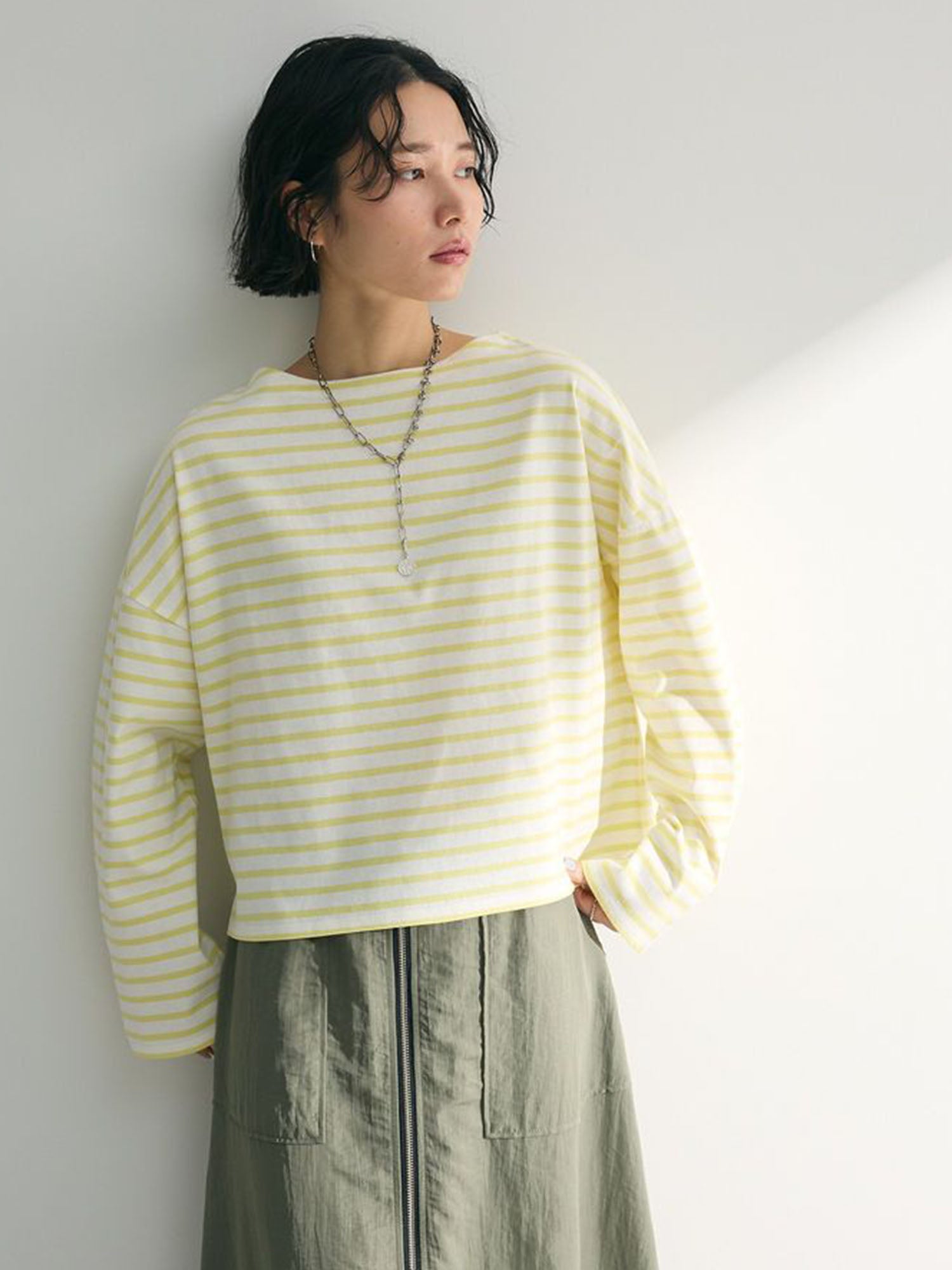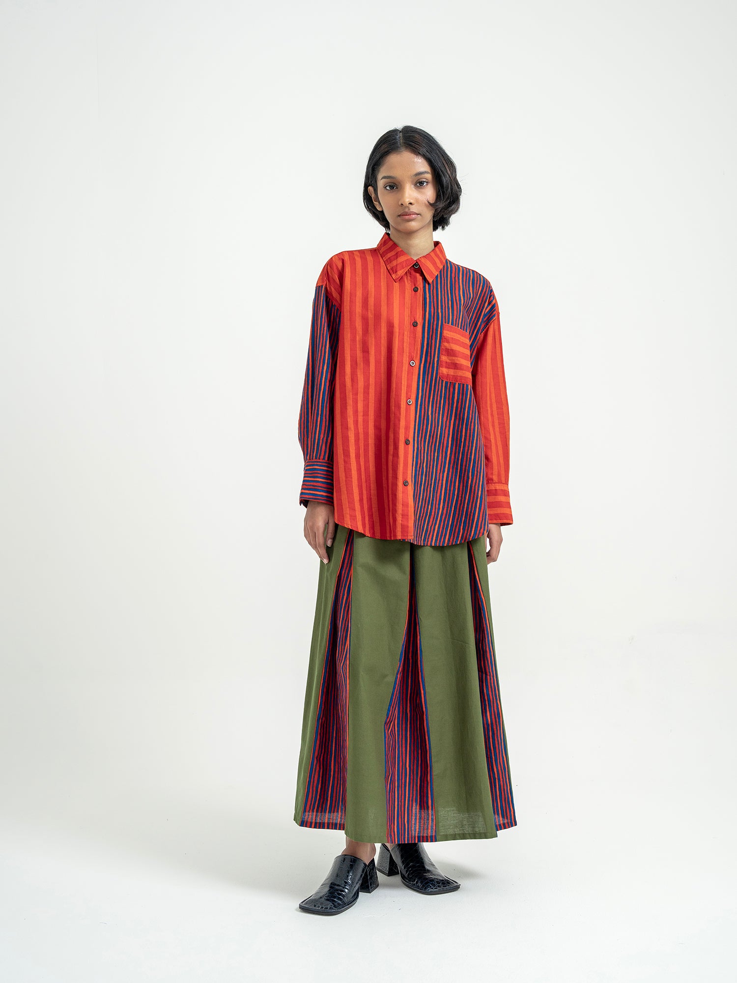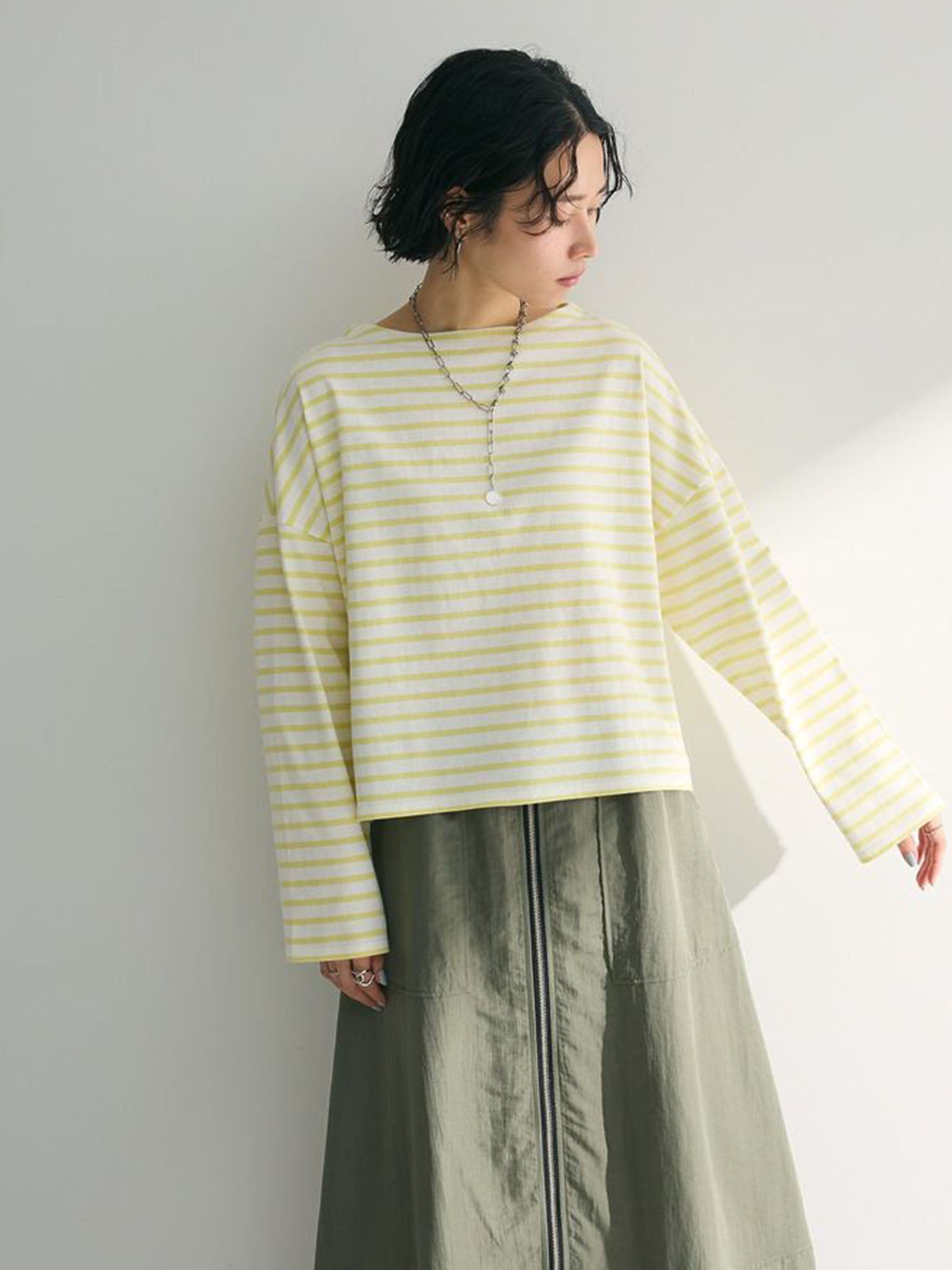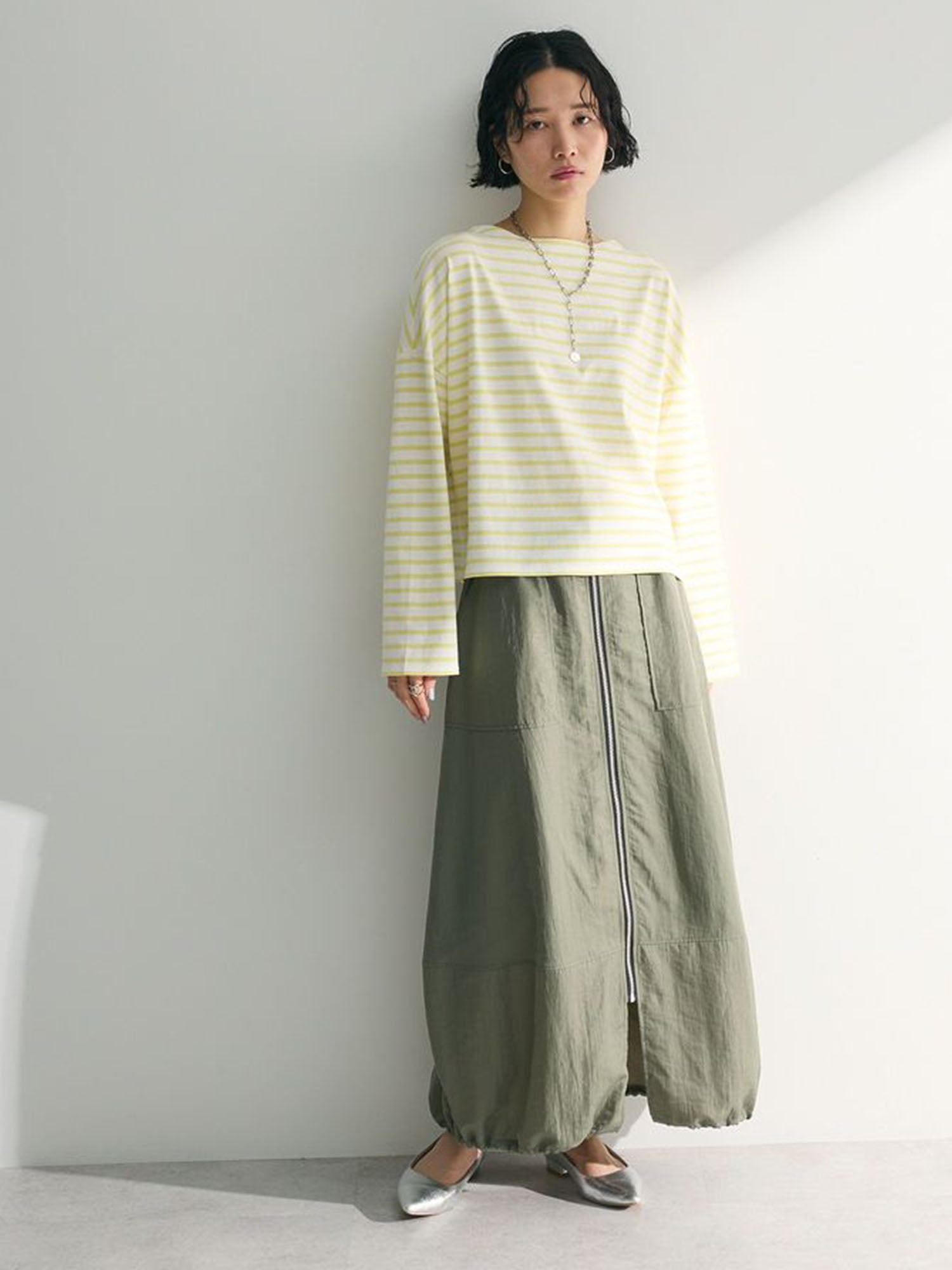 Melvin in Imabari Mermaid Skirt and Iruka Striped Pullover. A bright pop, balanced with effortless movement.