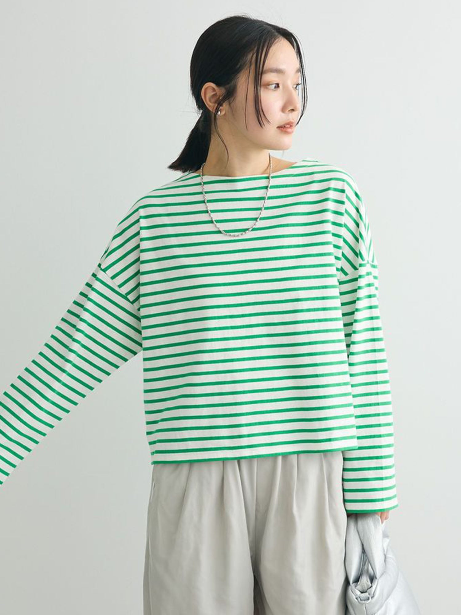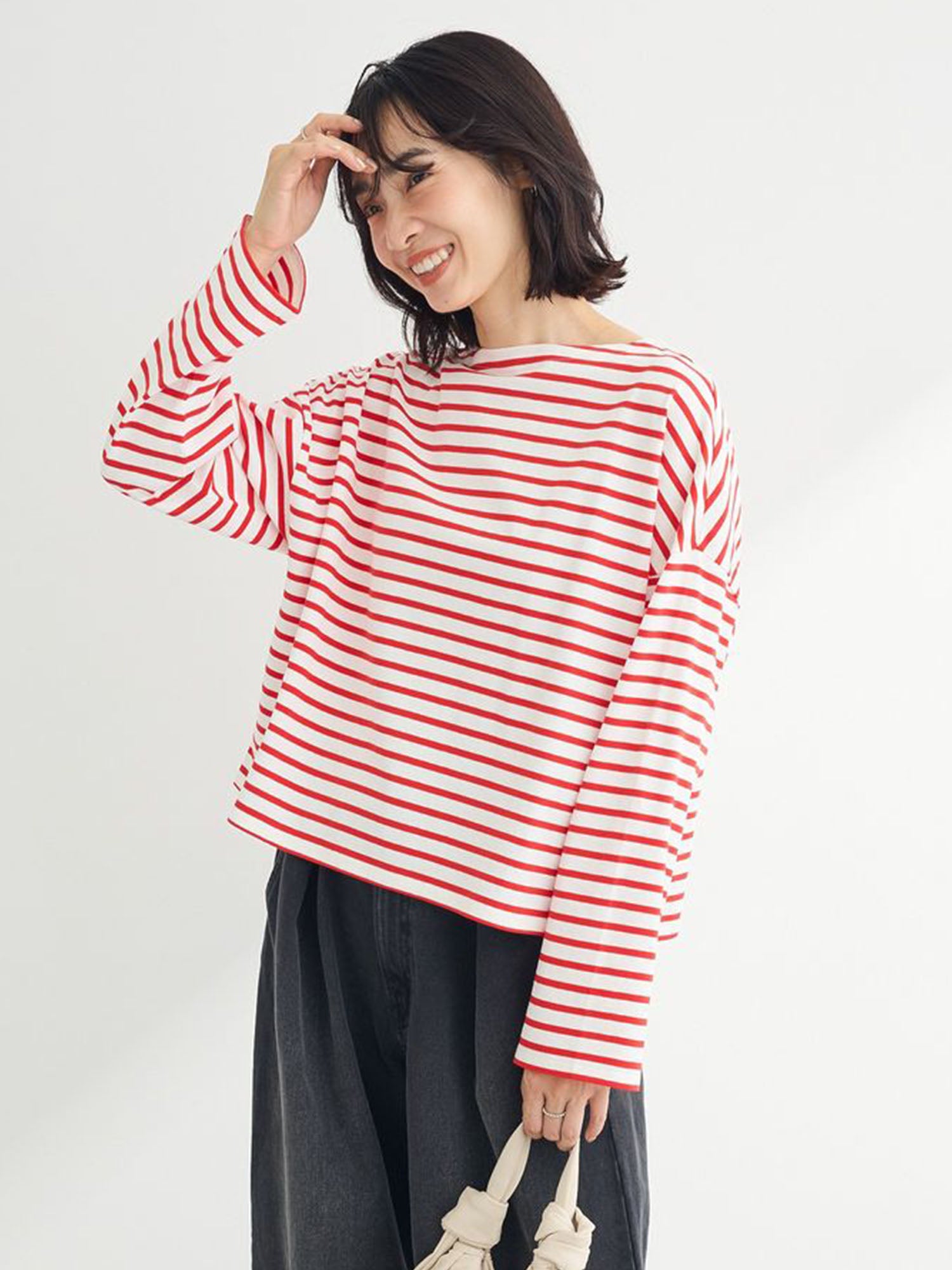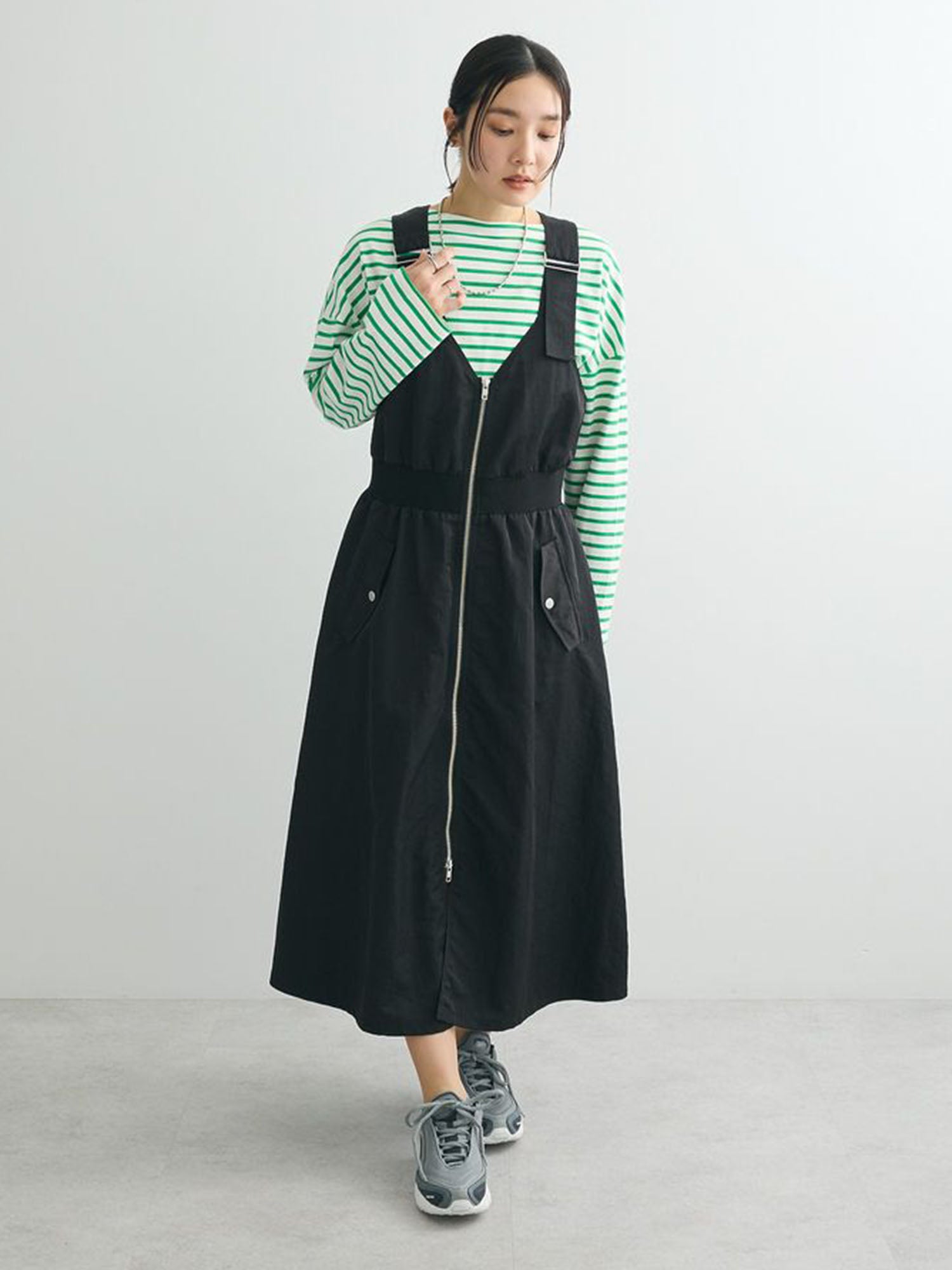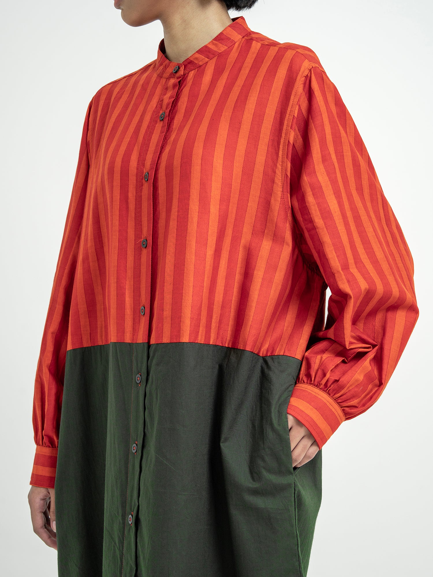 Melvin in Imabari Mermaid Skirt and Iruka Striped Pullover. A bright pop, balanced with effortless movement.