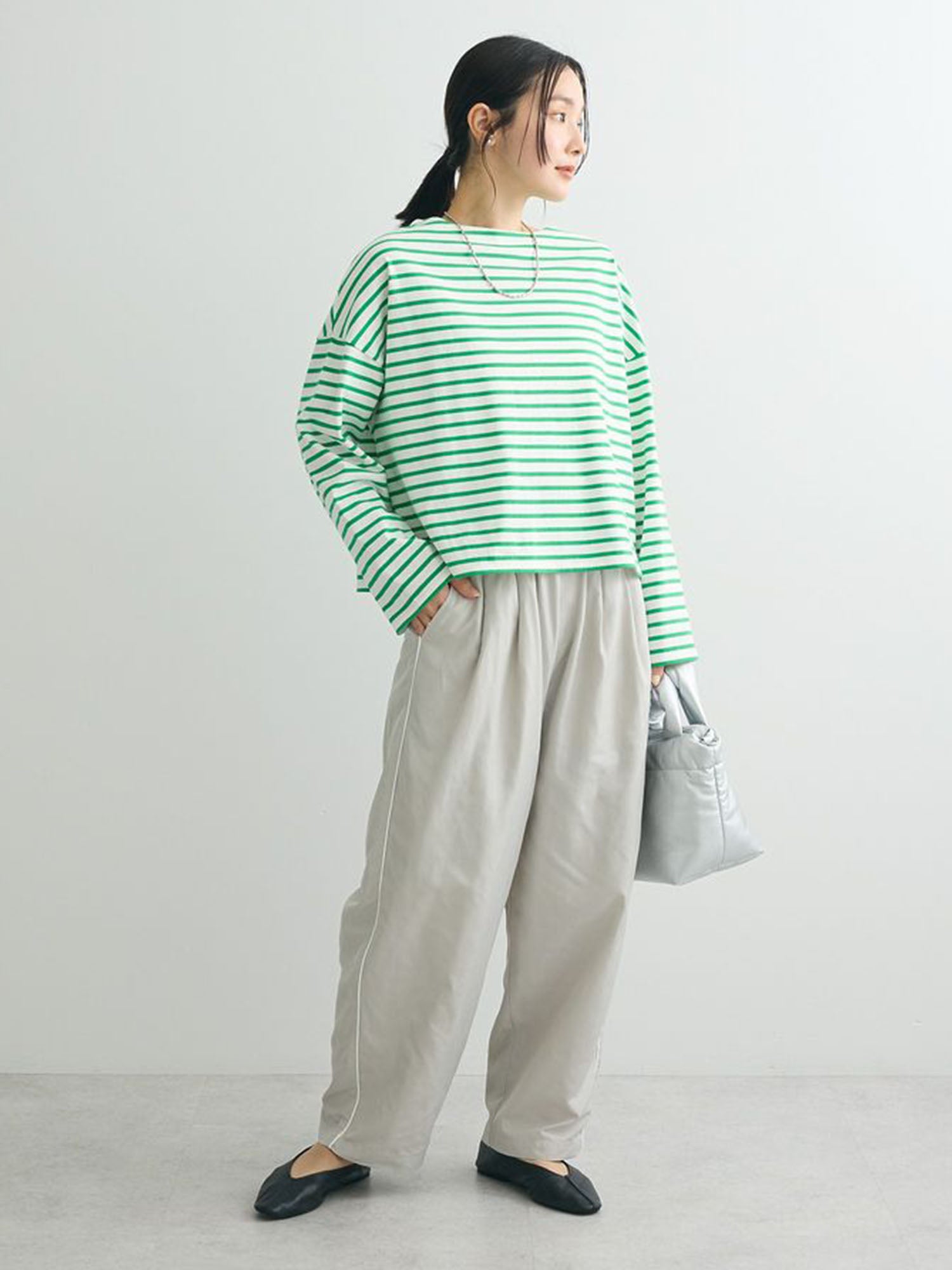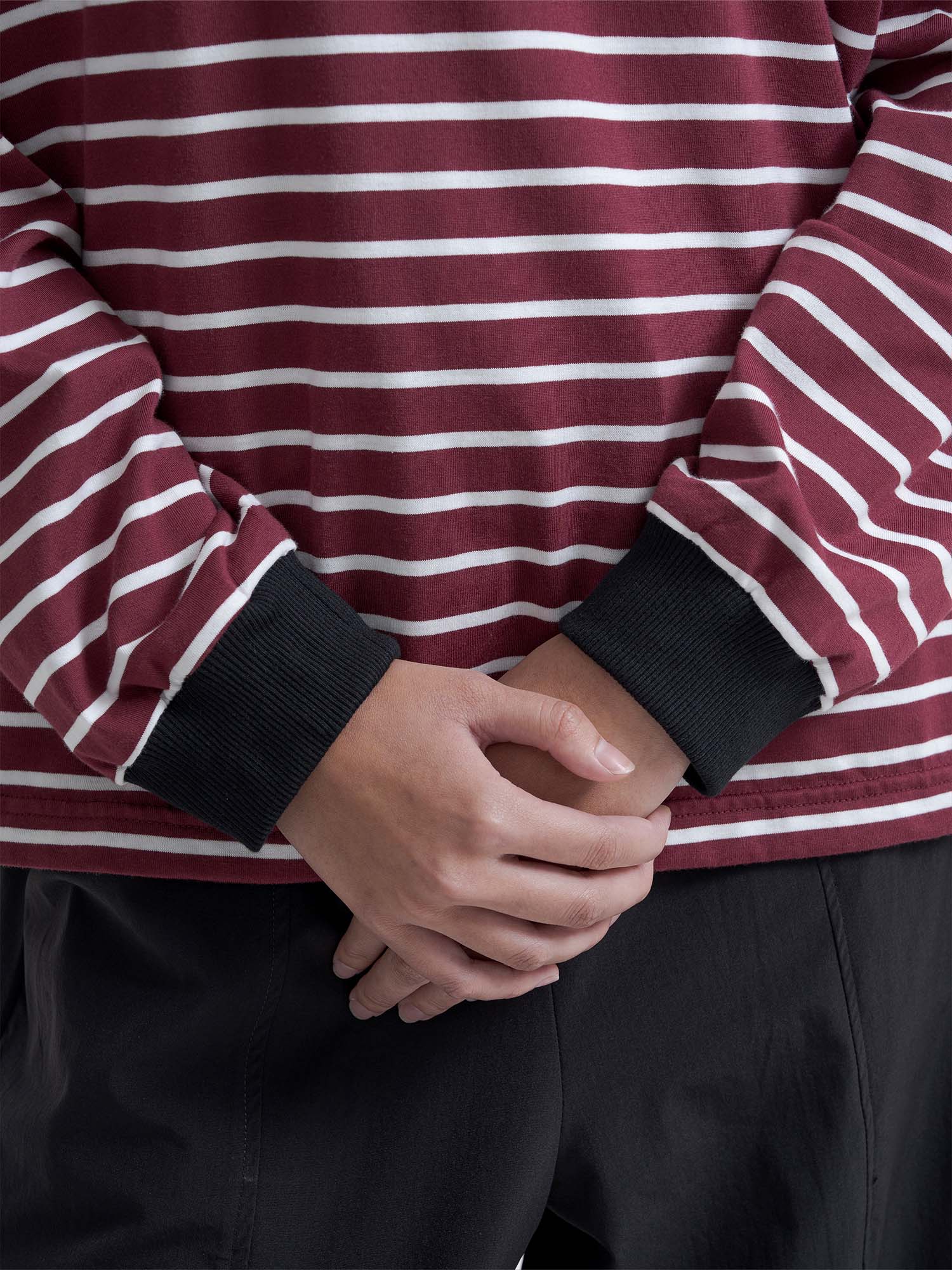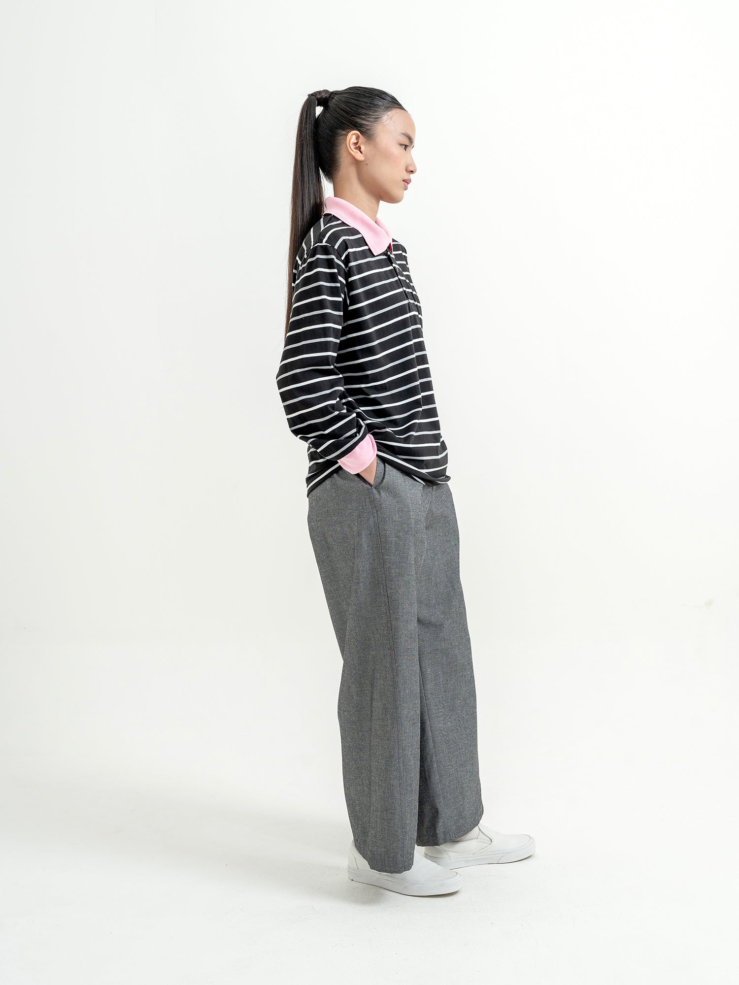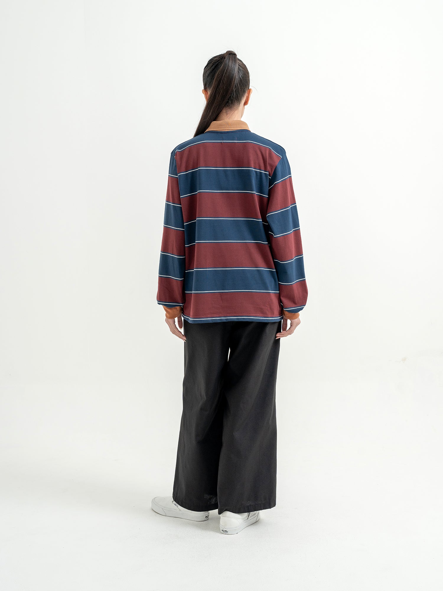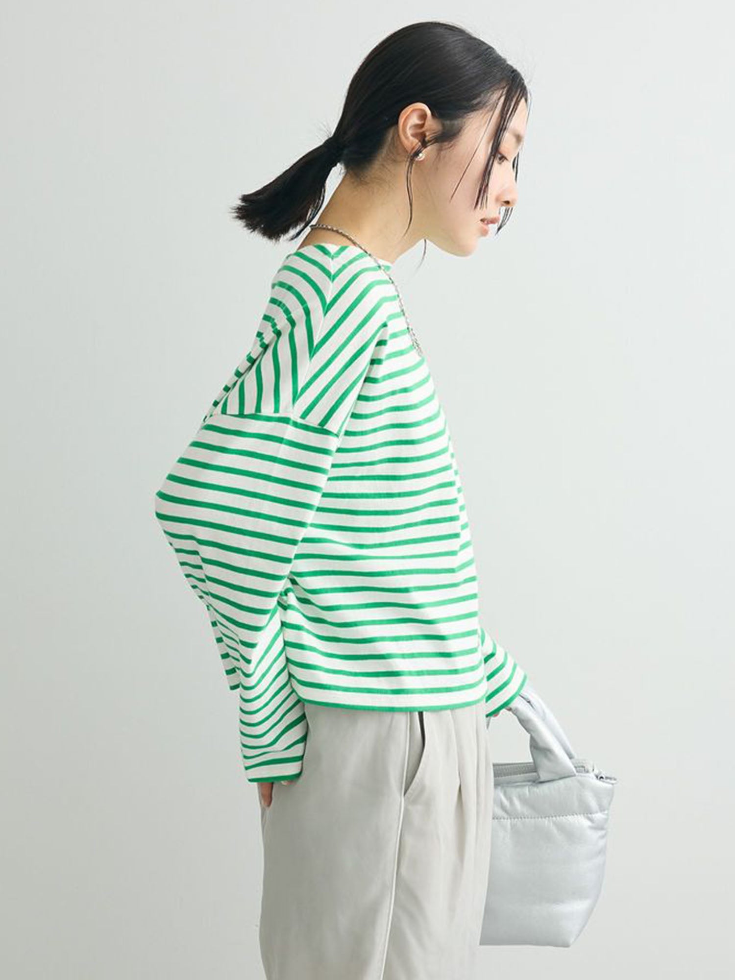 Melvin in Imabari Mermaid Skirt and Iruka Striped Pullover. A bright pop, balanced with effortless movement.
