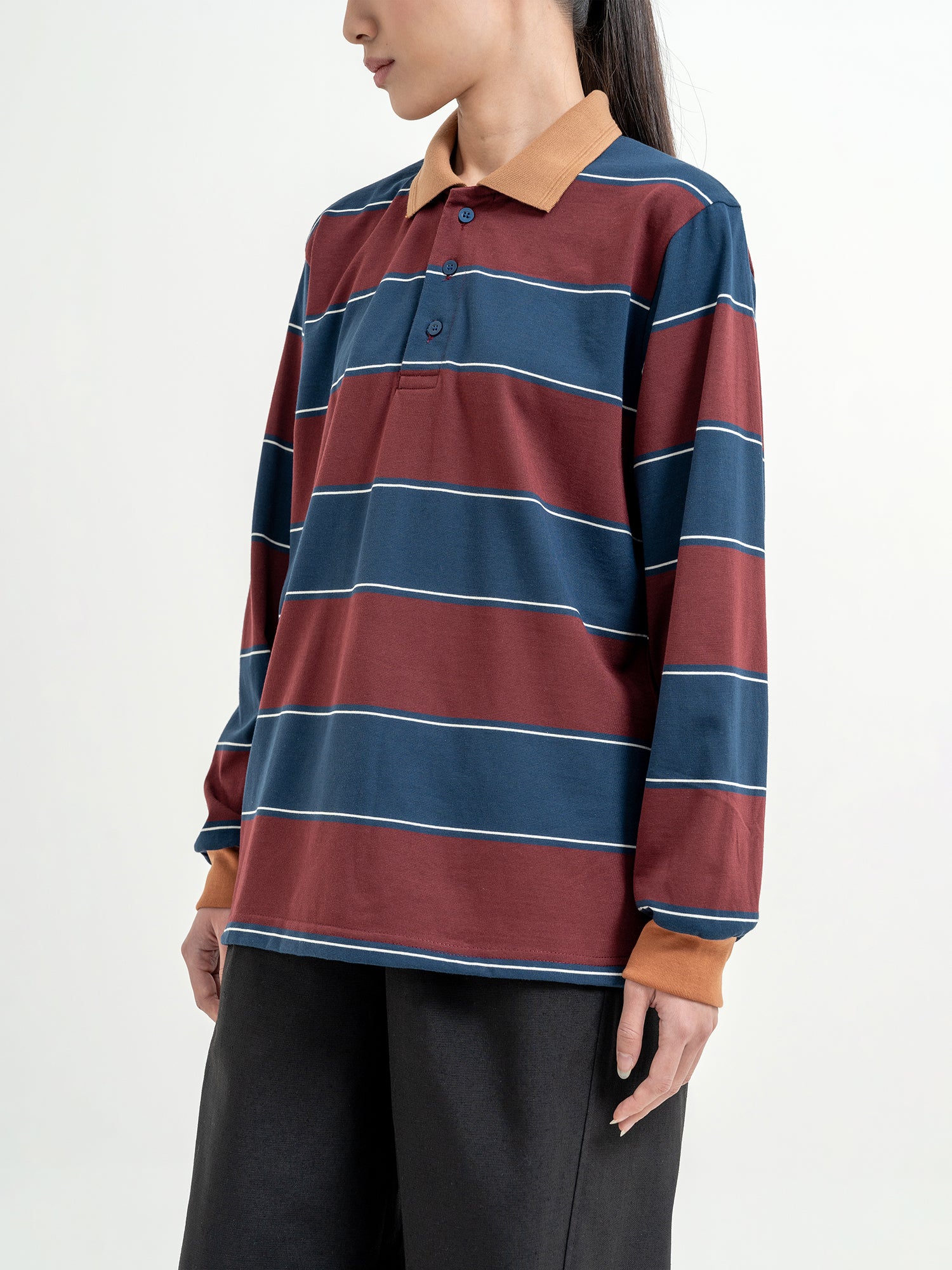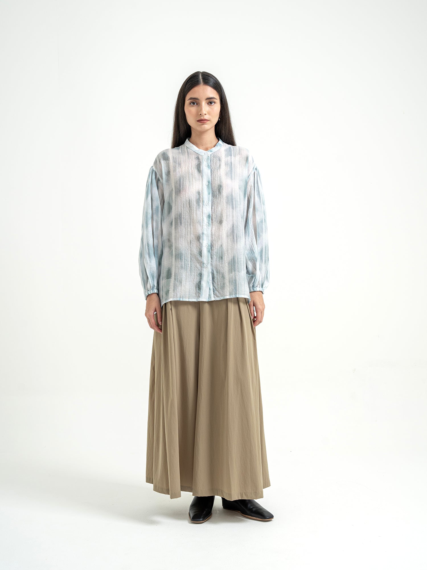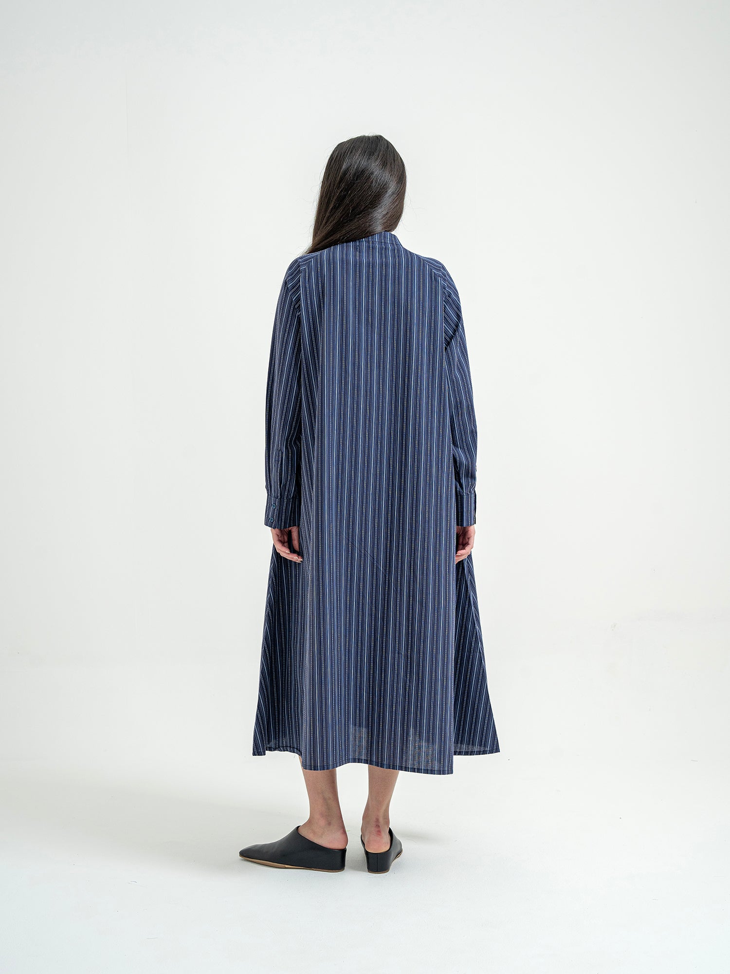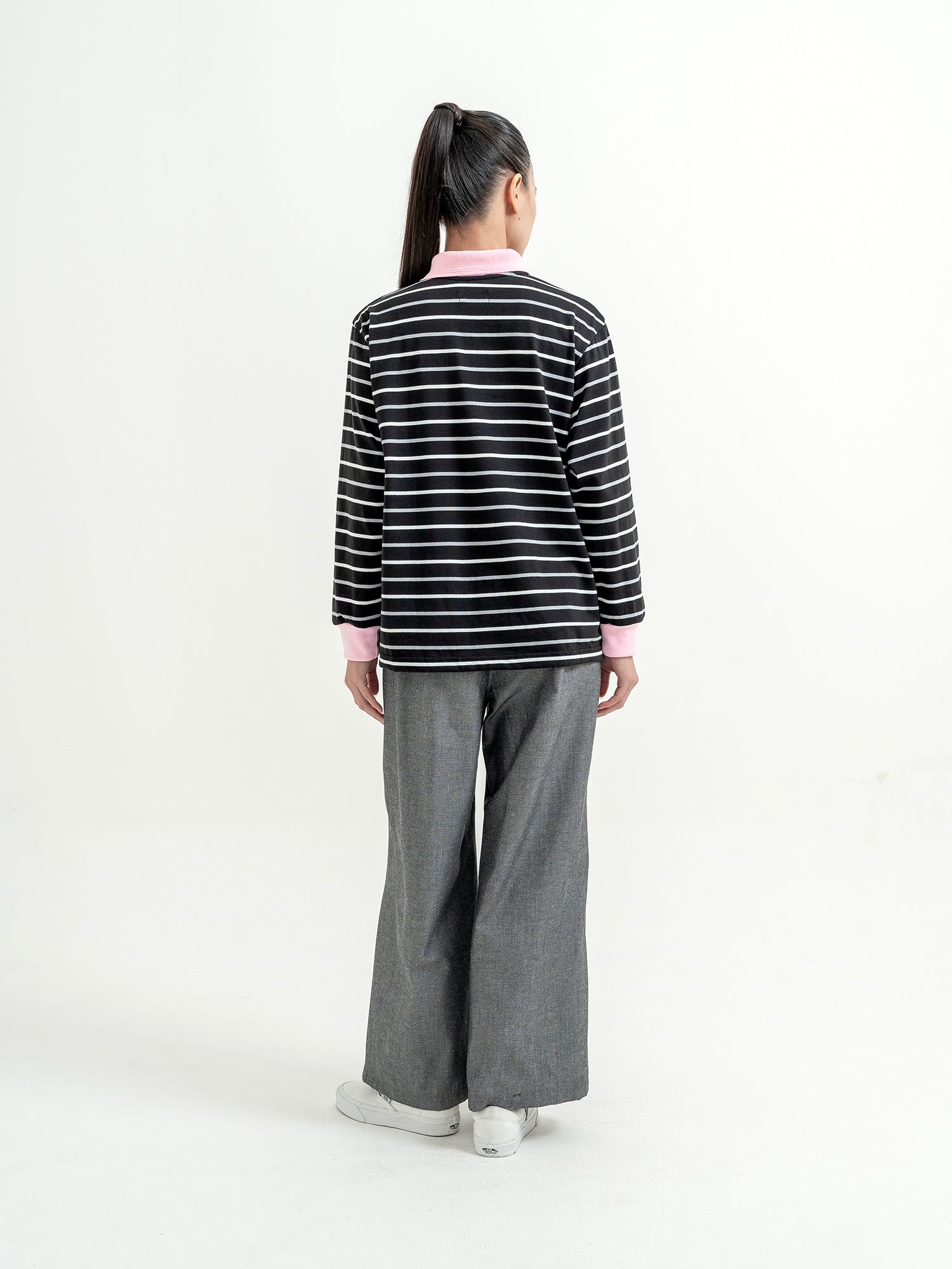 Melvin in Imabari Mermaid Skirt and Iruka Striped Pullover. A bright pop, balanced with effortless movement.