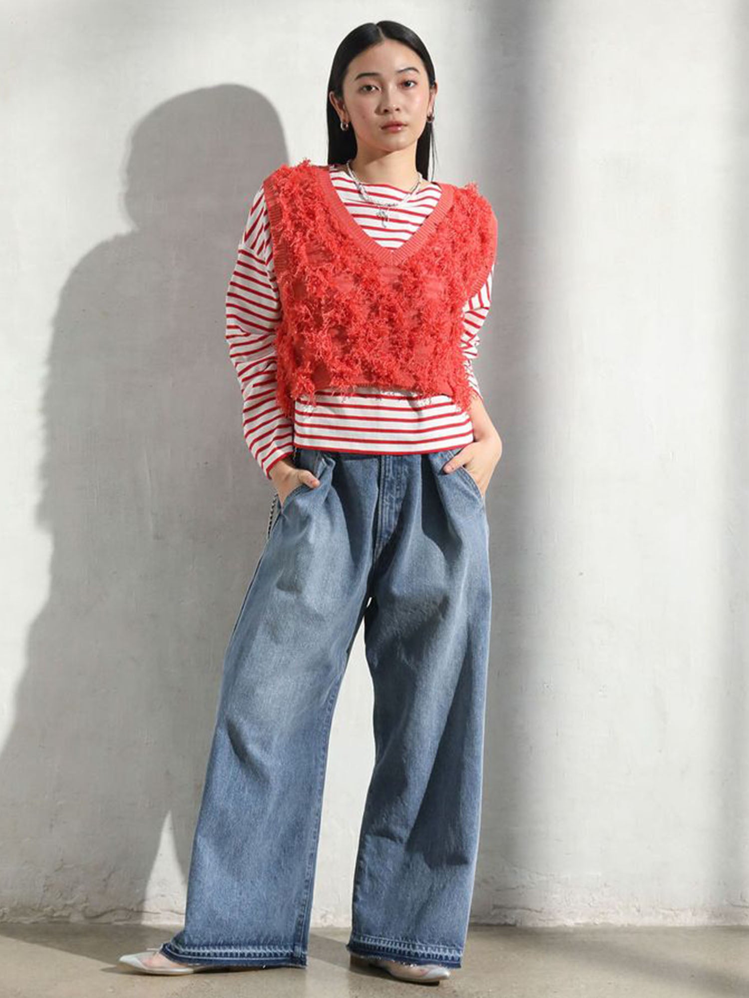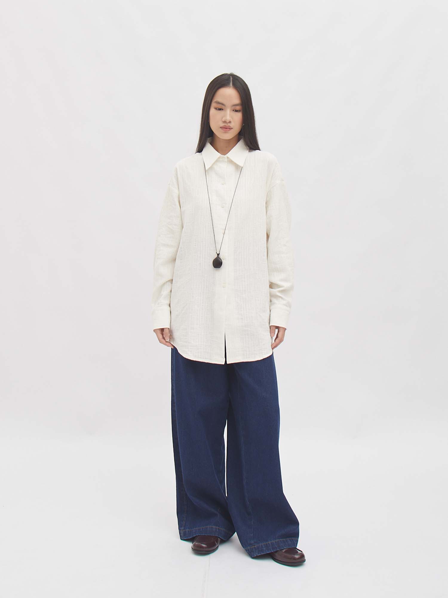 A relaxed silhouette with refined details — Cindy styles the Tsutsuji UV Knit Cardigan in Navy and Kakogawa Tucked Wide Denim Pants in Light Indigo.