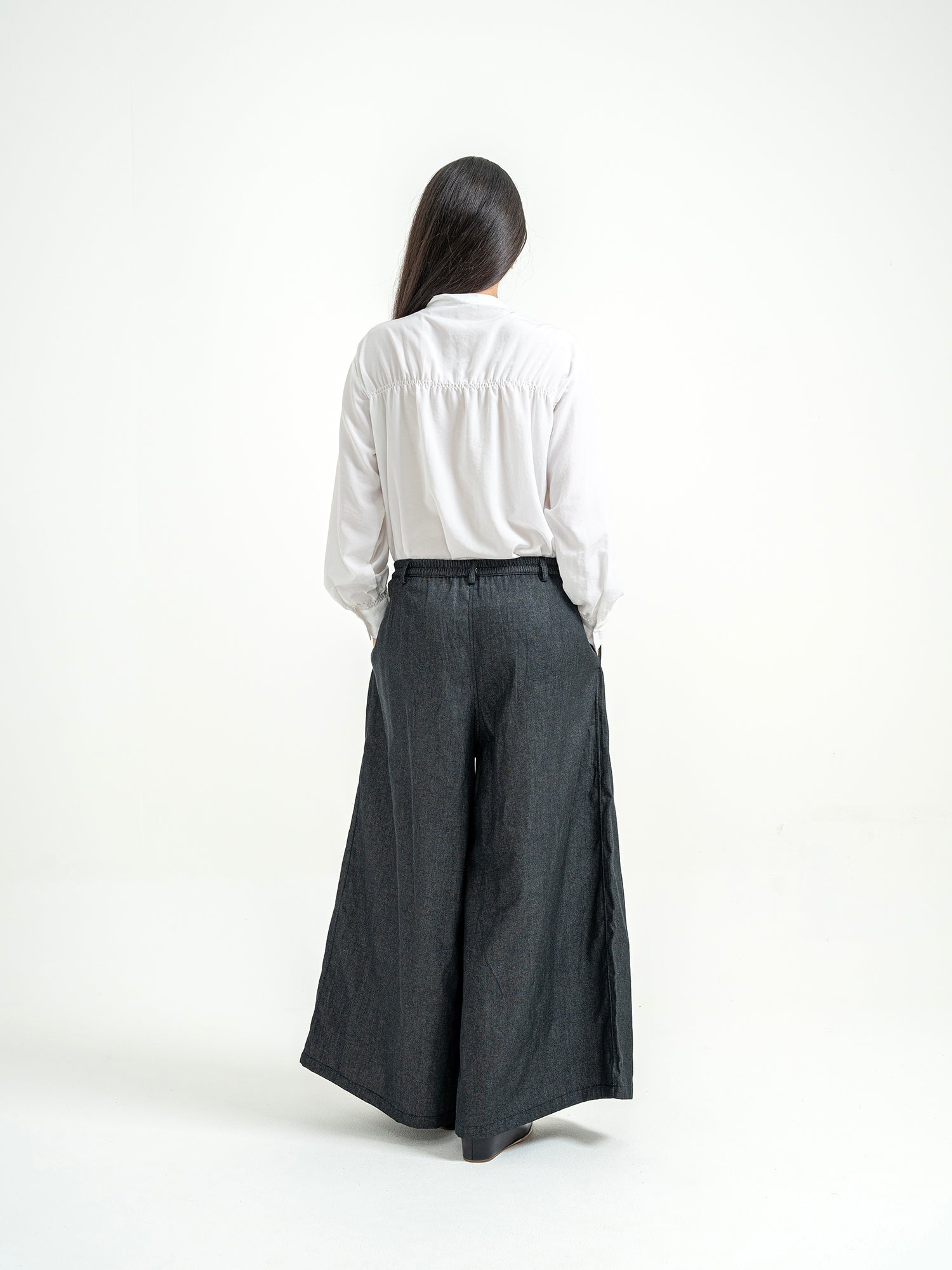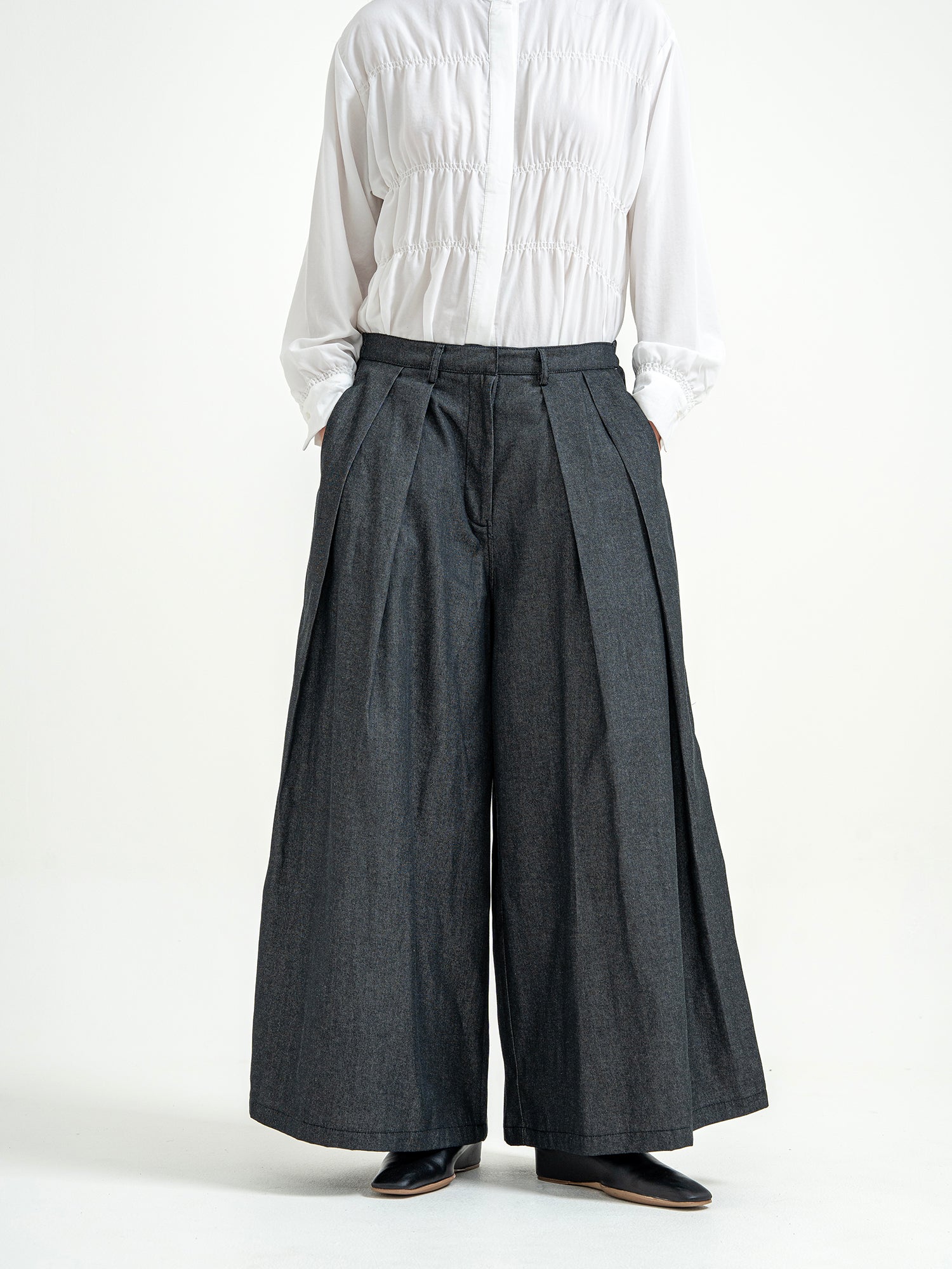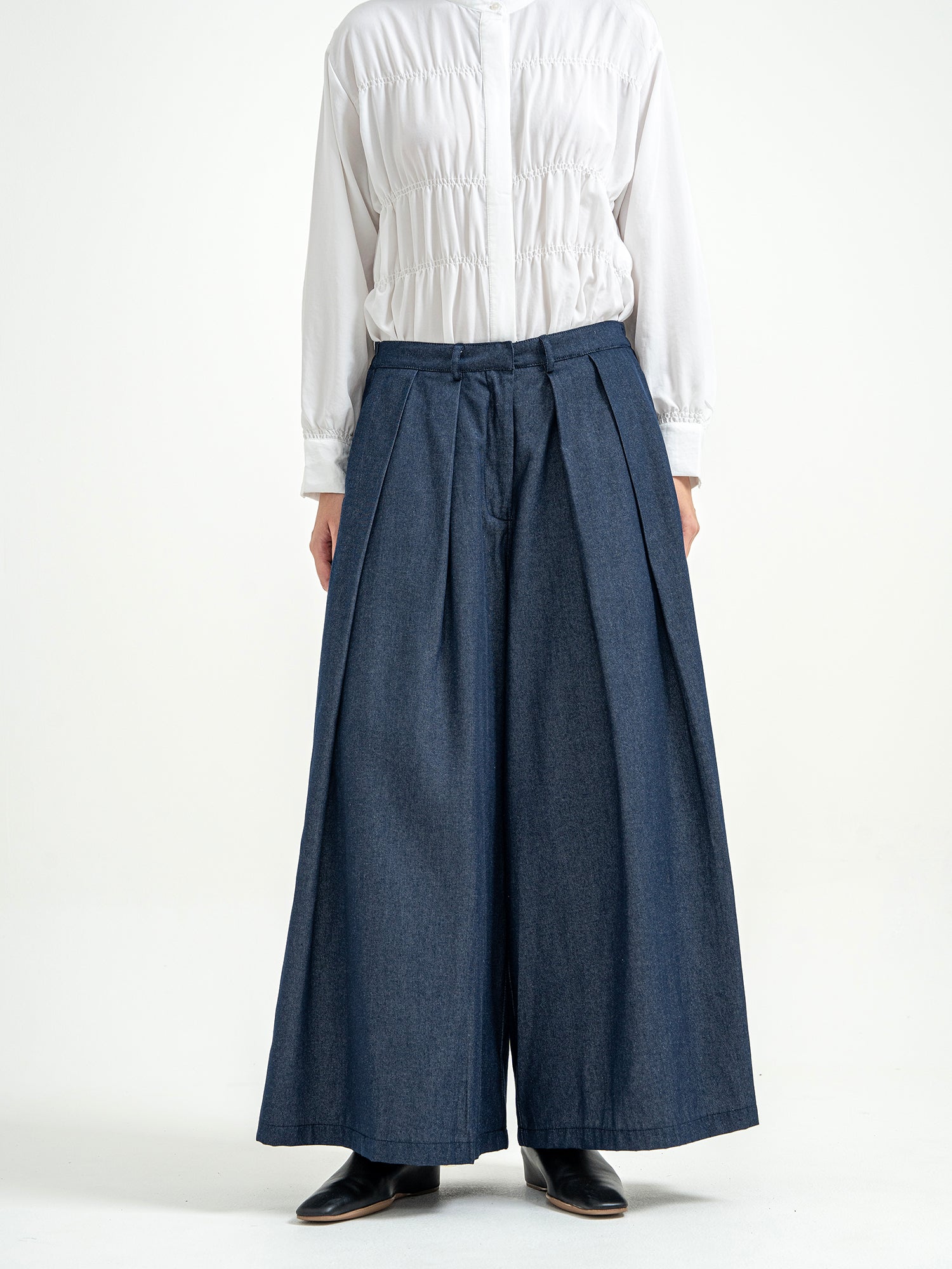 Anggita in full denim ease: Nishiwaki Denim Short Blouson paired Nankoku Tucked Wide Denim Pants.
