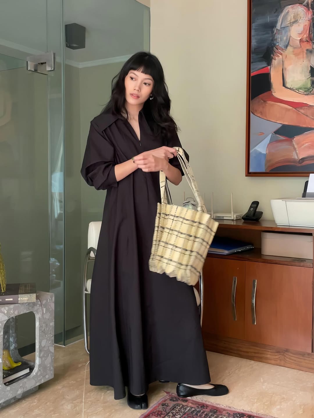 Cinintya is styling the versatile Charvi Jacquard Dress with Tweed Shopper Bag from PLEATSMAMA