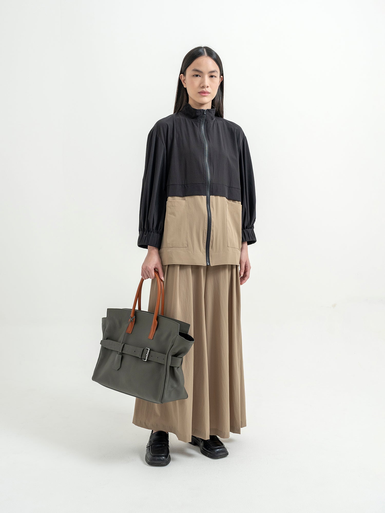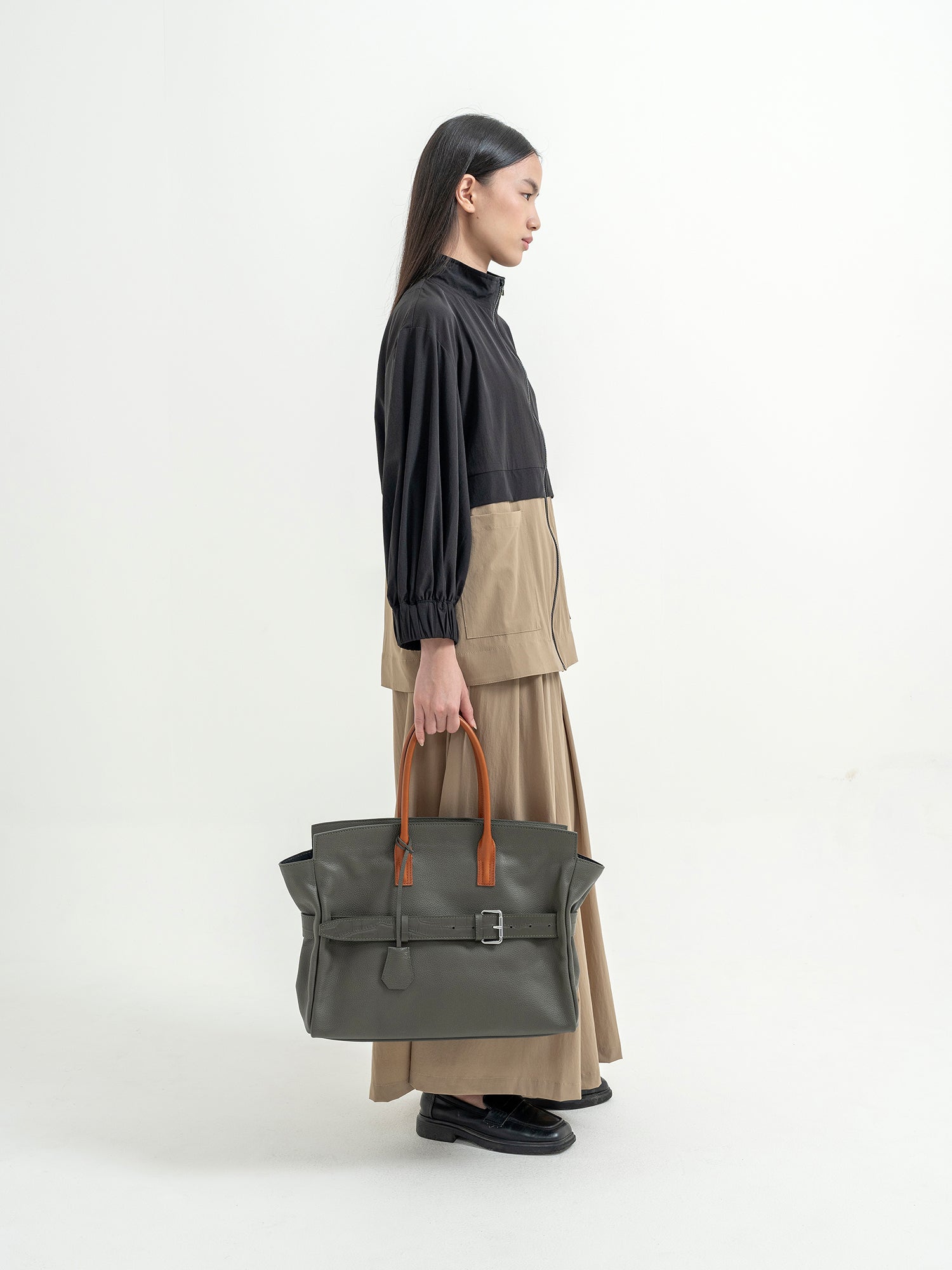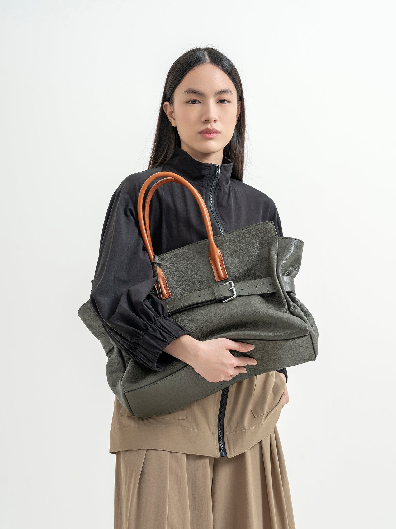 The Affix Bag is a bold and spacious statement piece designed for versatility and functionality. Featuring a structured yet slightly slouchy silhouette, it balances a refined aesthetic with everyday practicality. The top tubular handles allow for a comfortable grip, while the detachable strap provides the option to wear it over the shoulder.