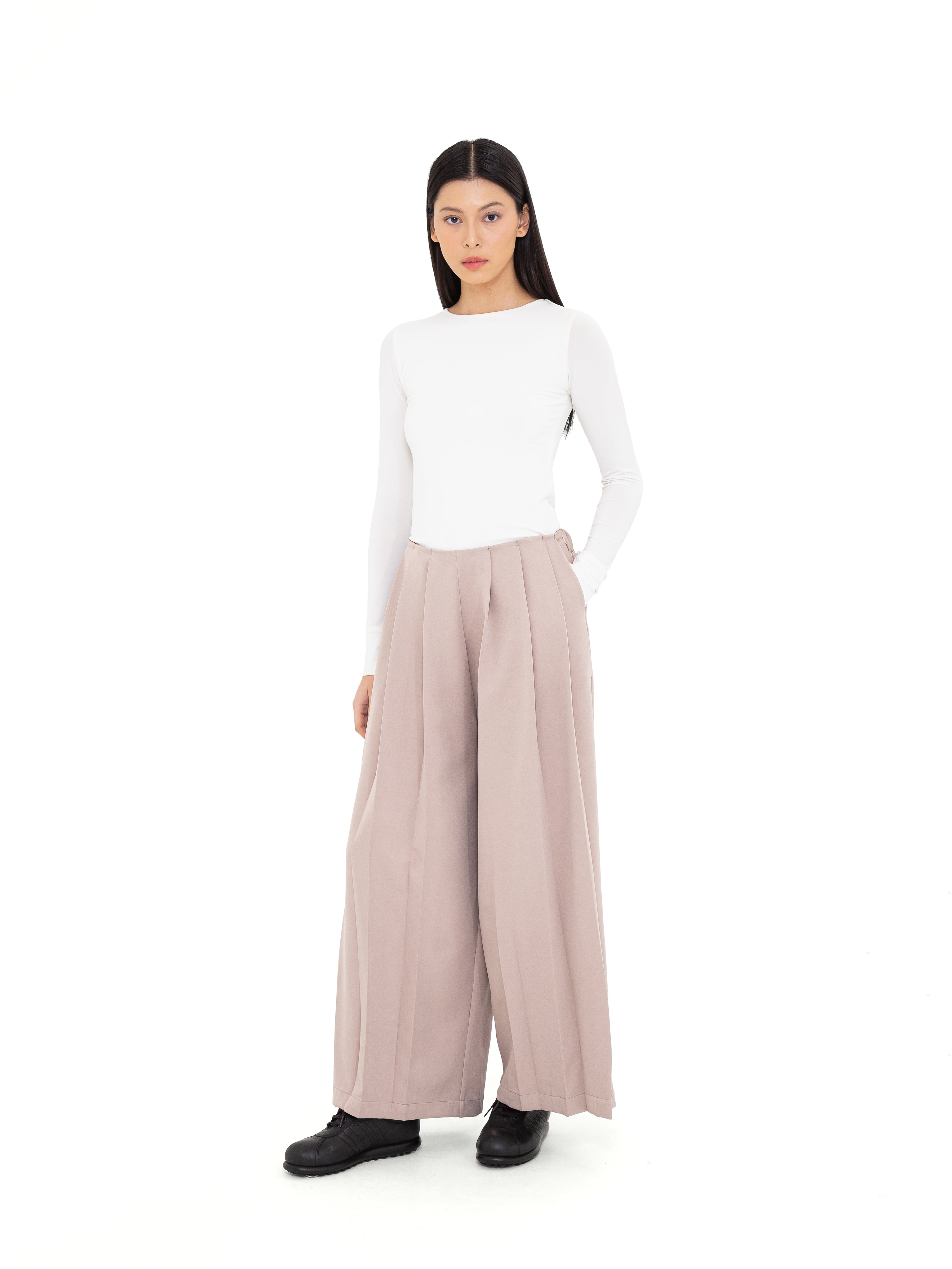 Didesain dengan lipit-lipit halus (pleats) di bagian depan, Albus Pants menciptakan proporsi yang sleek dan elongating, menjadikannya pilihan sempurna untuk tampilan modest yang elevated. Tersedia dalam dua warna klasik: