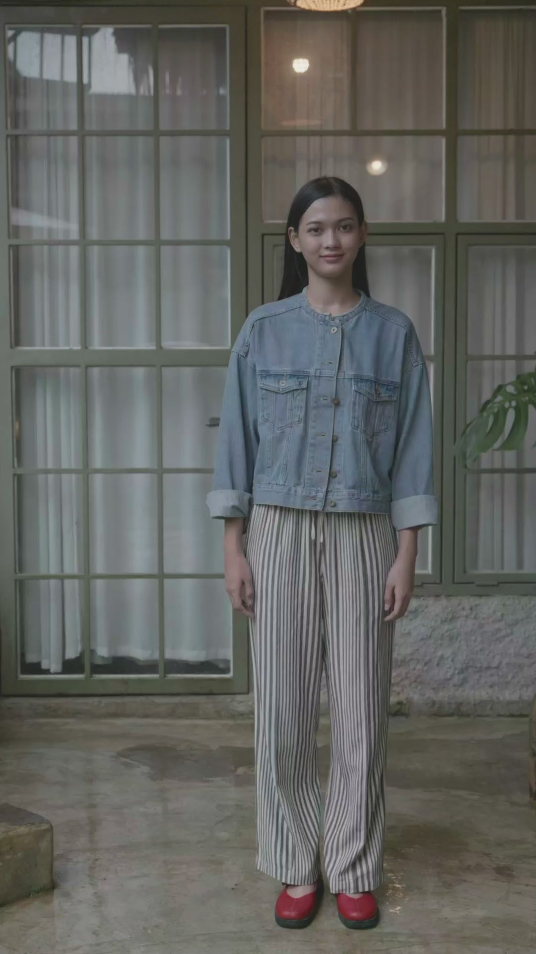 Celana panjang wanita ini didesain motif garis-garis. Memiliki cuttingan loose dan sedikit melebar. Terdapat karet dibagian belakang dan pita dibagian depan yang memberikan aksen elegan. Bahannya ringan dan tidak panas, serta terdapat saku pada bagian samping. Cocok digunakan untuk casual atau formal.
