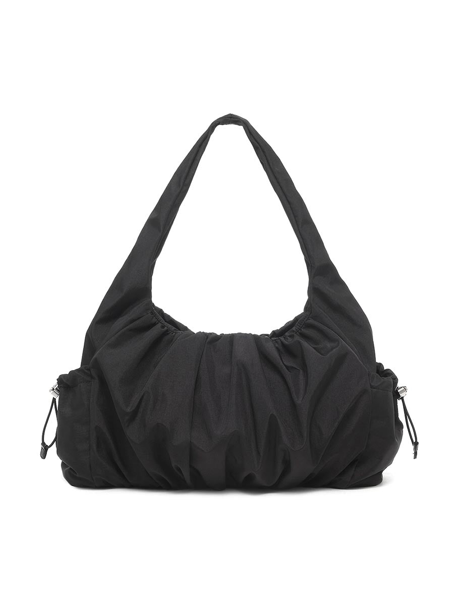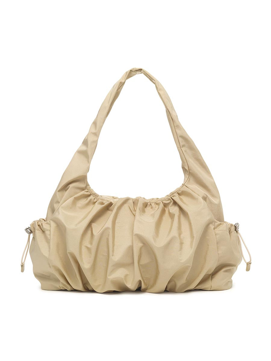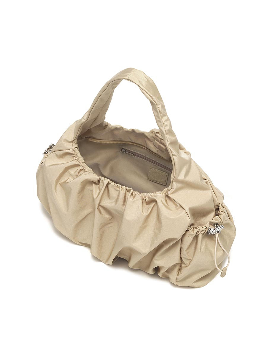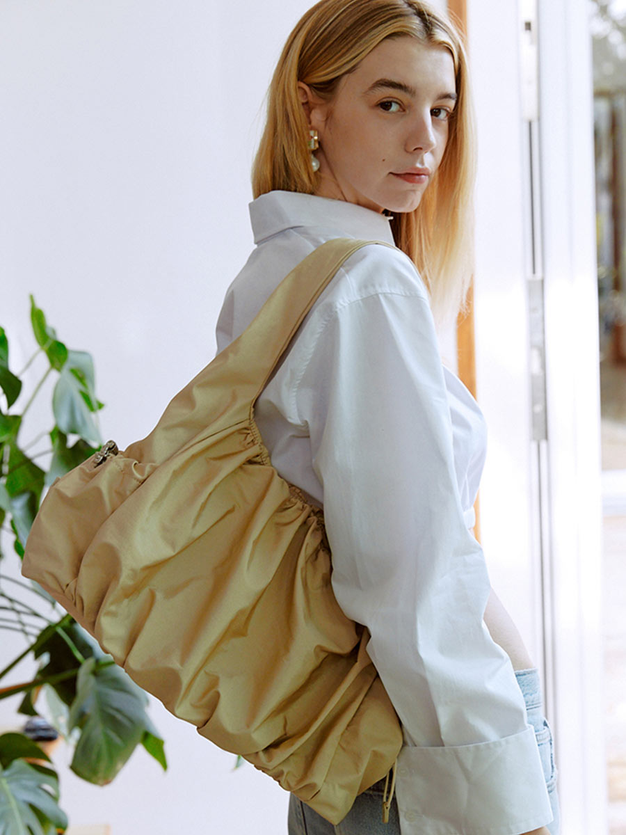 A meringue bag made of soild nylon fabric with a subtle linkle. With wide size and shirring details, you can wear it as a shoulder bag. The newly developed carlyn logo stopper pocket detail on both sides of bag makes it easy to store essential belongings such as mobile phones. Internal open pockets, 1 zipper pocket.