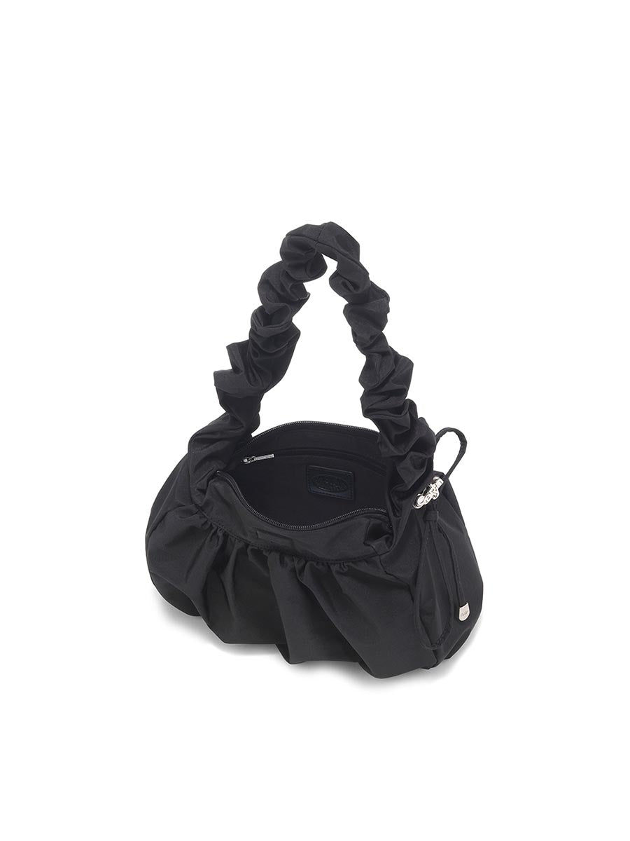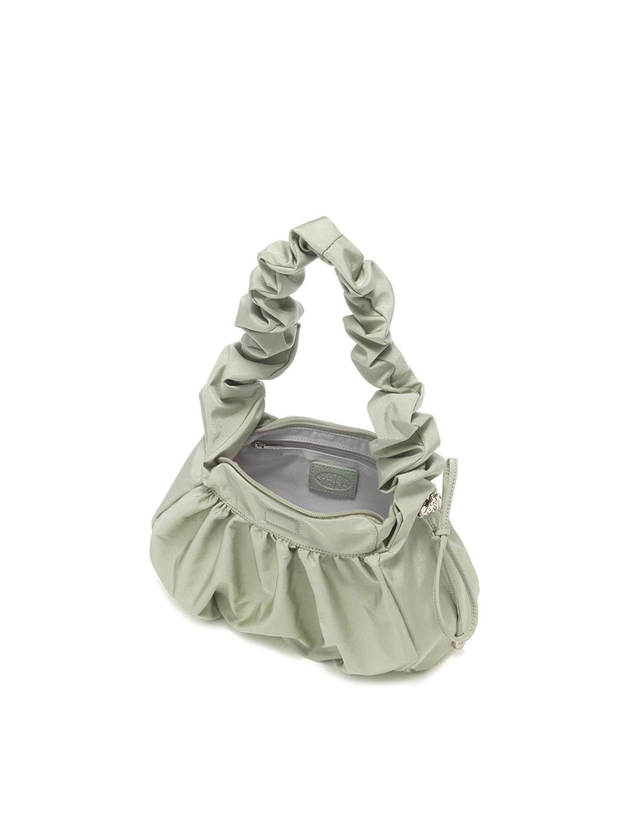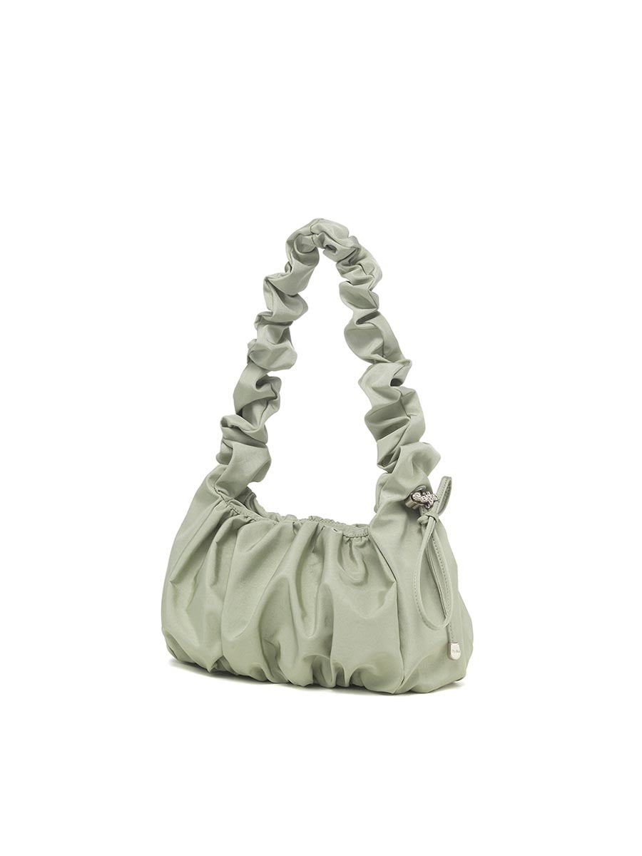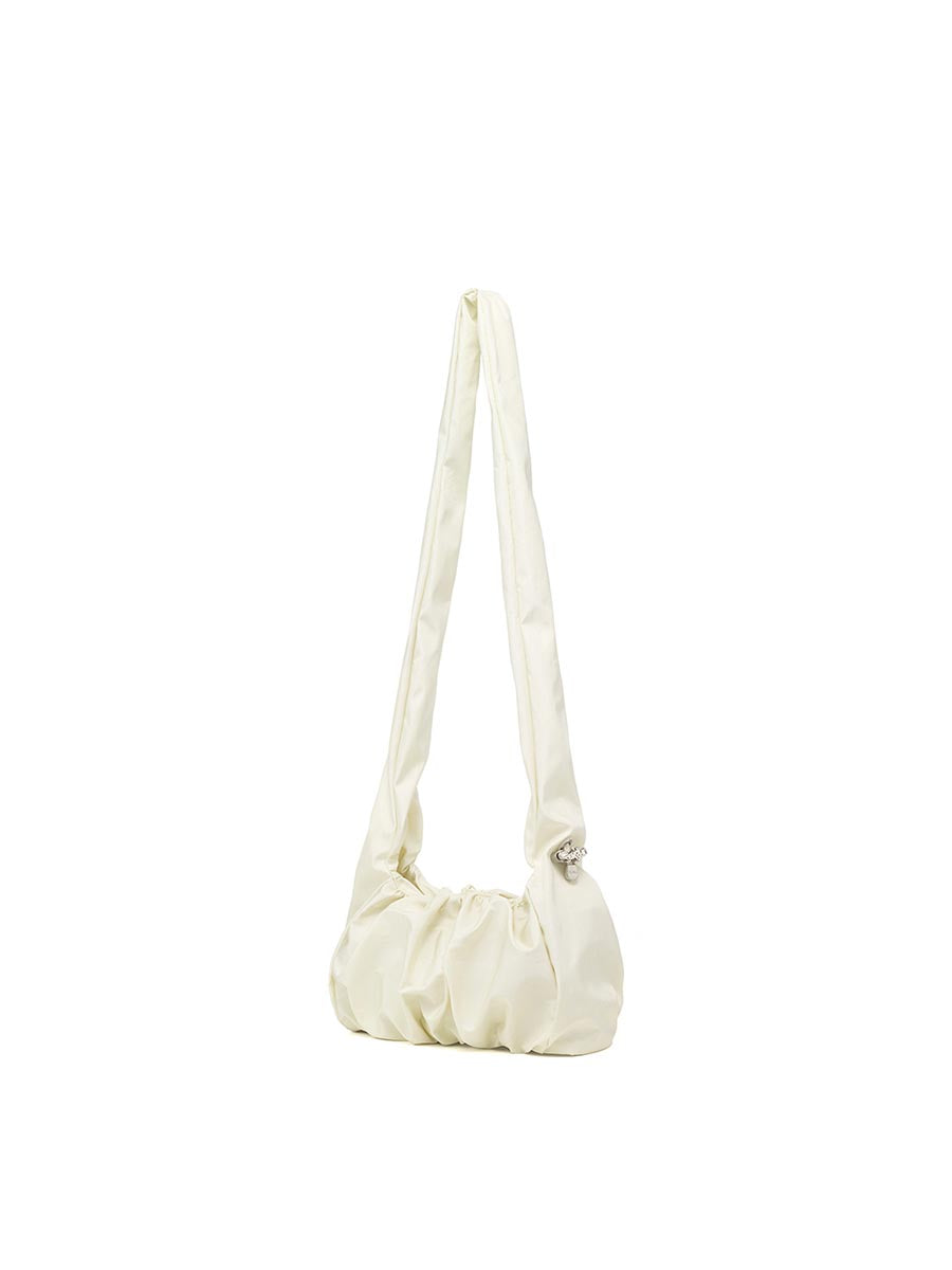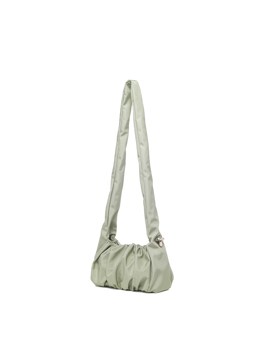 A meringue mini bag made of solid nylon fabric with a subtle linkle. Compared to the size, the strap can be adjusted to the desired length with the newly developed carlyn logo stopper with ample storage and shirring details. String bottom collin tip decorative details. 1 open pocket inside, 1 zipper pocket.