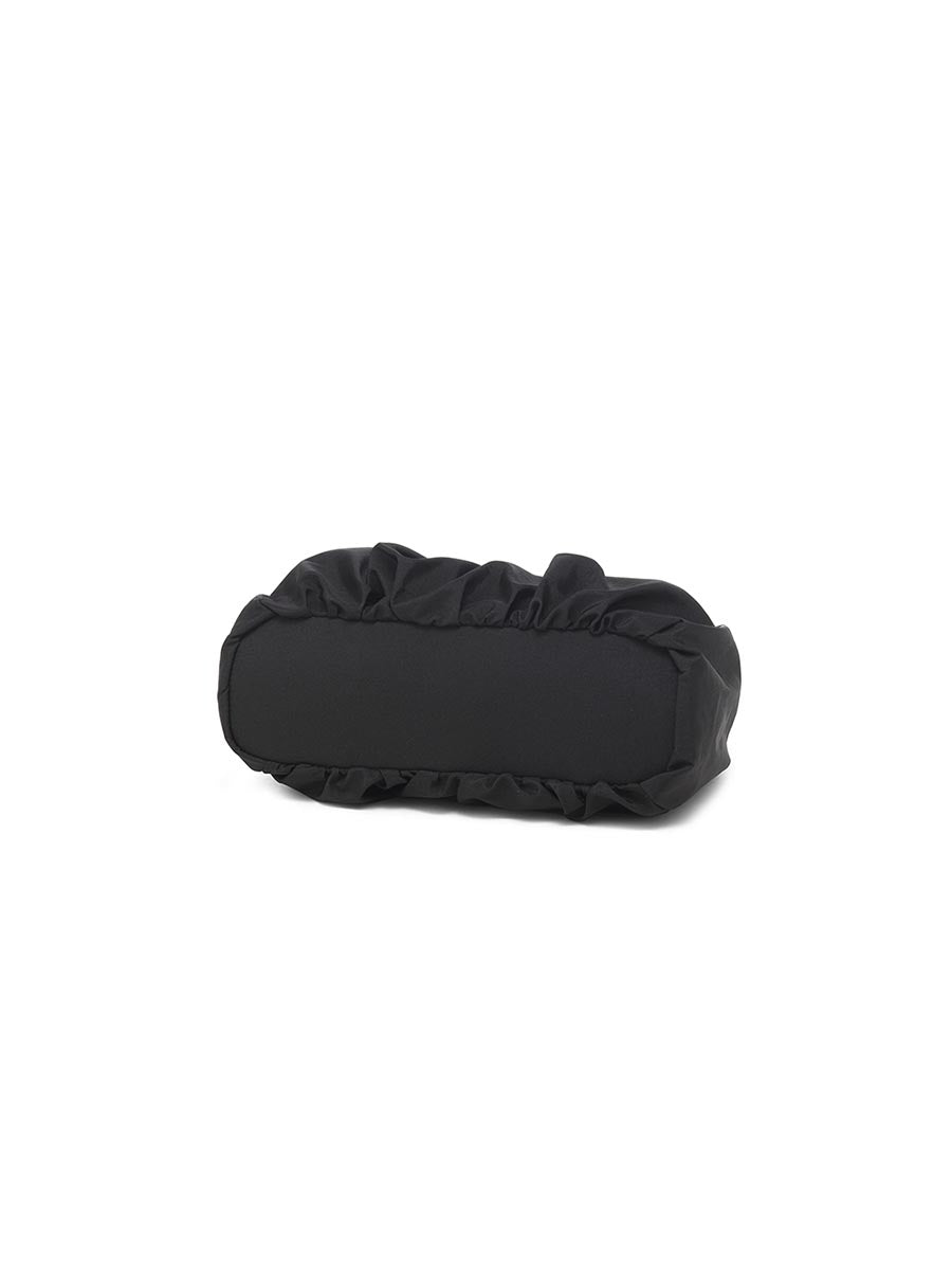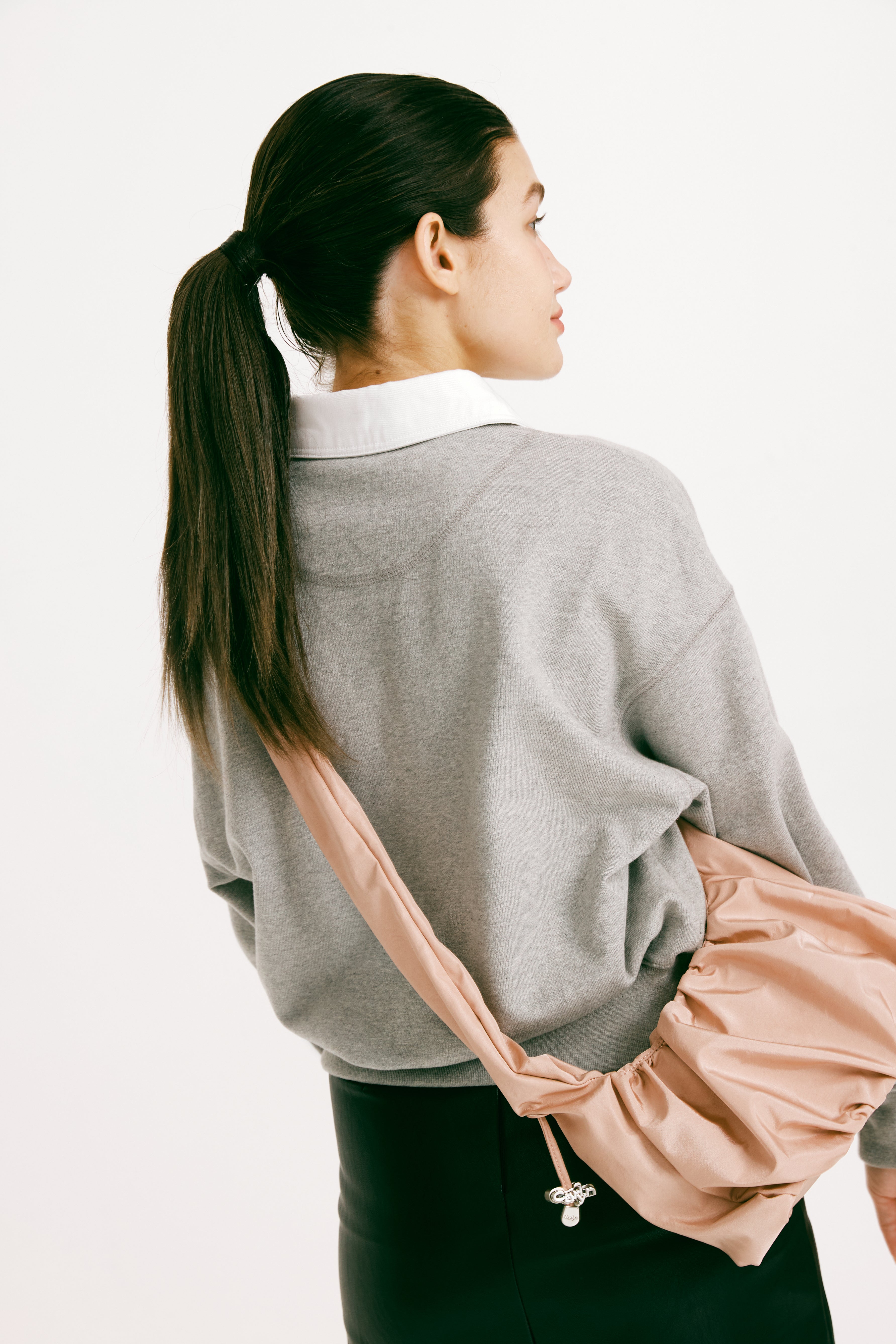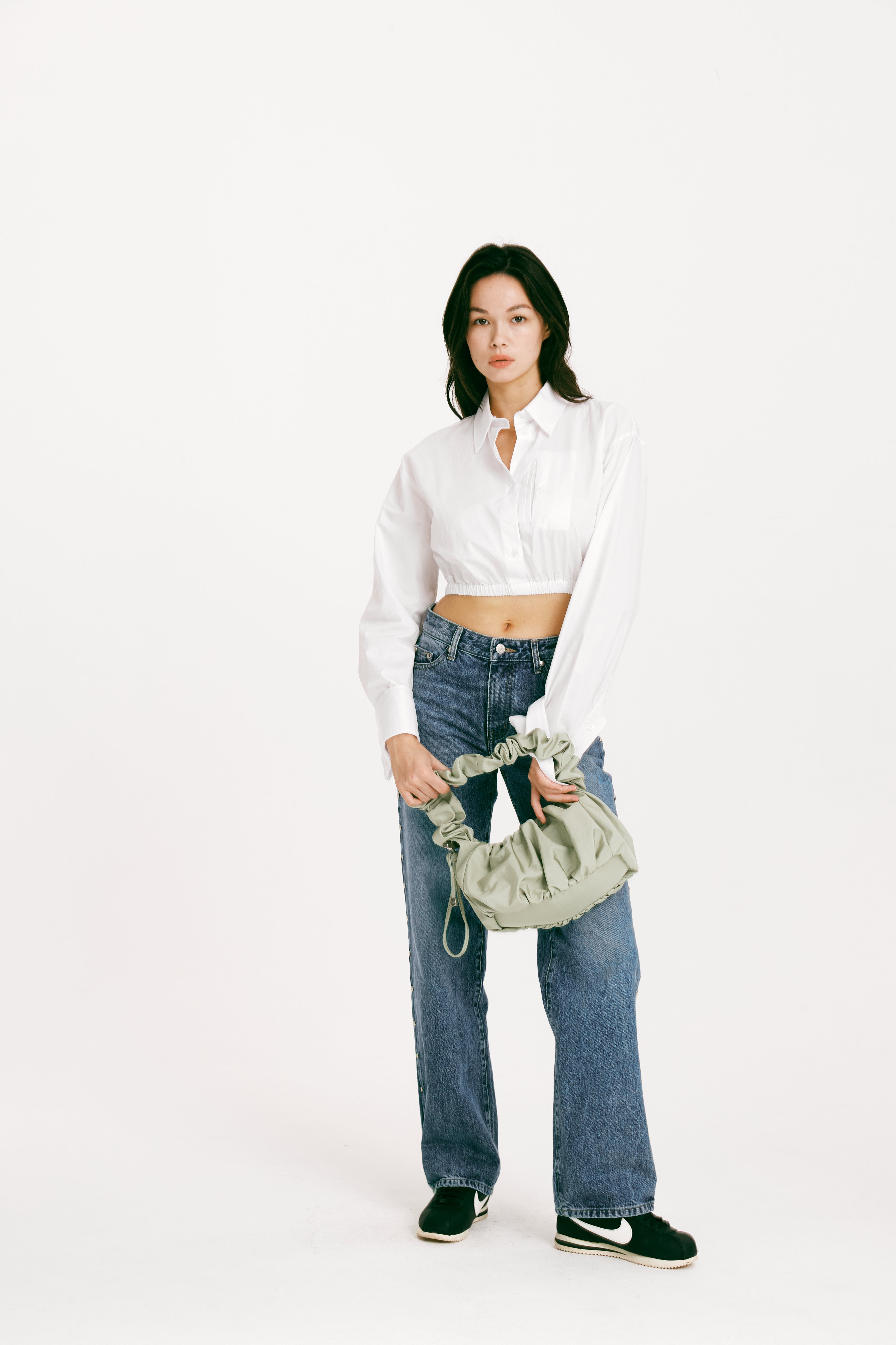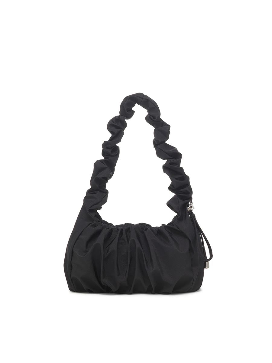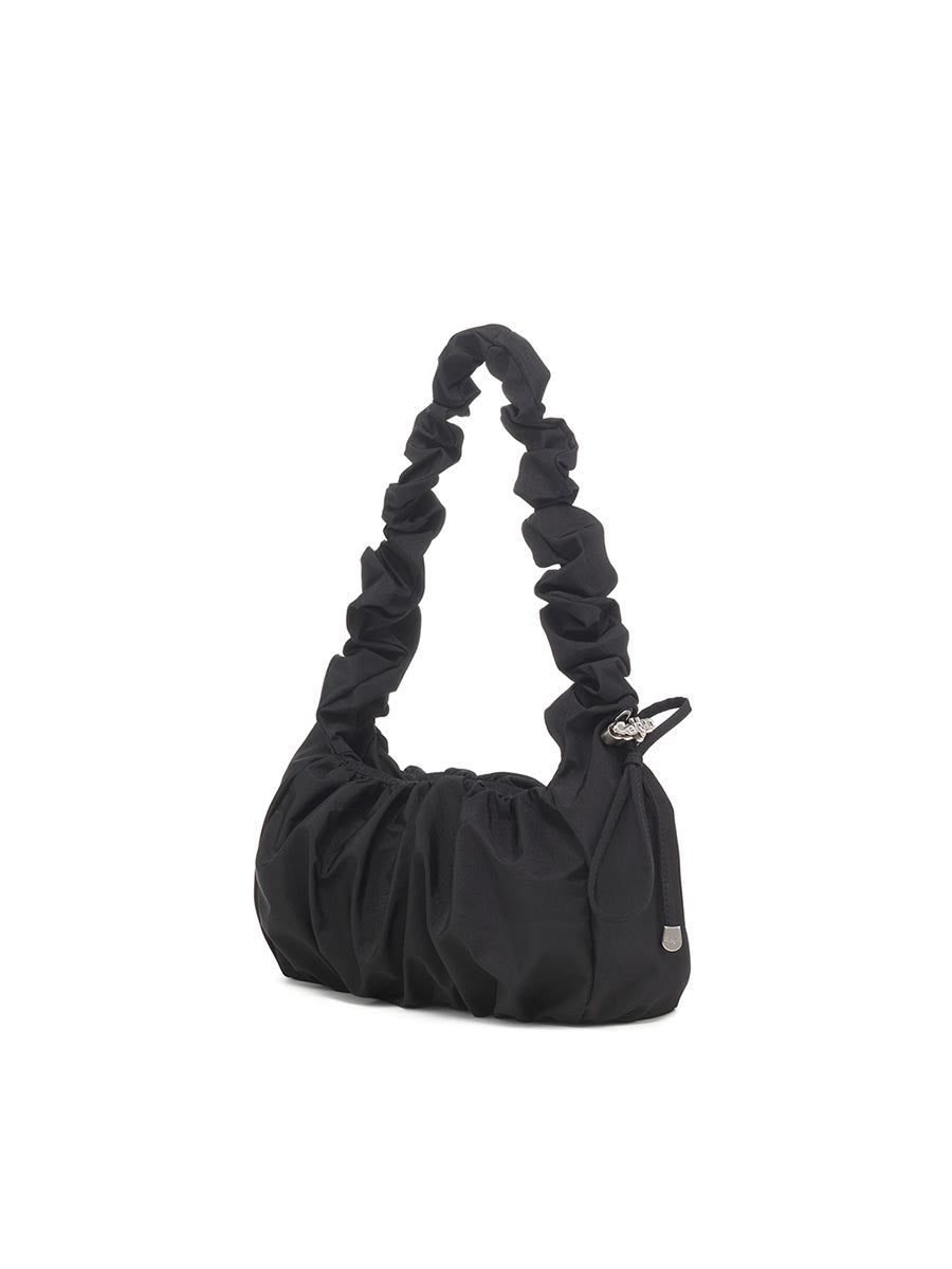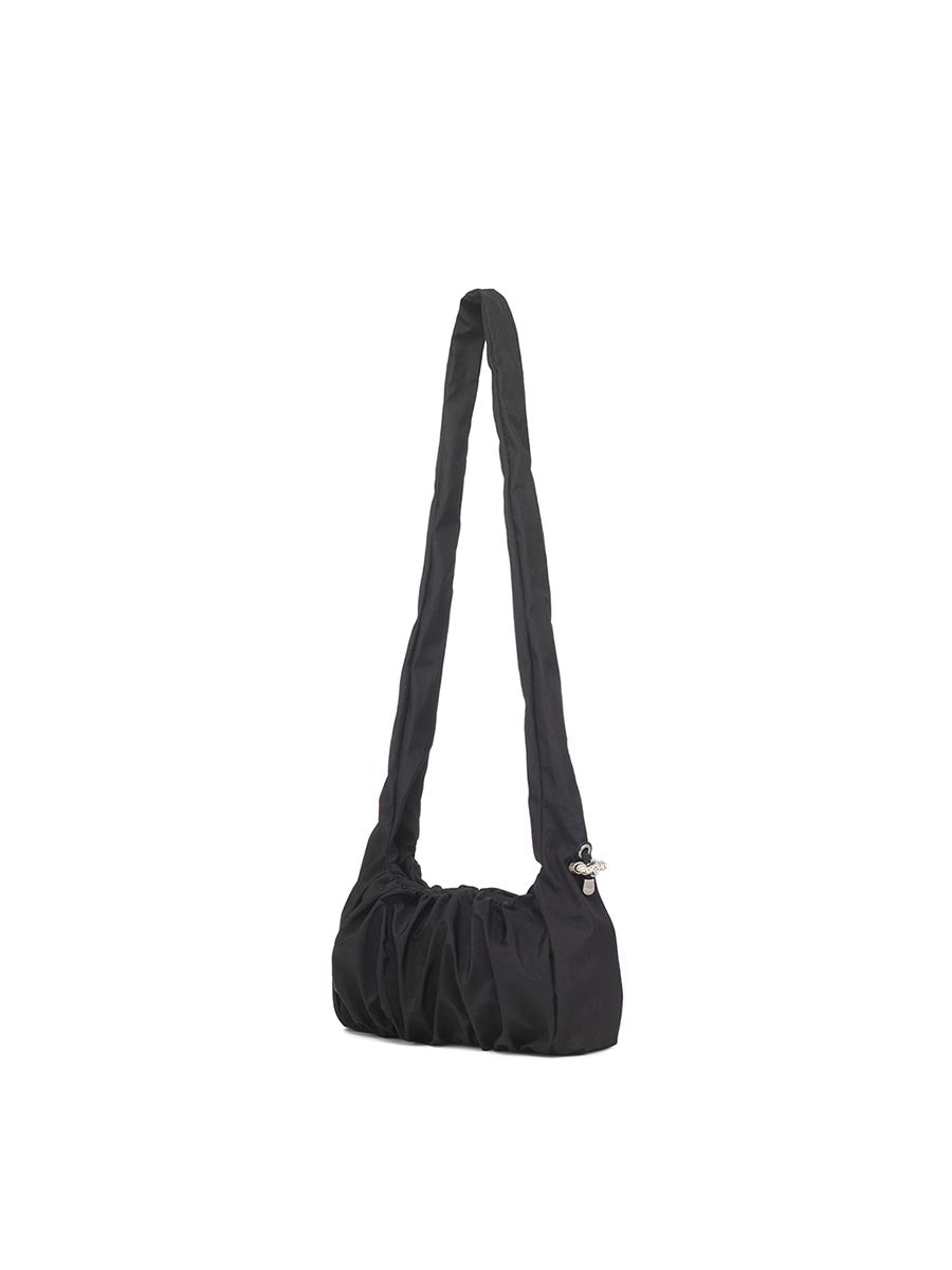 A meringue mini bag made of solid nylon fabric with a subtle linkle. Compared to the size, the strap can be adjusted to the desired length with the newly developed carlyn logo stopper with ample storage and shirring details. String bottom collin tip decorative details. 1 open pocket inside, 1 zipper pocket.