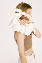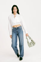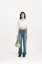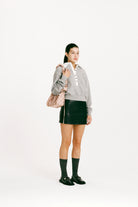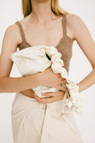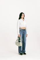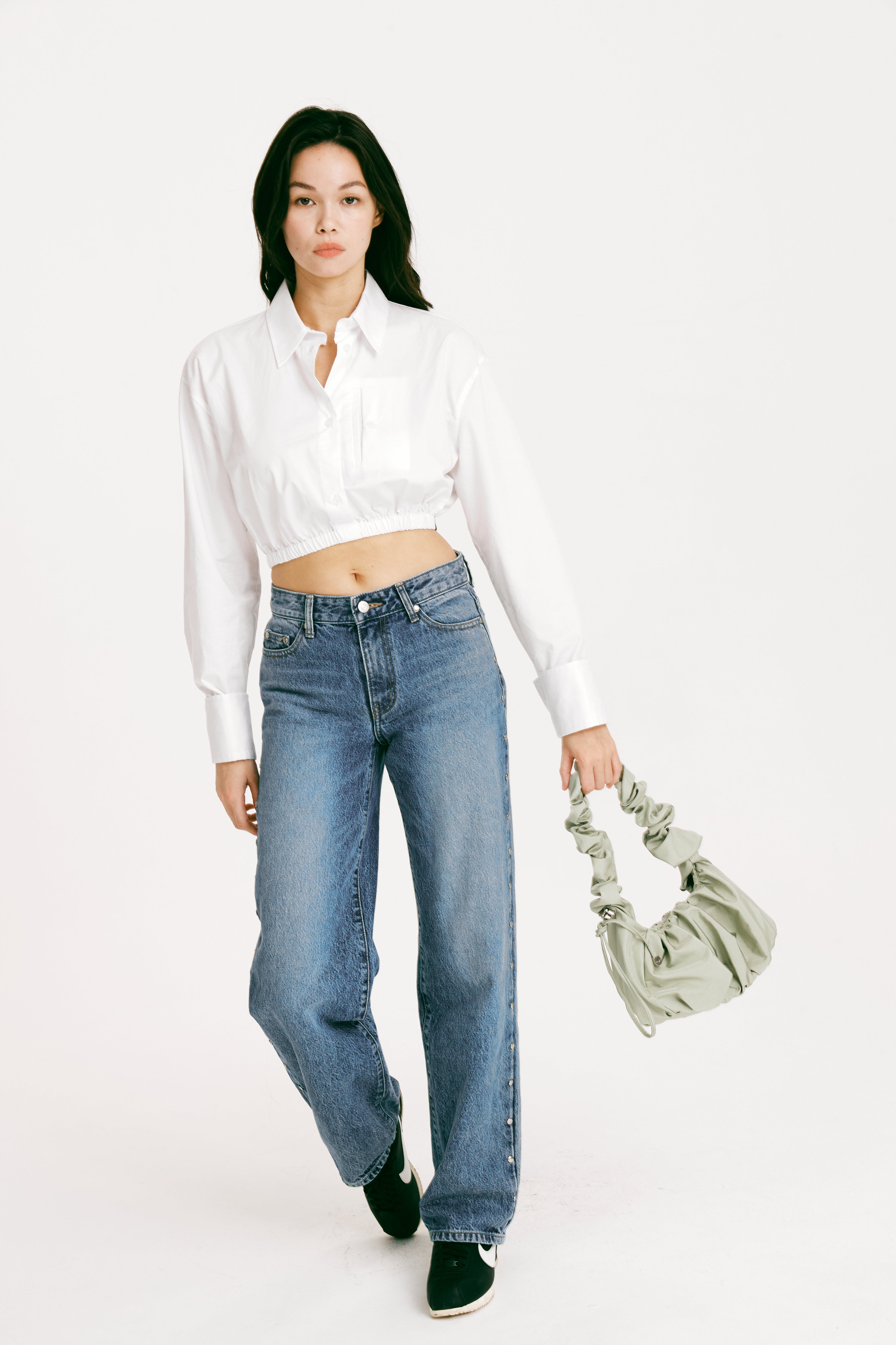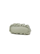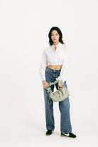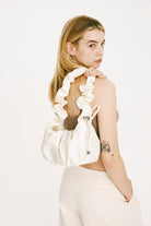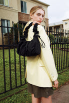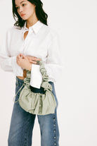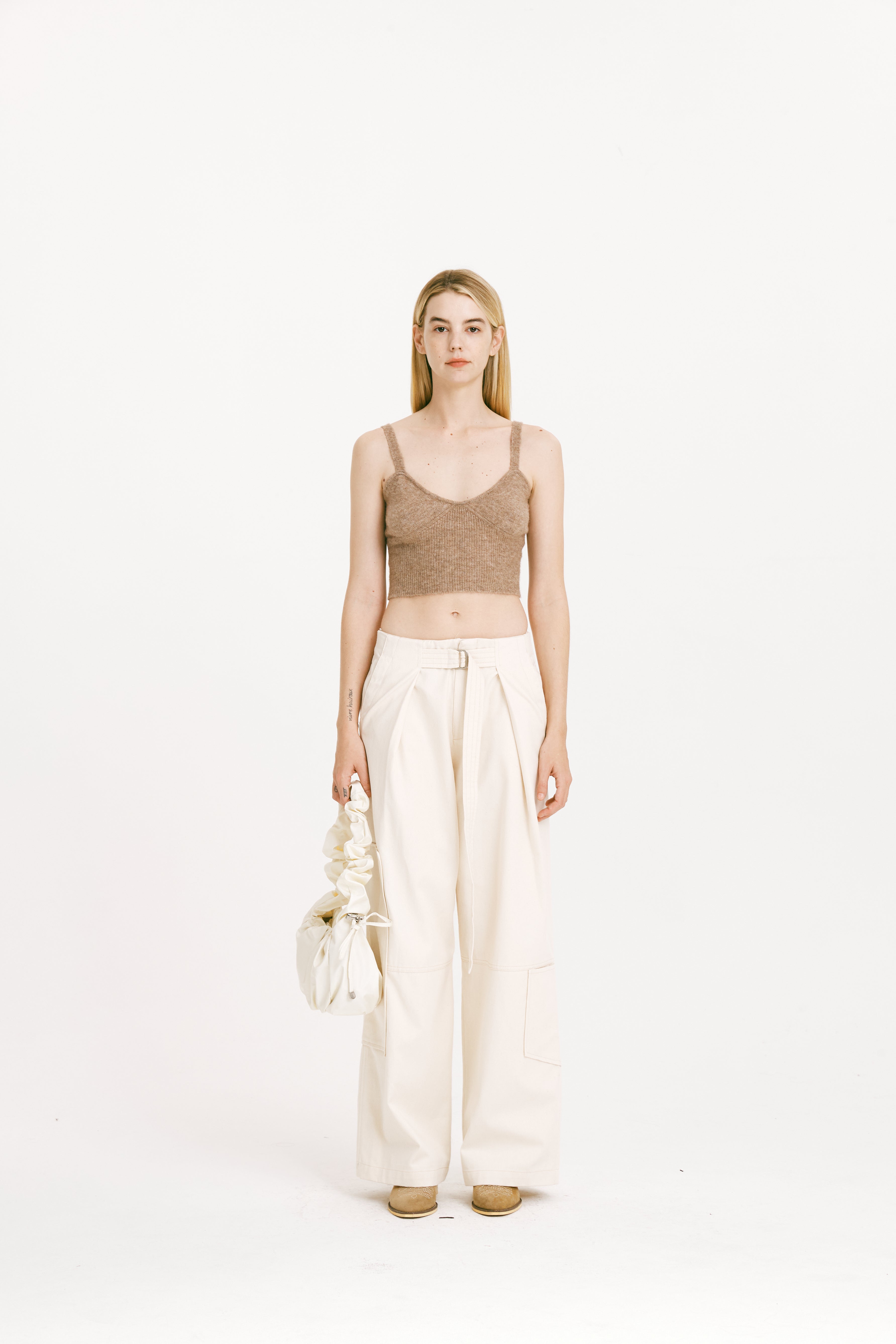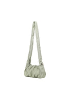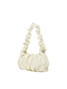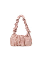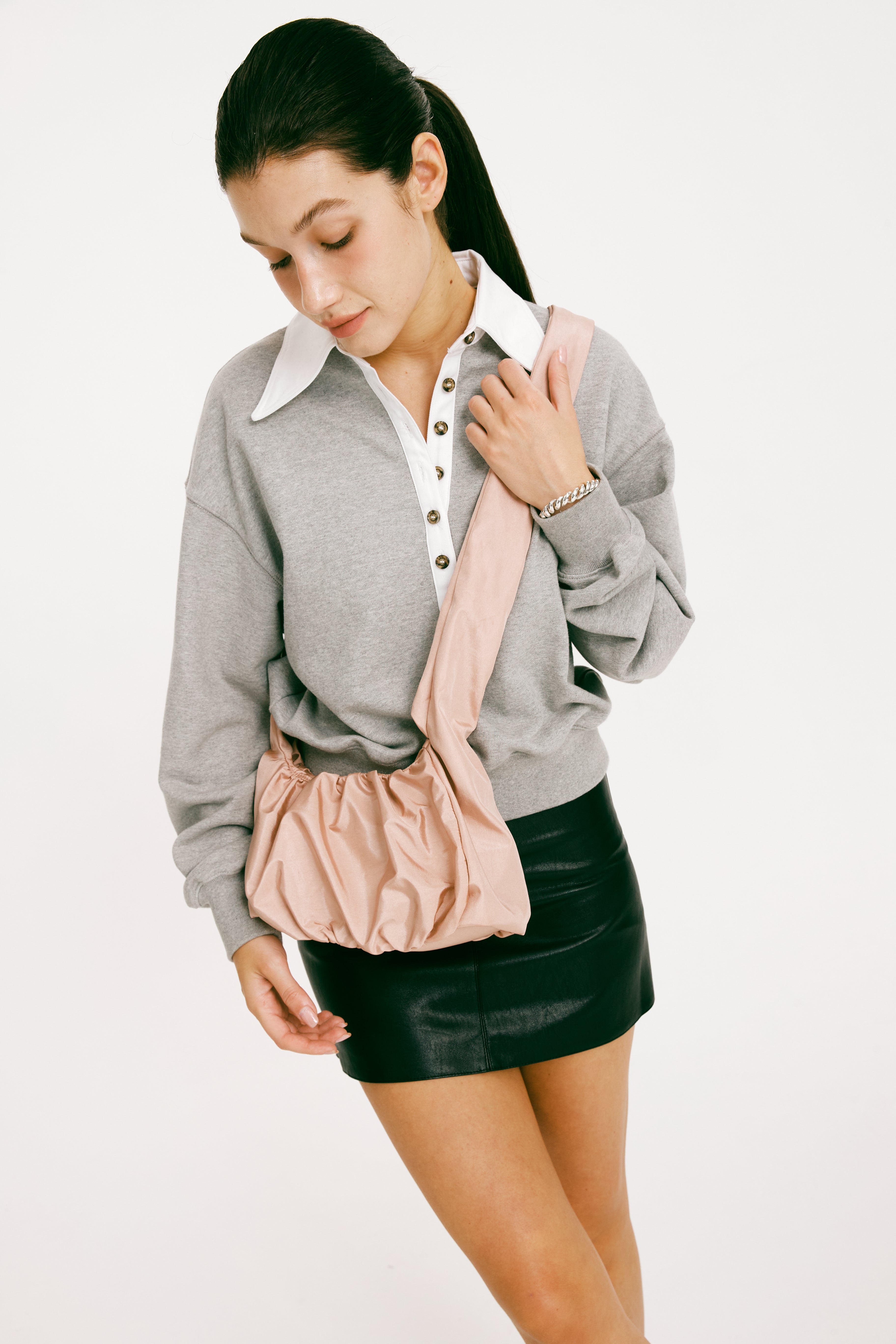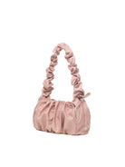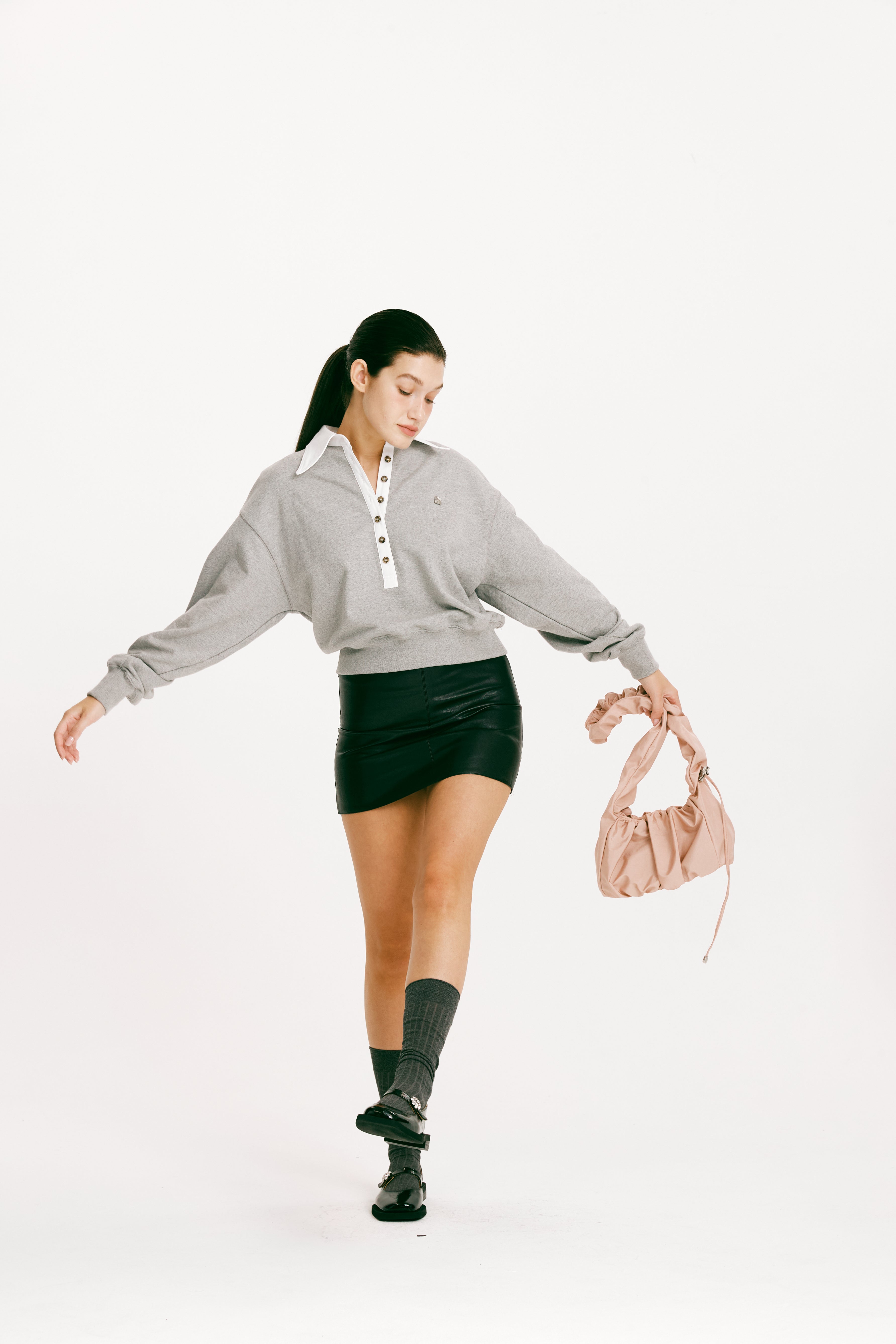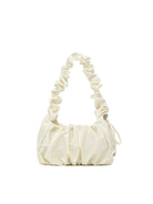 A meringue mini bag made of solid nylon fabric with a subtle linkle. Compared to the size, the strap can be adjusted to the desired length with the newly developed carlyn logo stopper with ample storage and shirring details. String bottom collin tip decorative details. 1 open pocket inside, 1 zipper pocket.