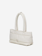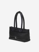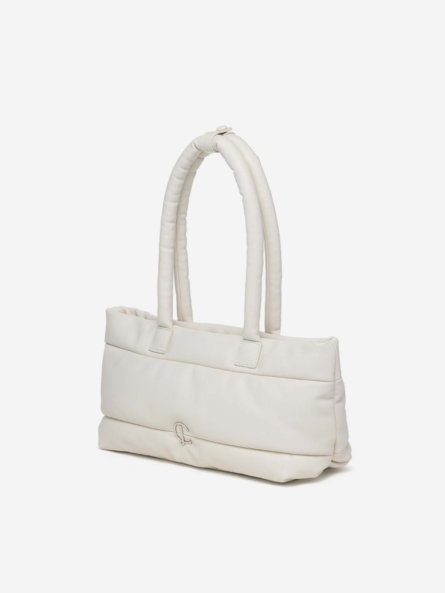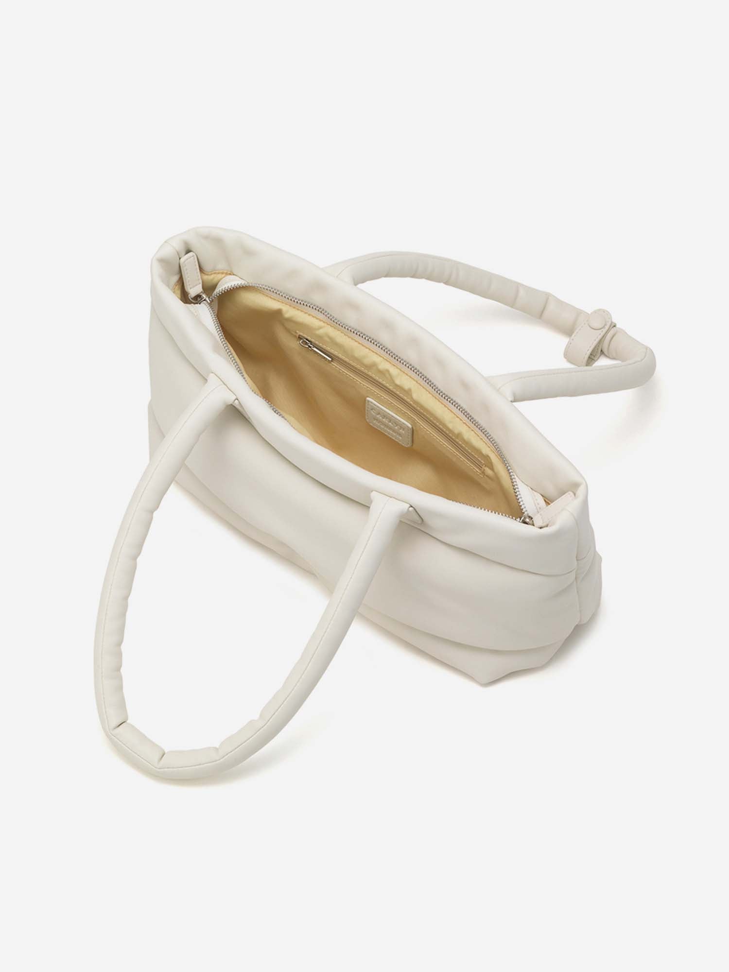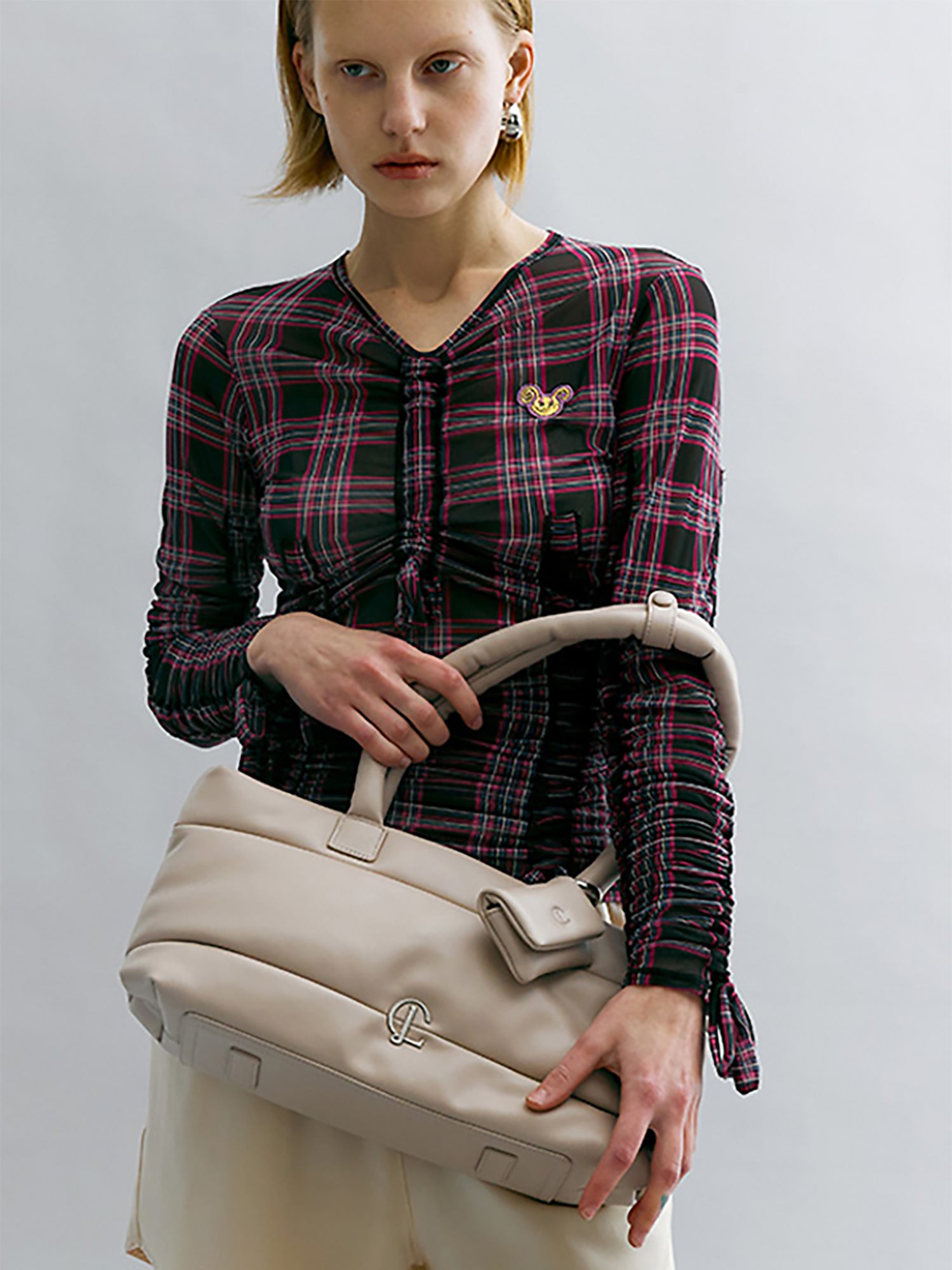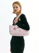 With its plush, voluminous silhouette, this bag delivers a soft and cozy aesthetic. The padded handles provide a comfortable shoulder fit, while the signature emblem hardware on the front adds a stylish accent.