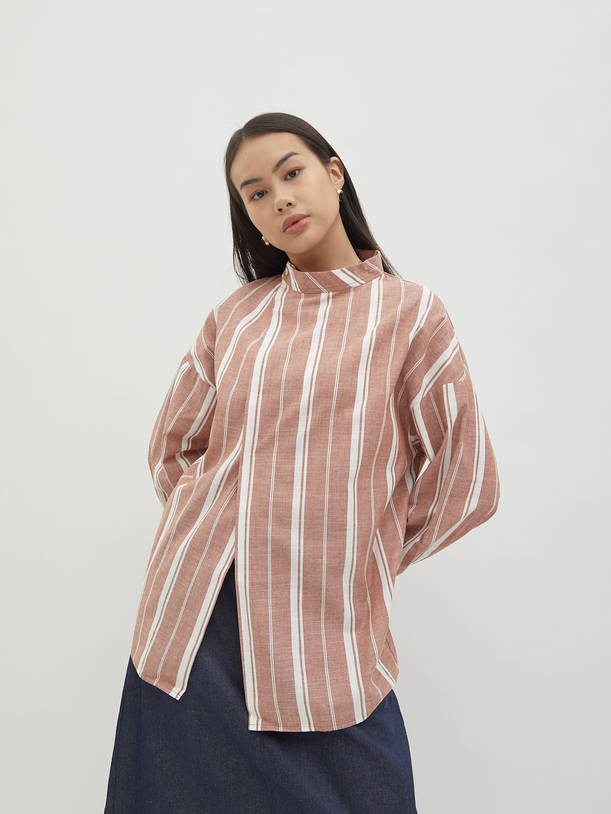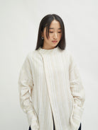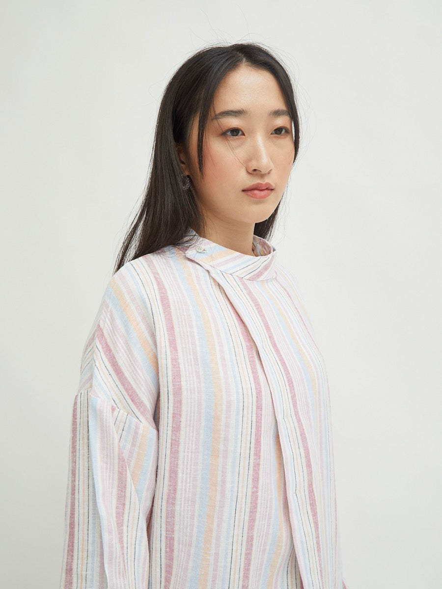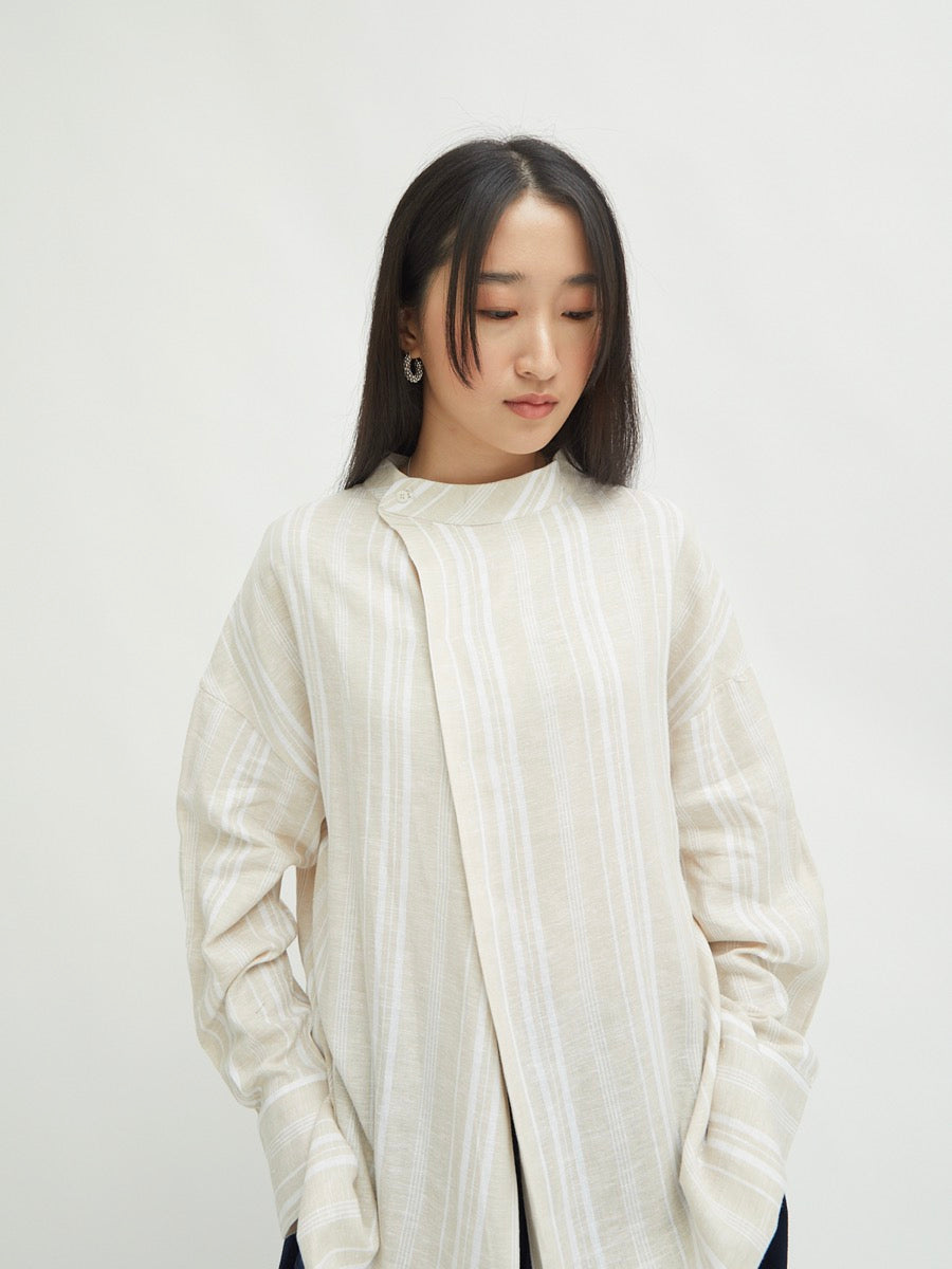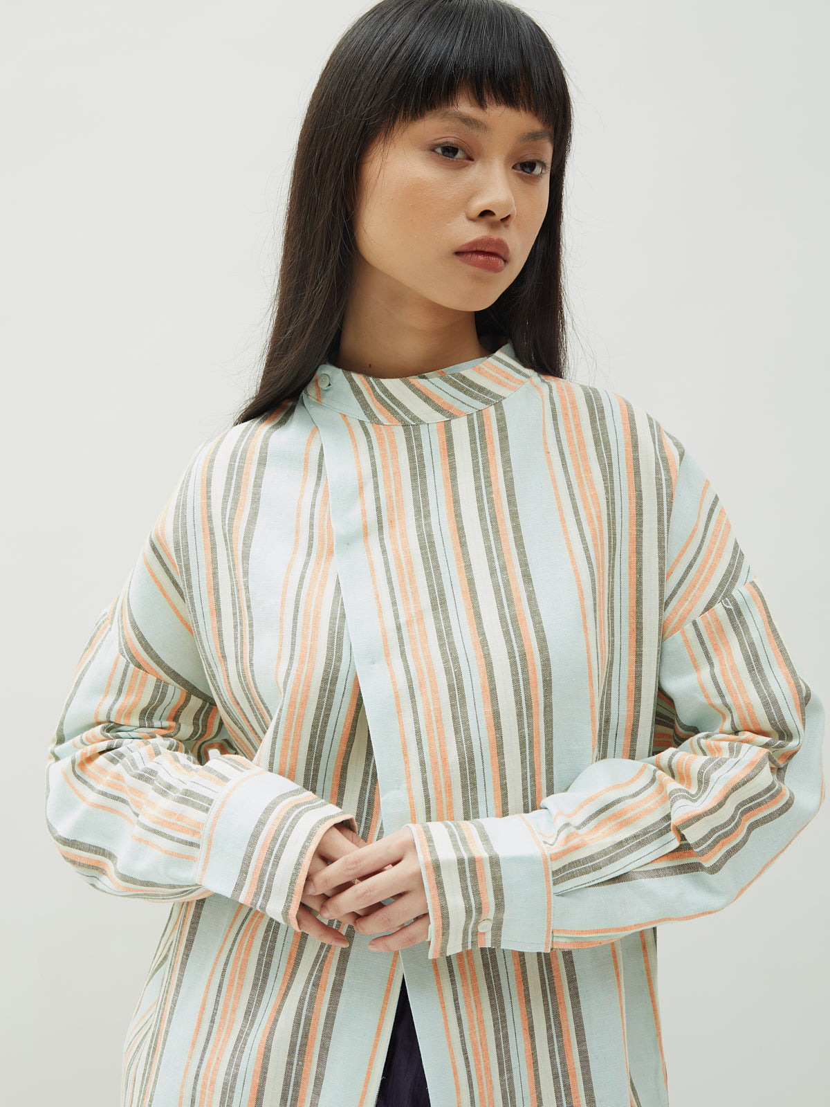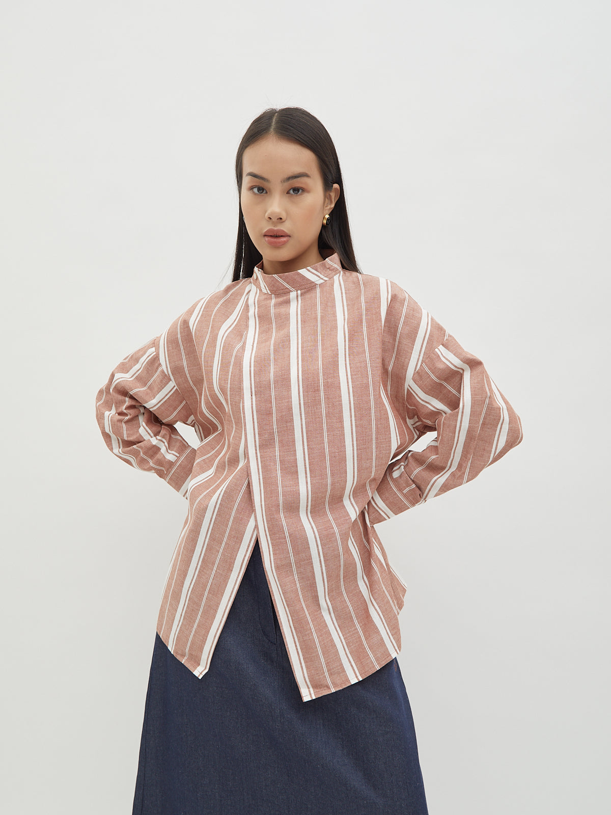 Atasan wanita lengan panjang ini didesain dengan kerah model mandarin. Memiliki kancing klip di bagian depan dan dengan detail yang asimetris. Bahannya halus dan ringan sehingga nyaman saat dipakai. Cocok dipakai untuk acara formal dan kasual.