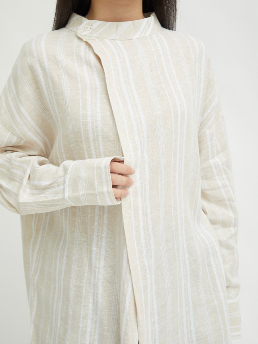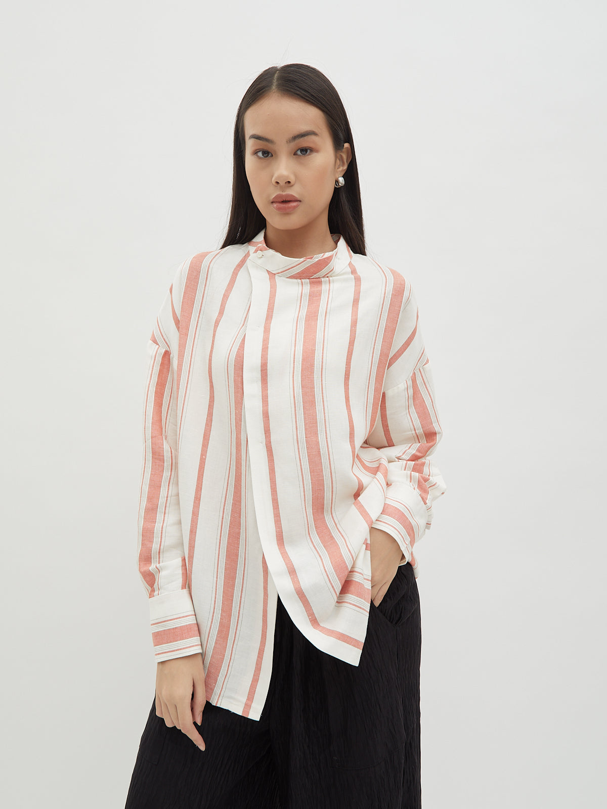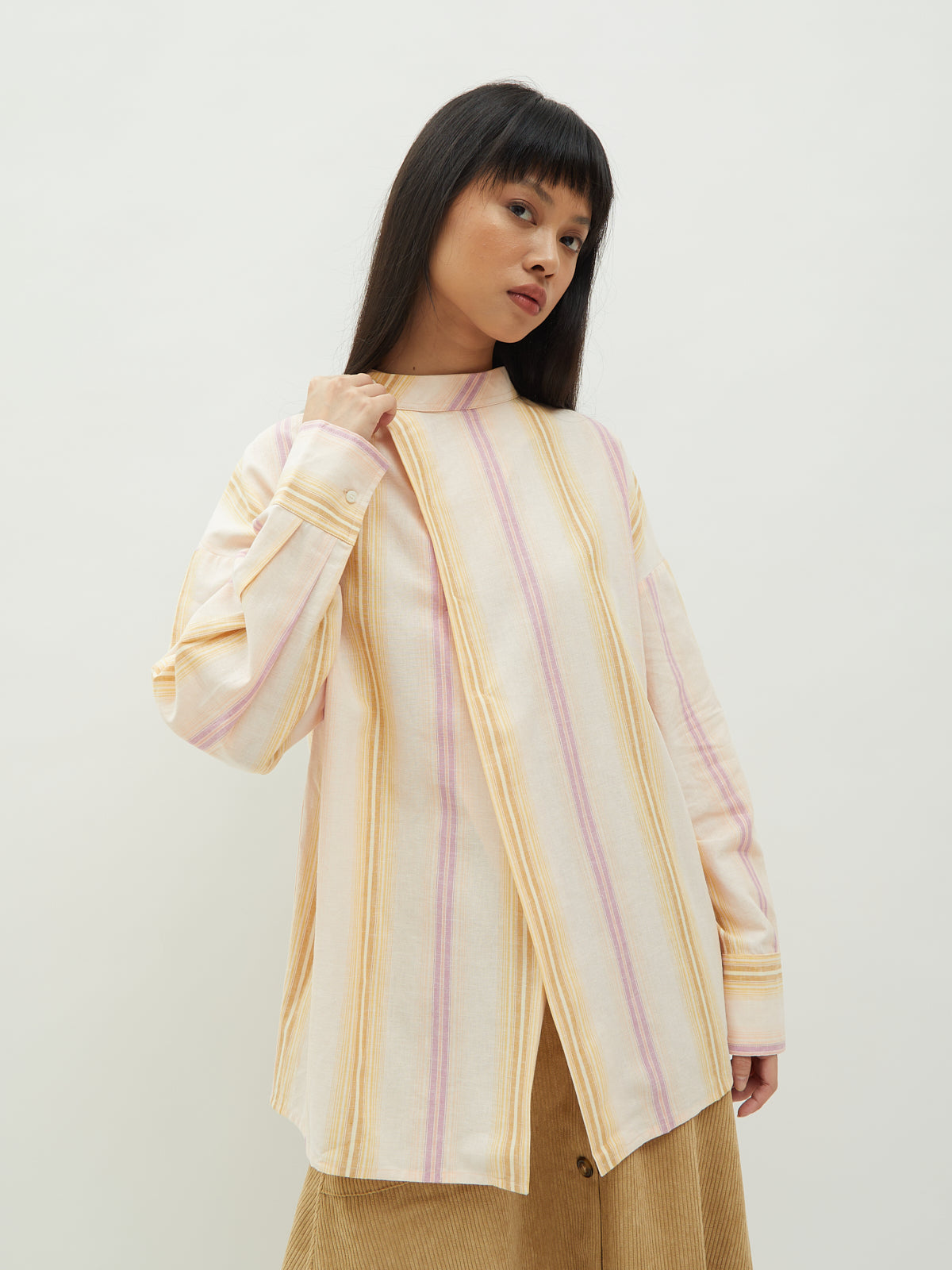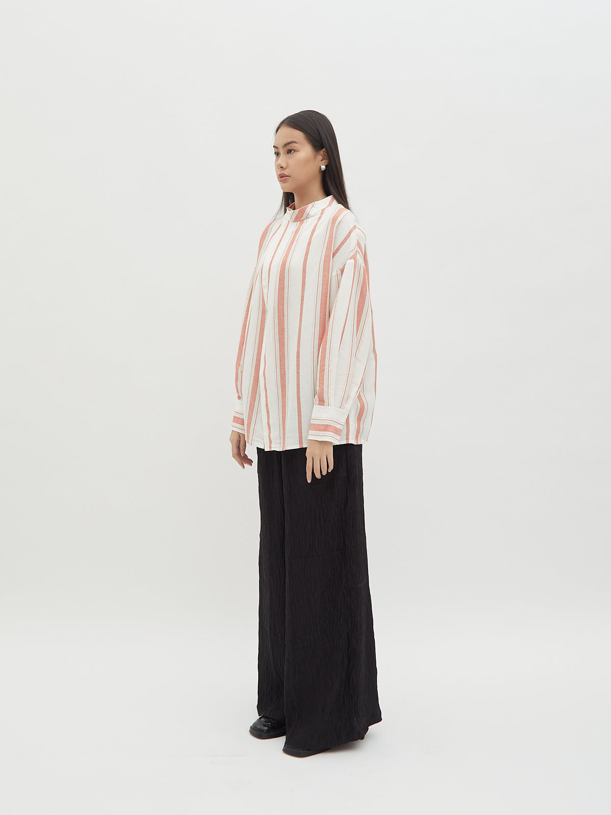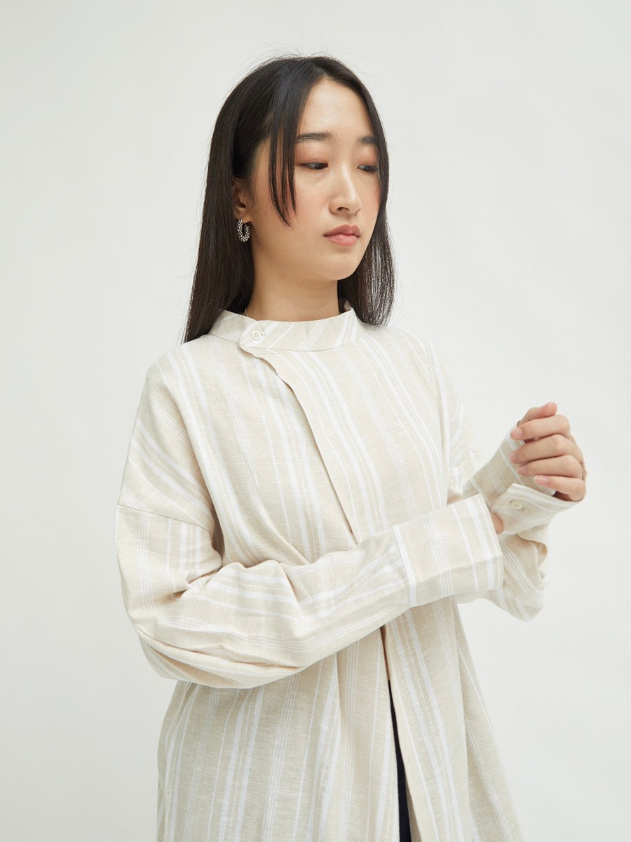 Atasan wanita lengan panjang ini didesain dengan kerah model mandarin. Memiliki kancing klip di bagian depan dan dengan detail yang asimetris. Bahannya halus dan ringan sehingga nyaman saat dipakai. Cocok dipakai untuk acara formal dan kasual.