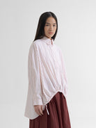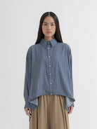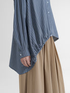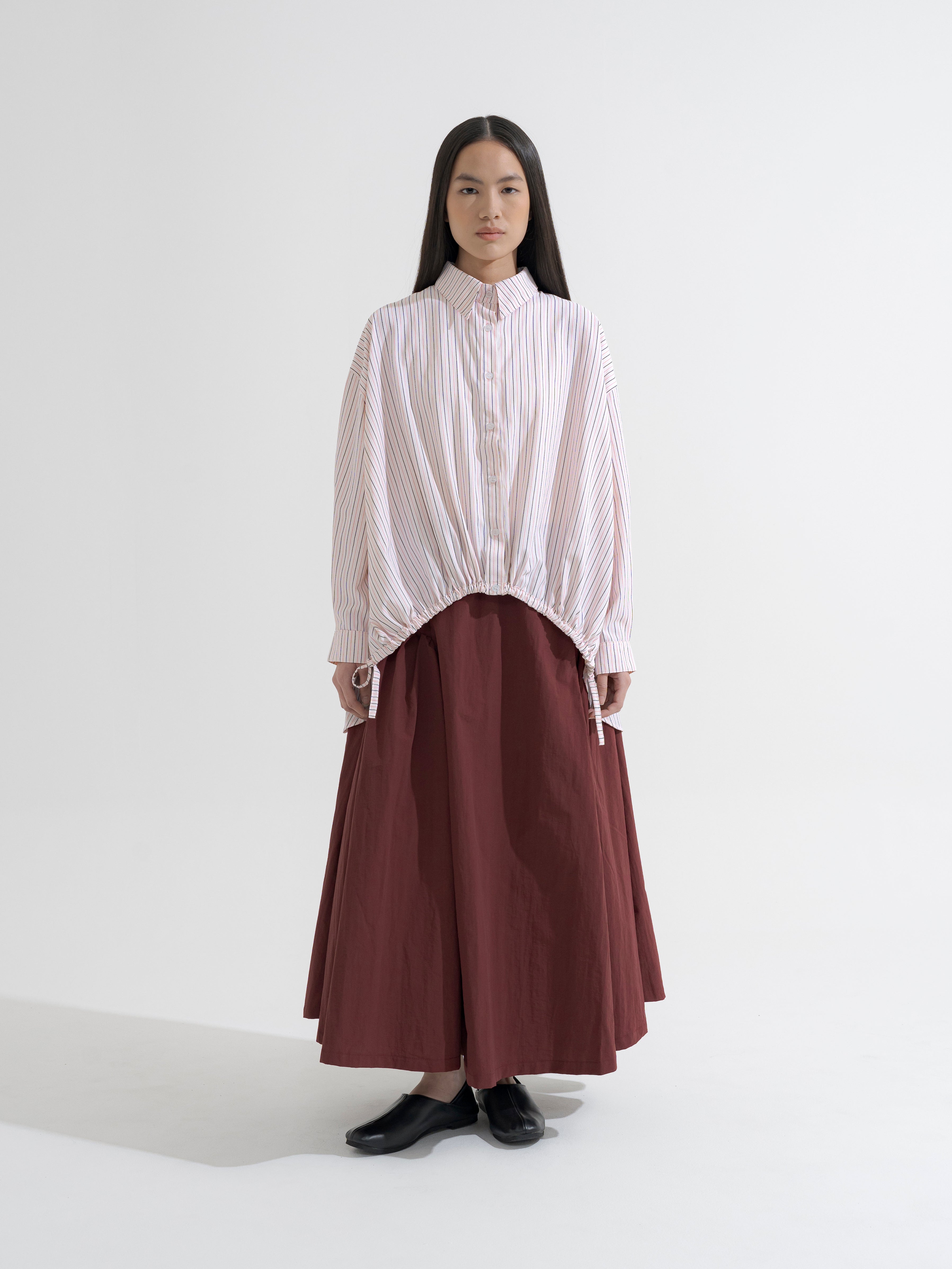 Kemeja lengan panjang dengan detail tali serut di bagian bawah yang bisa disesuaikan bentuknya. Potongan bagian belakang lebih panjang, memberikan siluet unik dan nyaman. Model longgar, cocok untuk gaya santai maupun semi-formal. Terbuat dari bahan ringan dan adem, ideal untuk aktivitas sehari-hari.