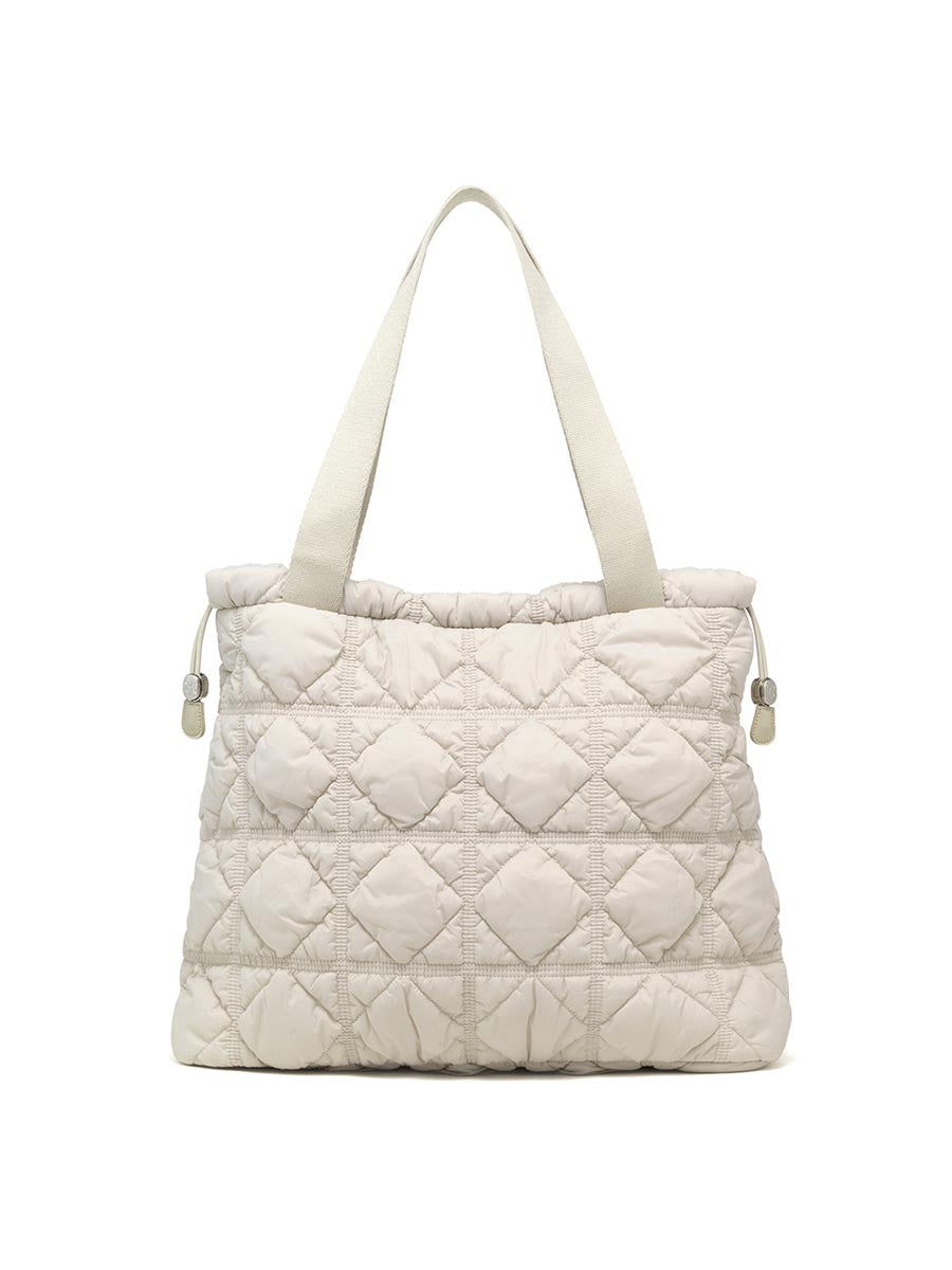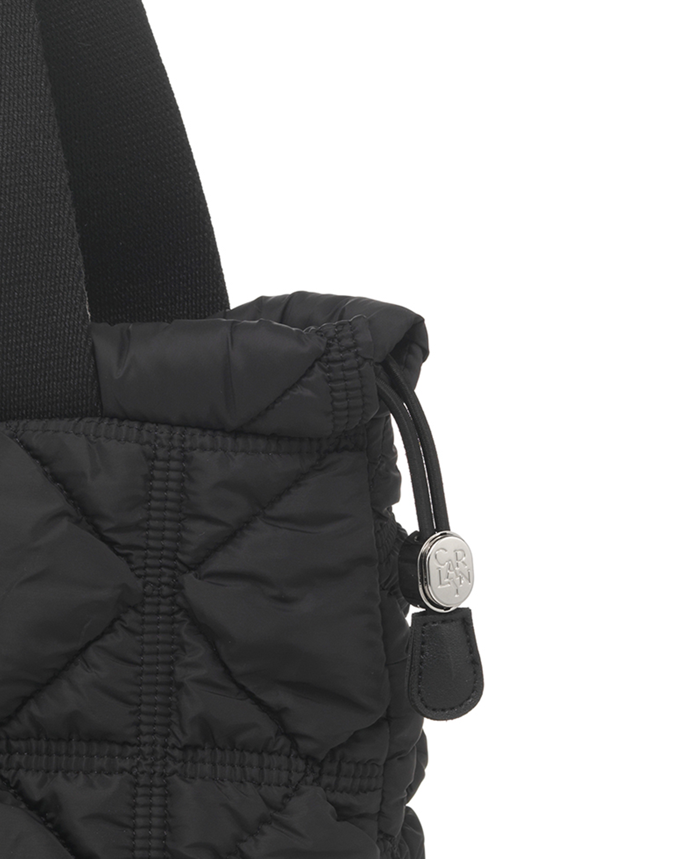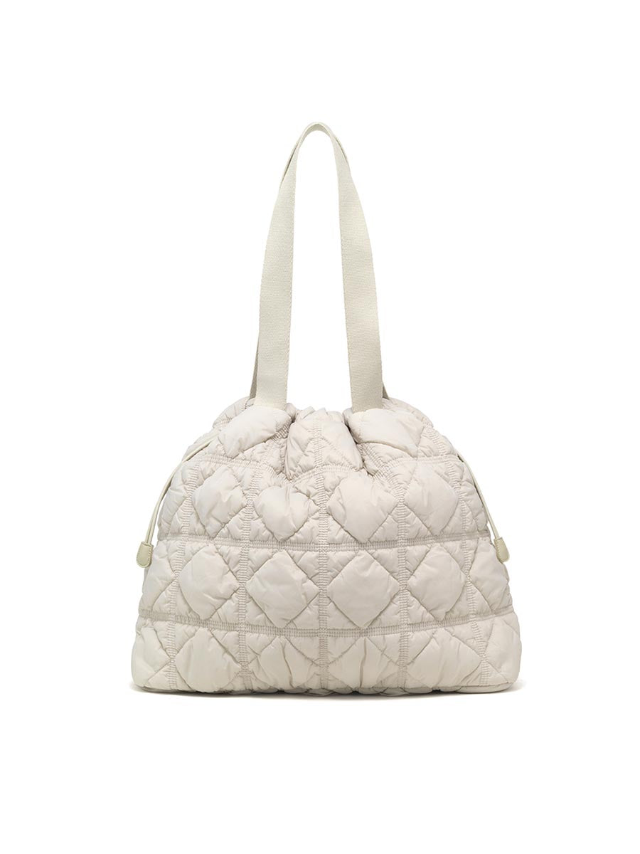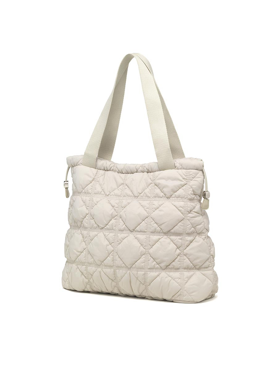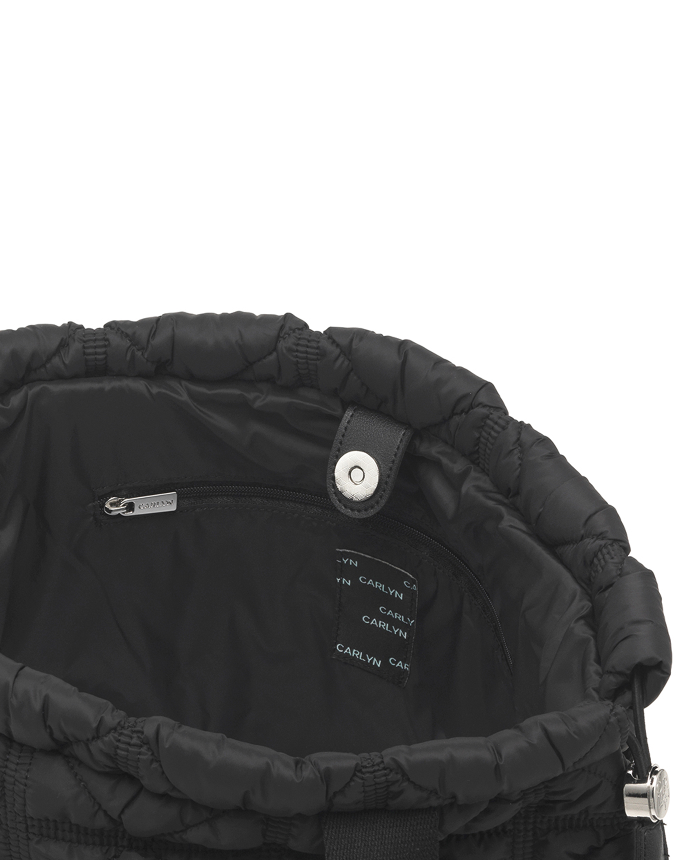 WEEKENDER BAG for storing large amounts of belongings. Carlyn unique quilting pattern made of tension thread. A light and soft silhouette. Open closing by adjusting the top shape of the bag with a round stopper and minimiize floor sagging with reinforcing pads. 1 inner zipper pocket, 2 open pockets.
