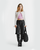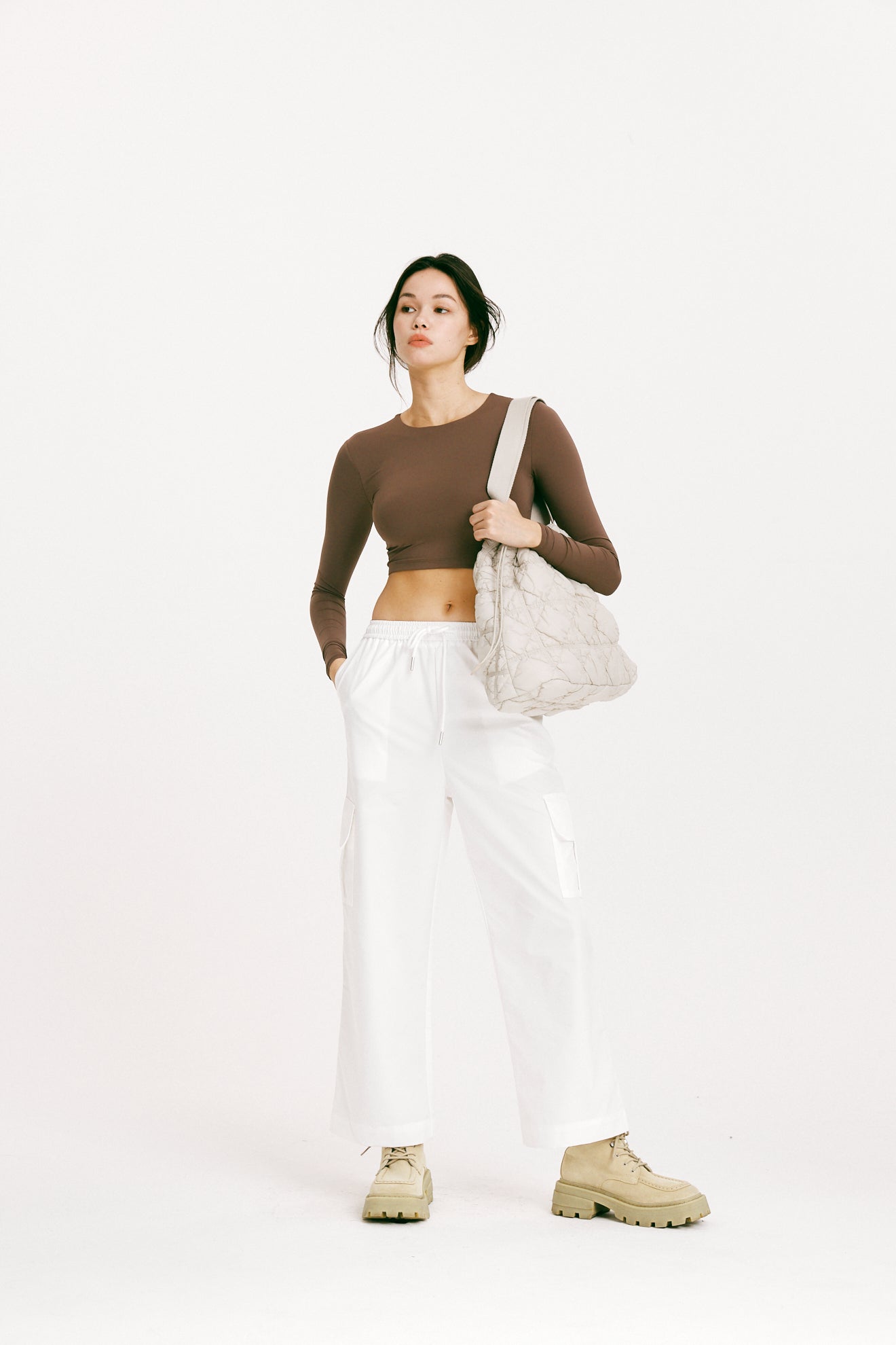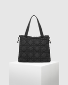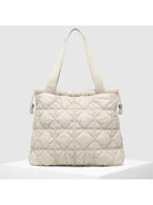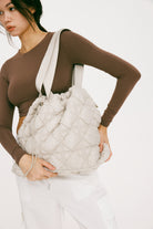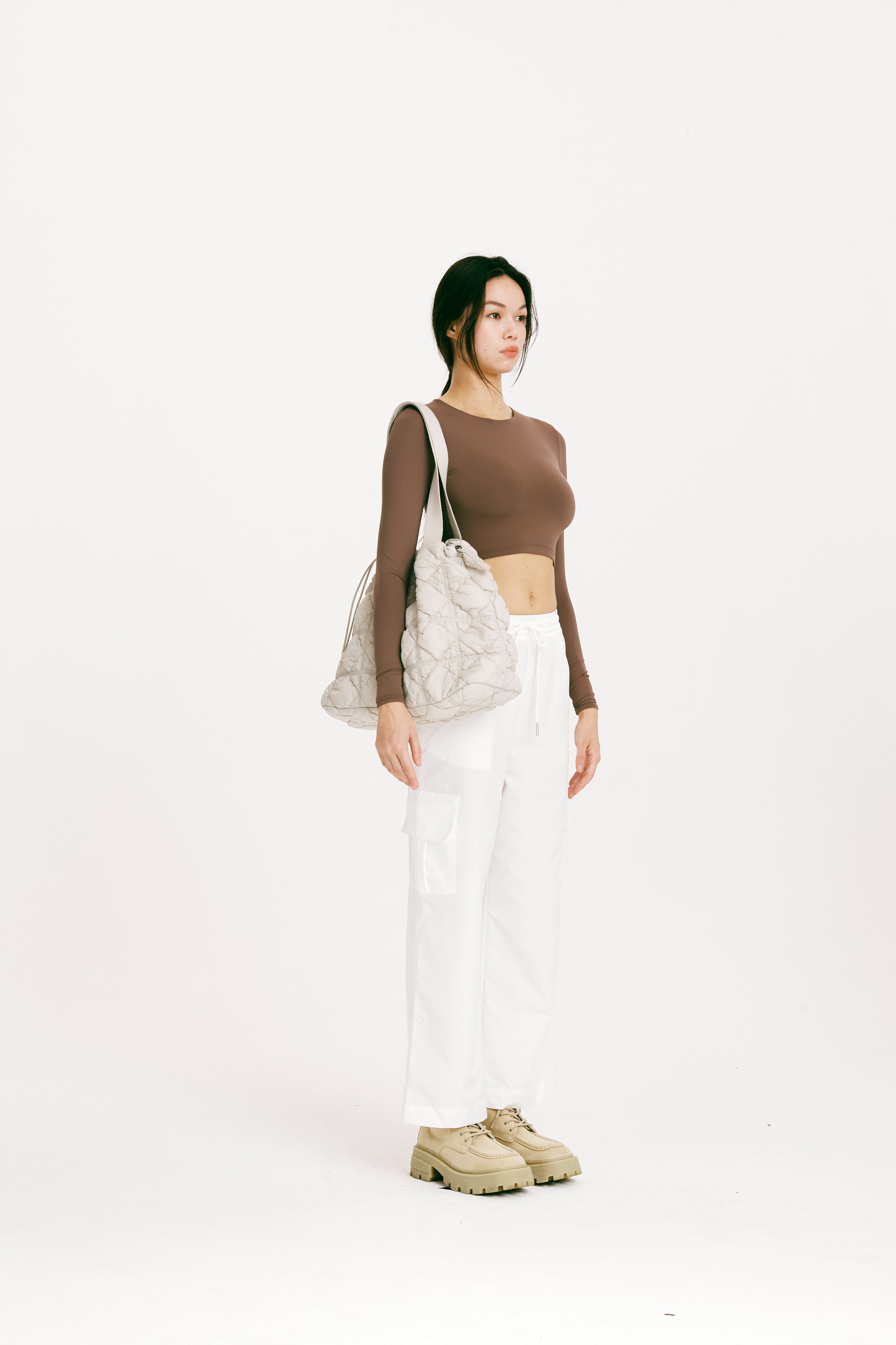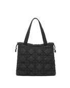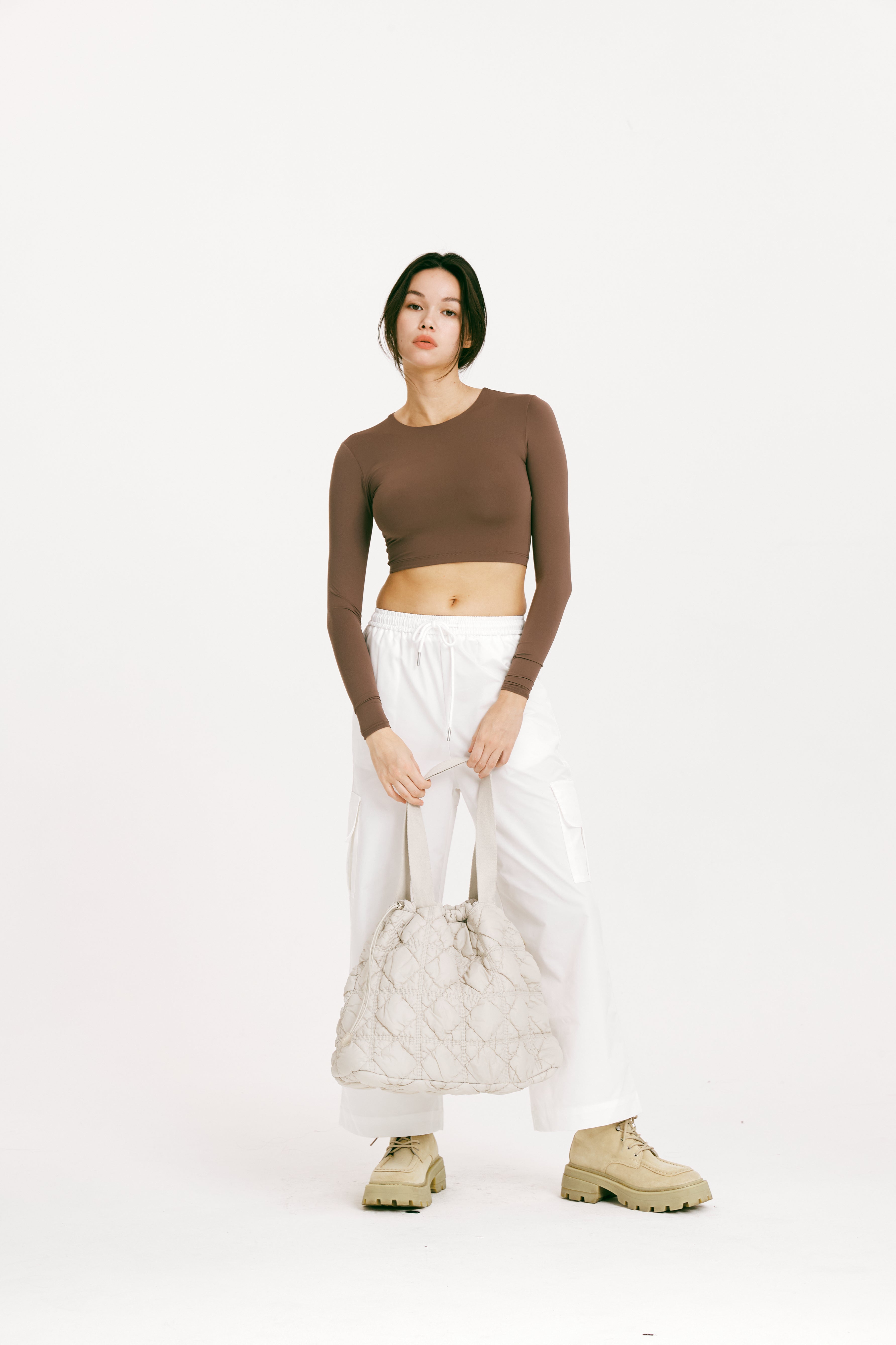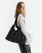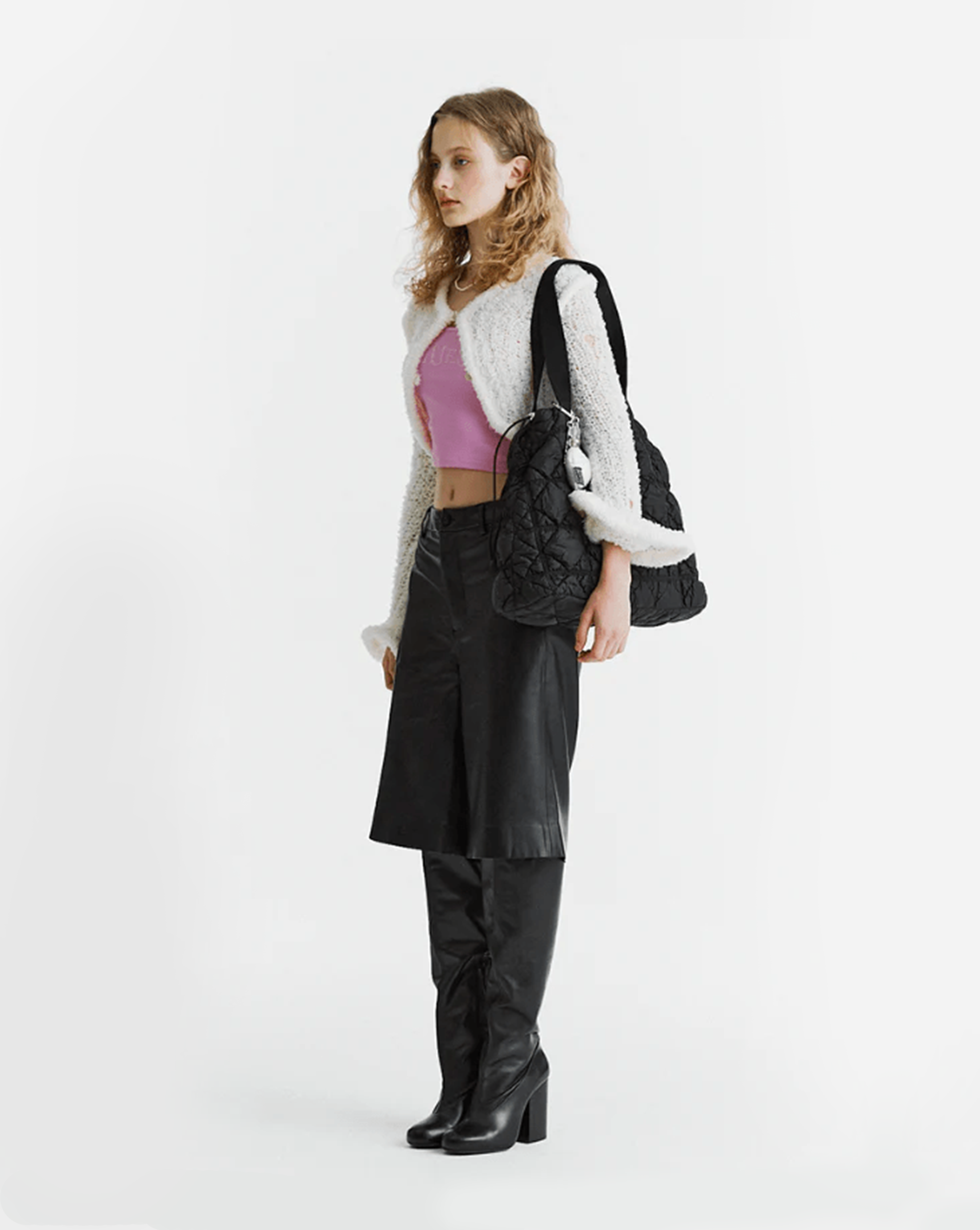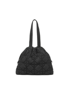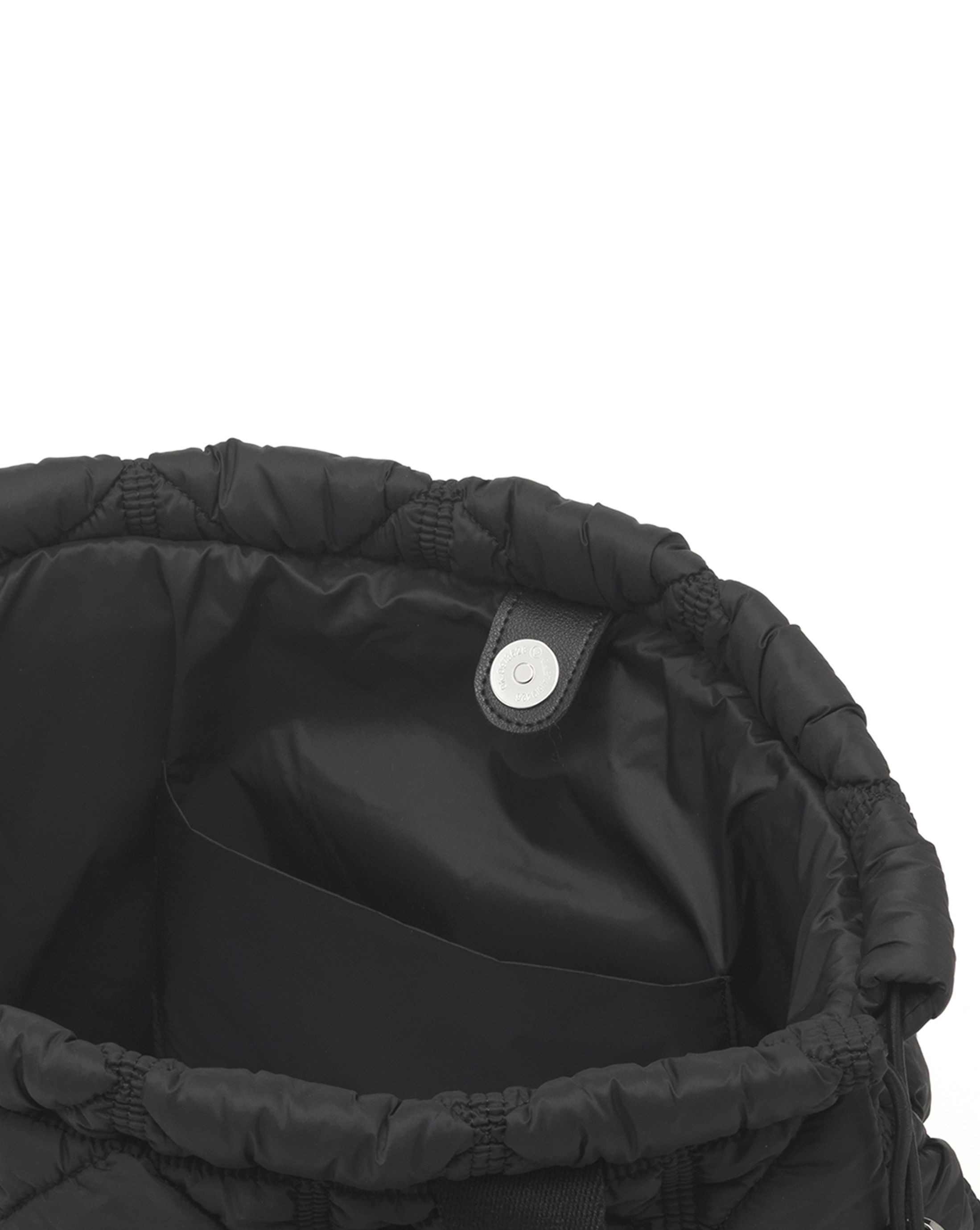 WEEKENDER BAG for storing large amounts of belongings. Carlyn unique quilting pattern made of tension thread. A light and soft silhouette. Open closing by adjusting the top shape of the bag with a round stopper and minimiize floor sagging with reinforcing pads. 1 inner zipper pocket, 2 open pockets.