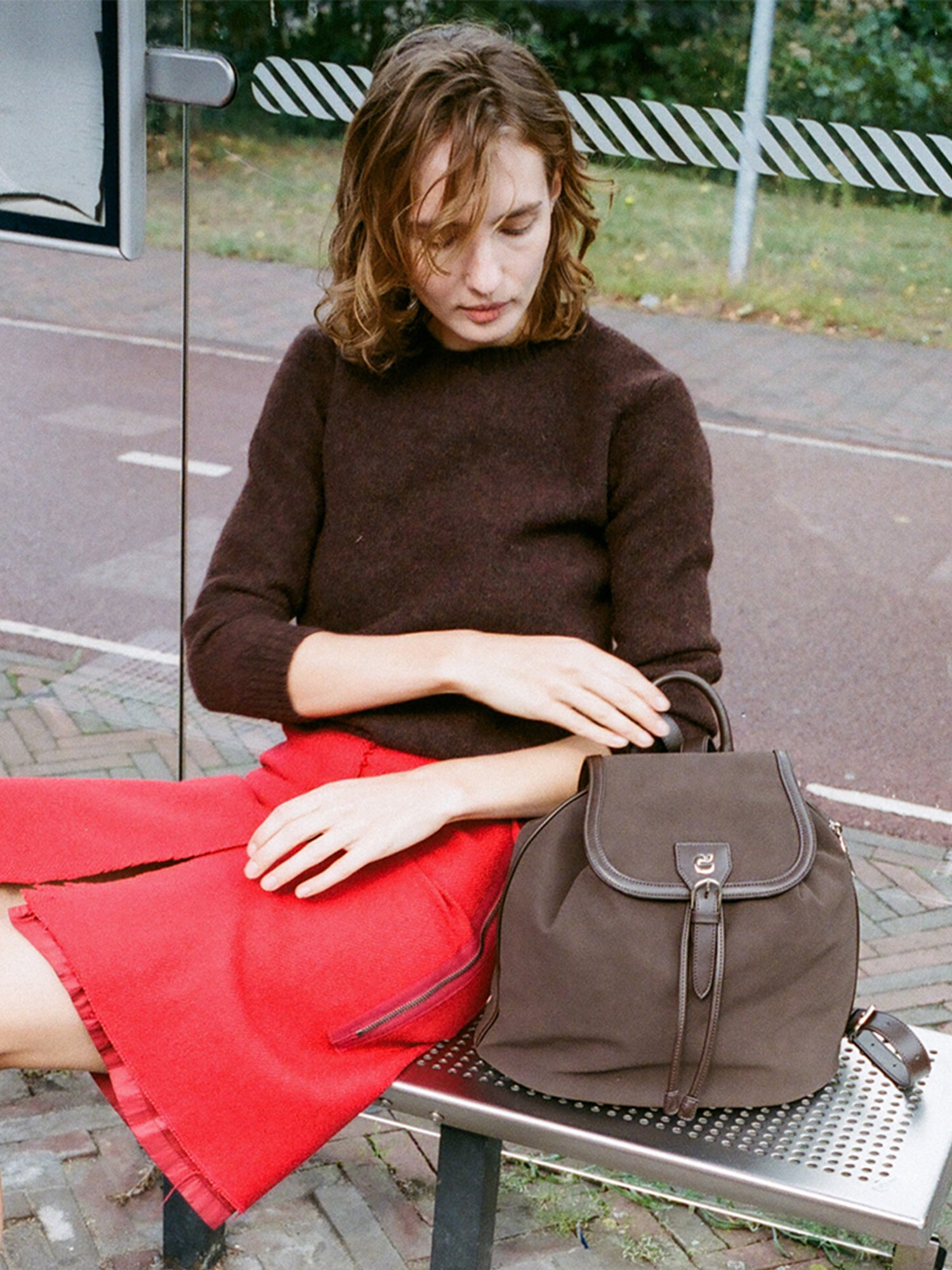 A refined backpack crafted with a soft suede-like finish, offering a warm and elegant take on the signature Lav silhouette. Designed with a drawstring closure and structured flap, this backpack balances everyday practicality with a polished look, perfect for daily use or casual city outings.