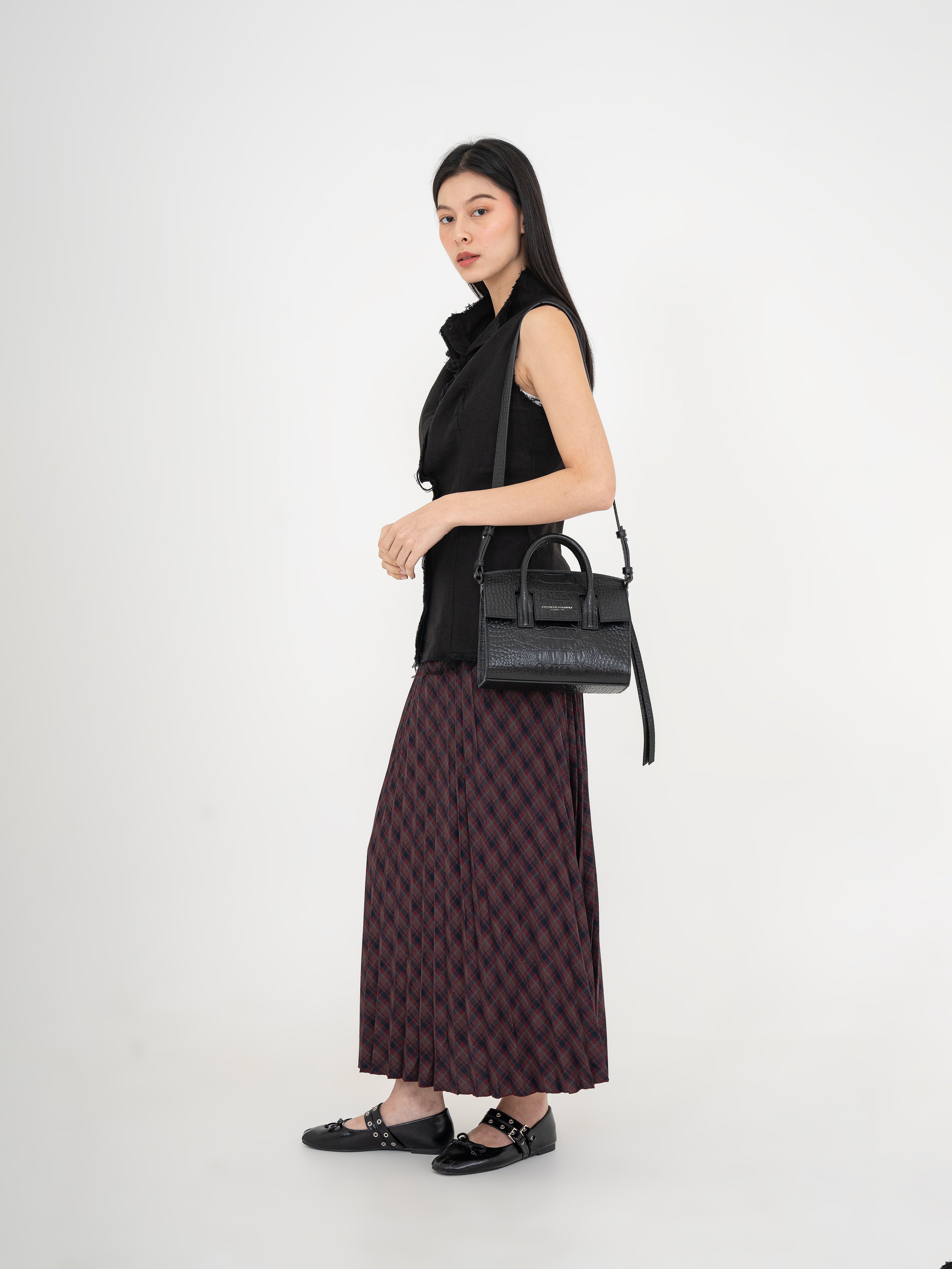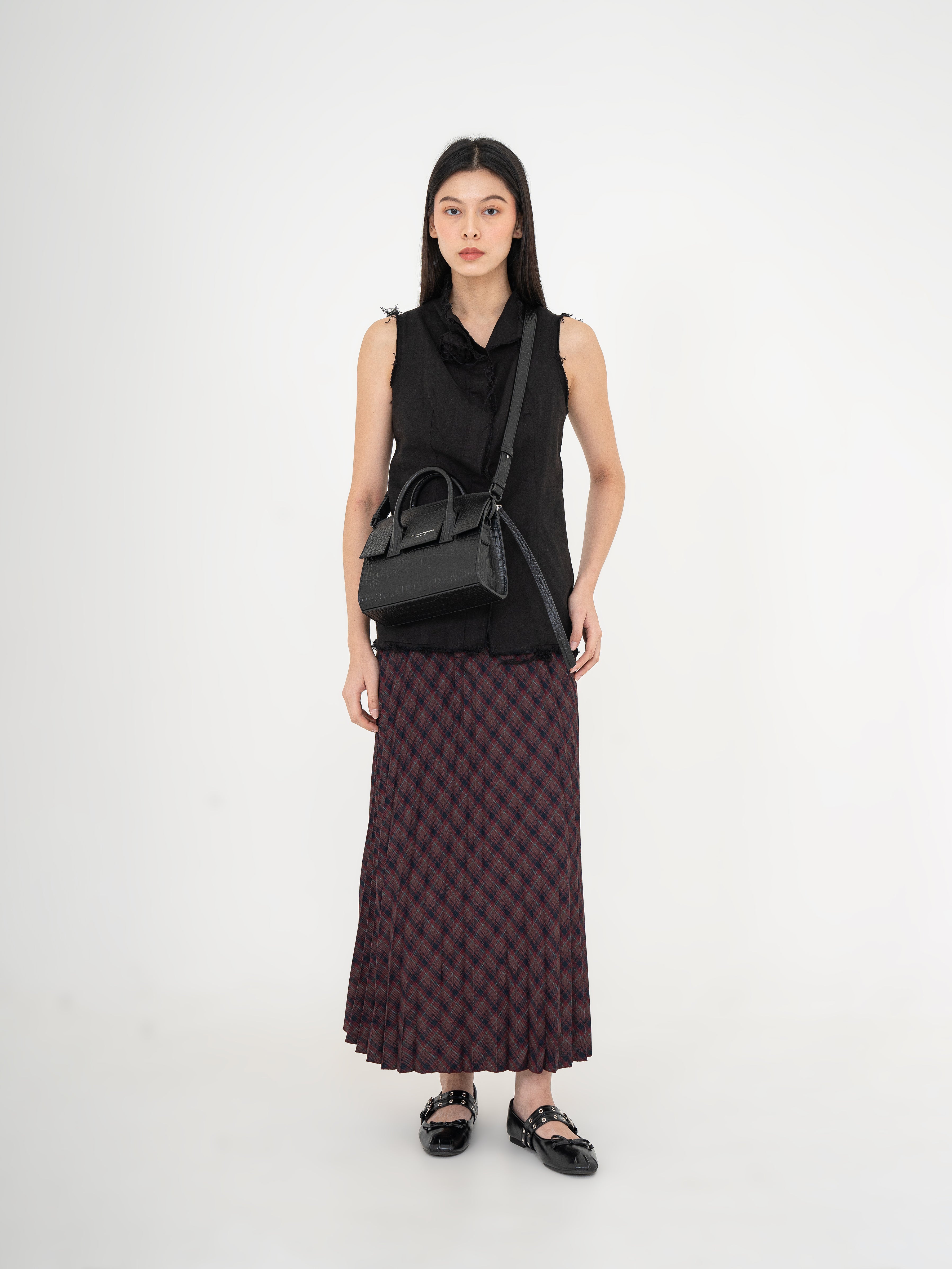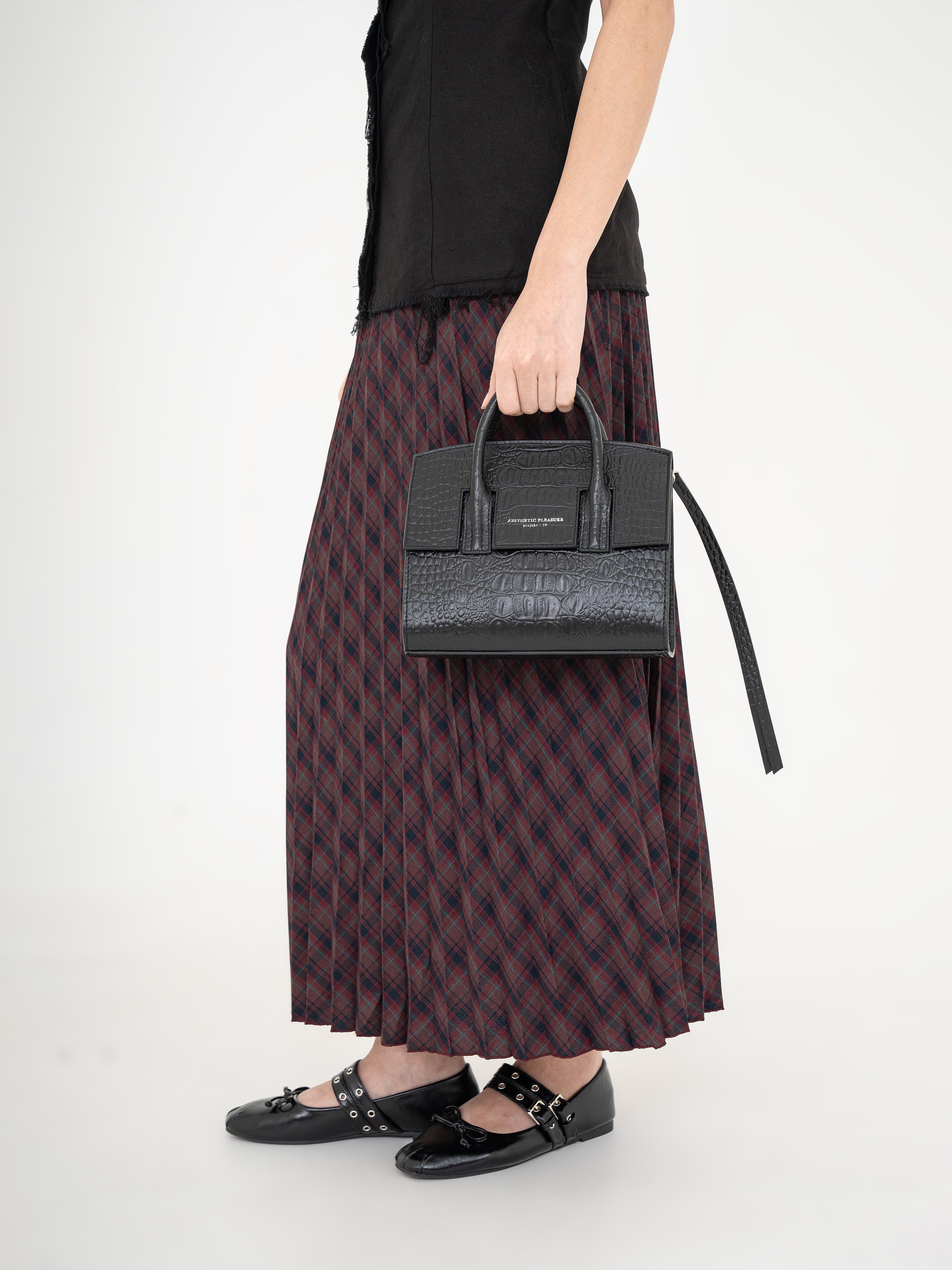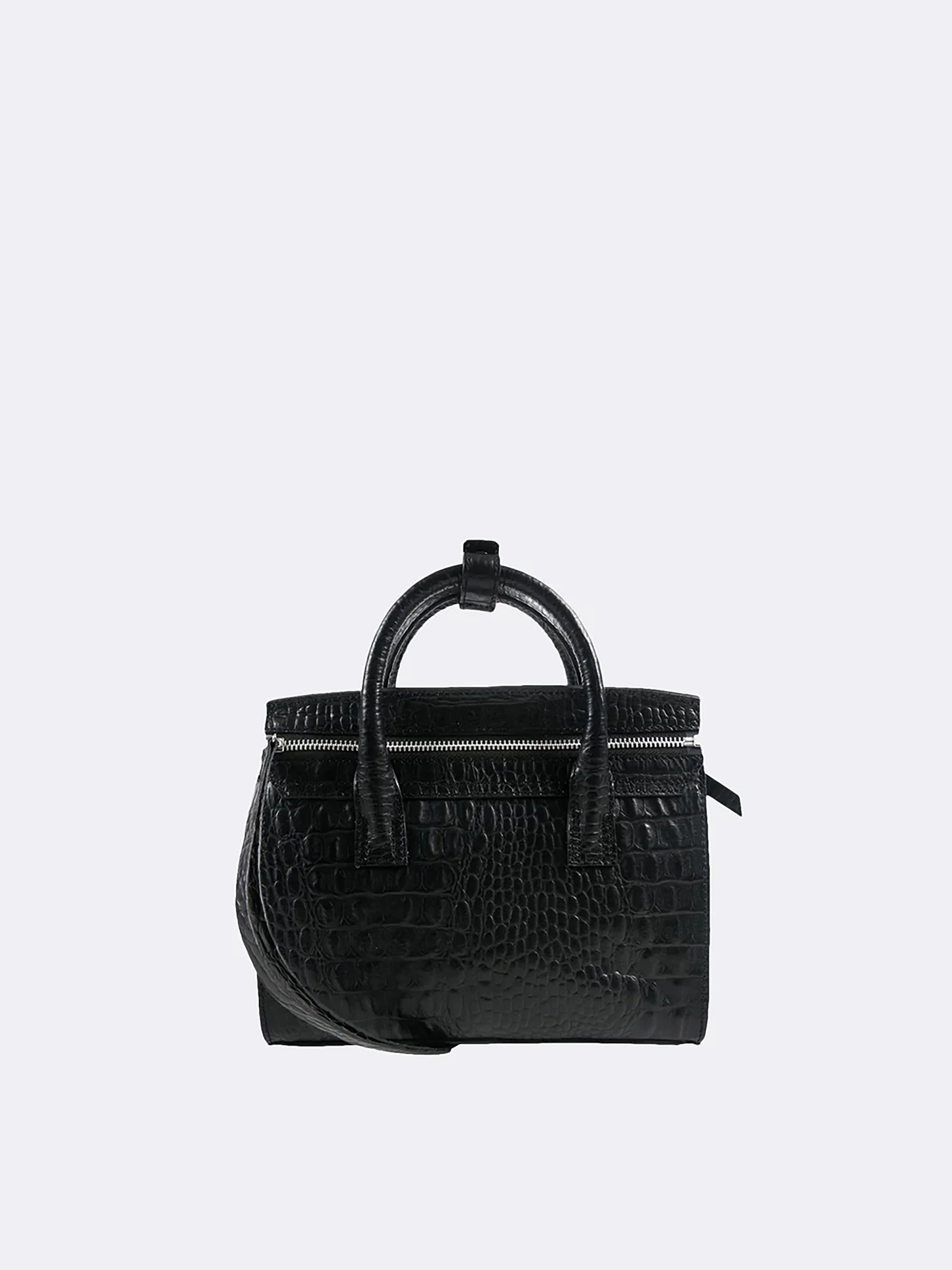 The Mini Isolation Bag is a sophisticated yet practical piece designed for versatility. Featuring a structured silhouette with a luxurious croc-embossed texture, it can be carried by hand or worn over the shoulder with its adjustable strap.