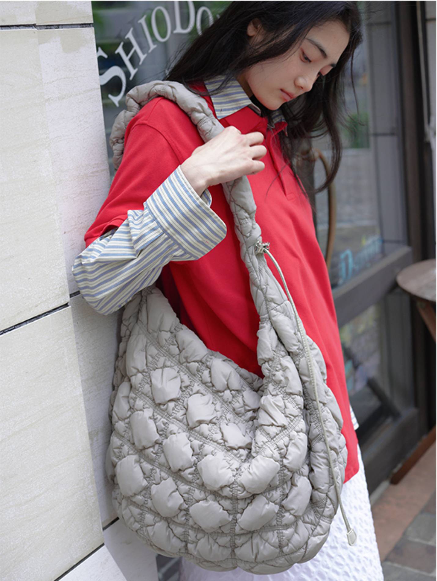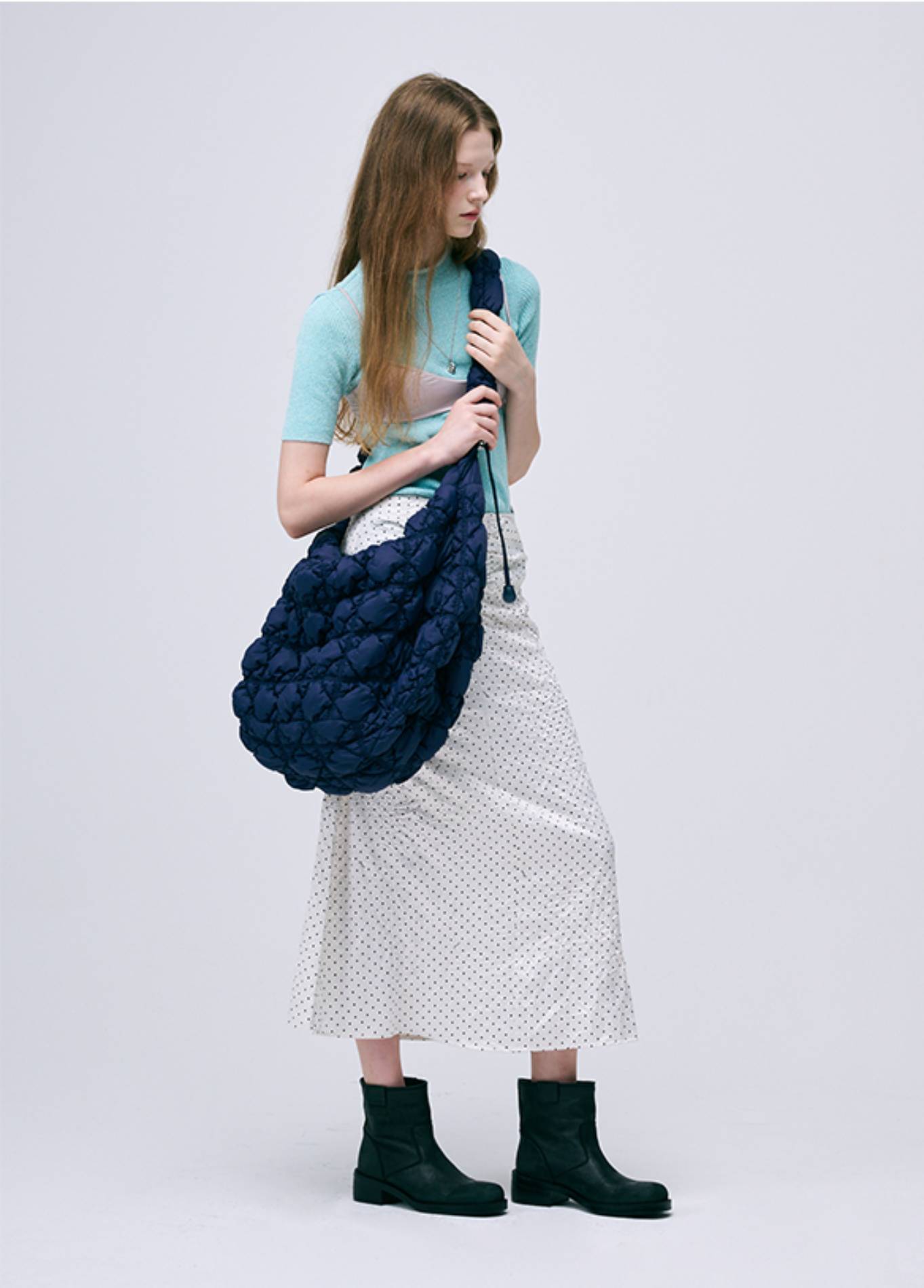 COZY BAG with the same quilting fabric as the best-selling SOFT BAG, featuring a soft touch and light weight. It's an attractive product that fits perfectly when worn your body with a quilting method that uses elastic threads and is carefully hand-made.