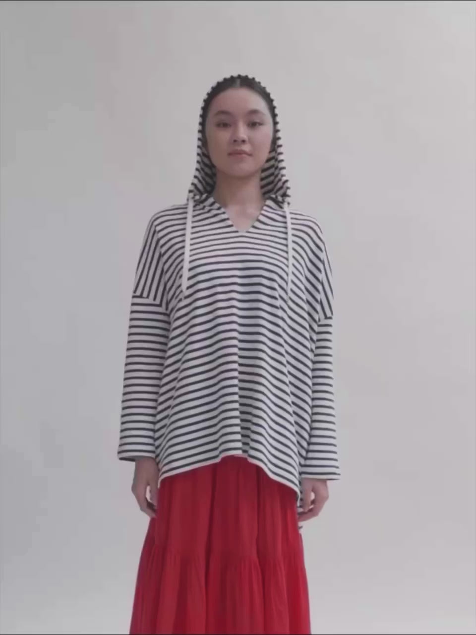 Tunik yang mempunyai hoodie dengan pola garis-garis sebagai aksen. Memiliki siluet longgar dan oversized yang memberikan kesan feminim. Dibuat dari 100% katun sehingga lembut dipakai dan dipegang. Cocok dipakai untuk tampilan kasual.