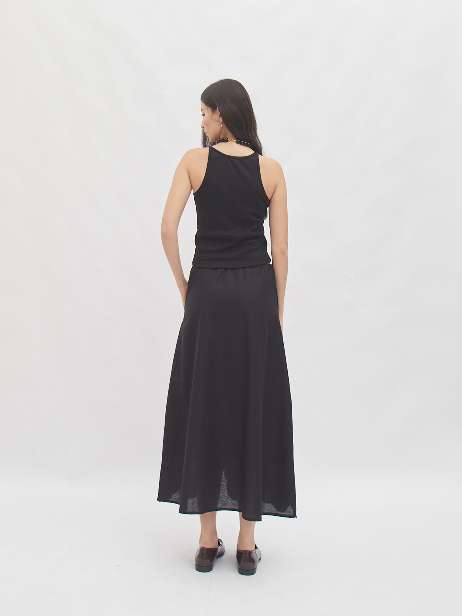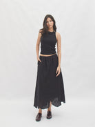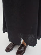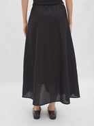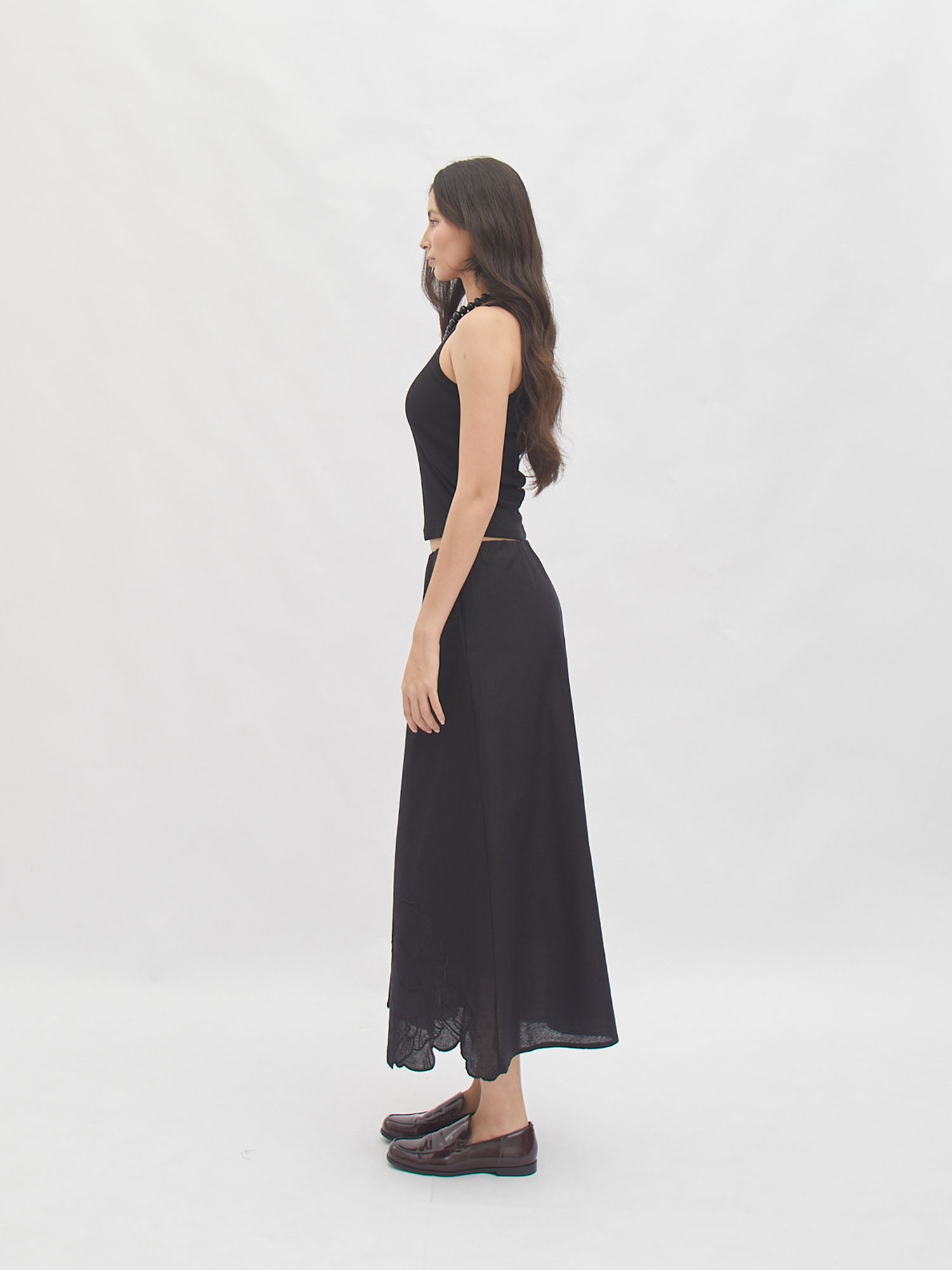 Rok panjang dengan detail bordir bunga di bagian bawah yang memberi sentuhan feminin namun tetap sederhana. Potongannya flowy dengan karet pinggang yang nyaman, cocok dipadukan untuk tampilan kasual maupun semi-formal. Dilengkapi dengan furing di bagian dalam.