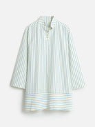 Tunik bergaris dengan desain kerah terbuka dan potongan longgar, memberikan tampilan kasual namun tetap rapi. Dilengkapi detail saku pada sisi untuk kenyamanan dan sentuhan fungsional.