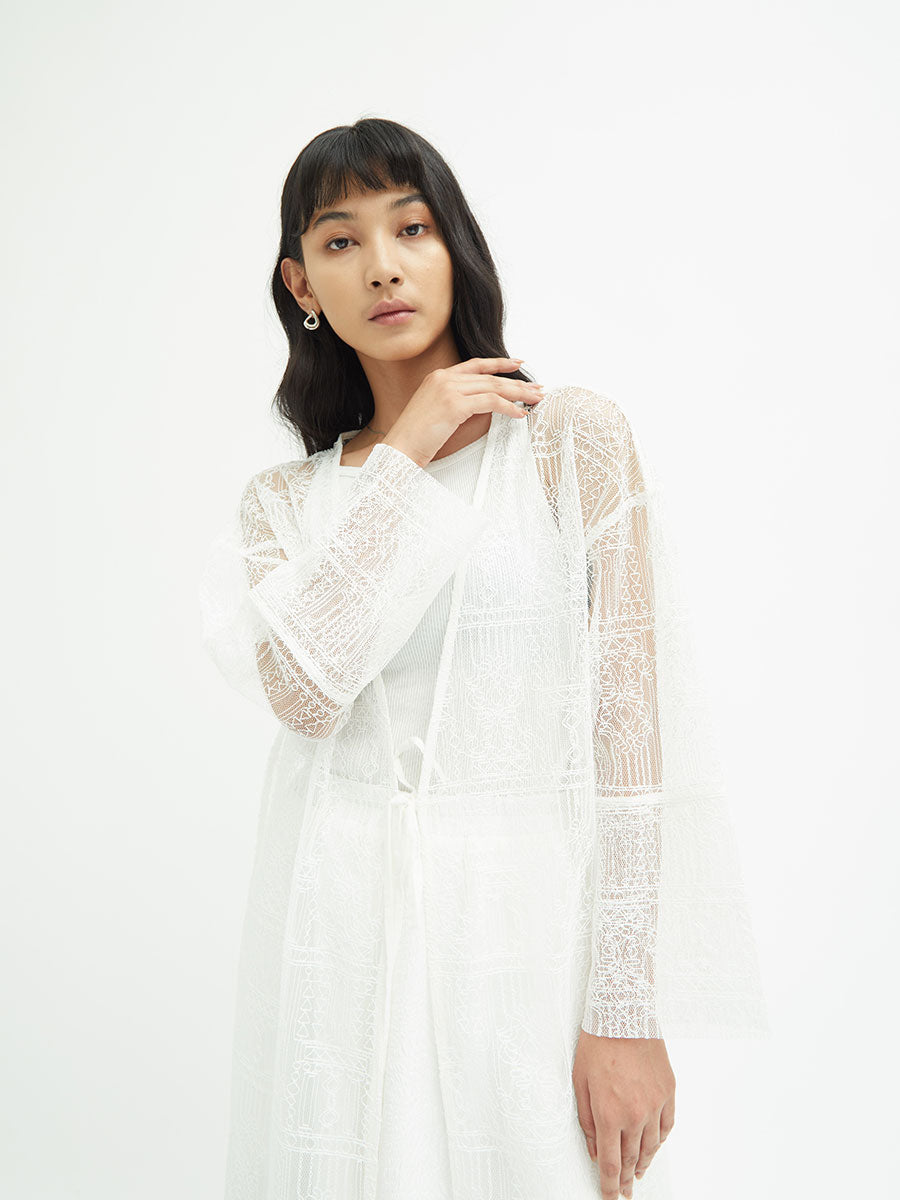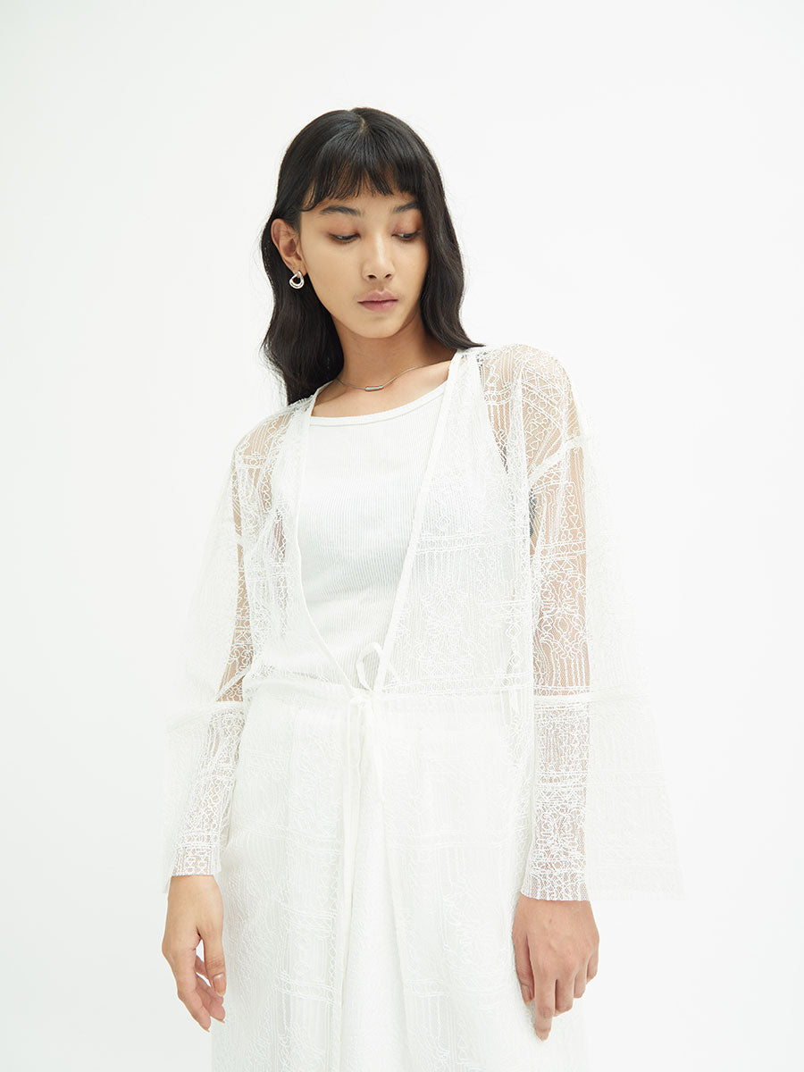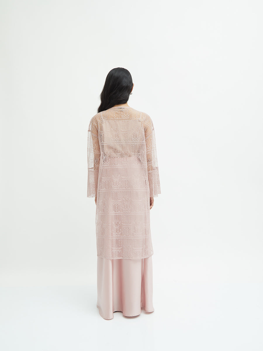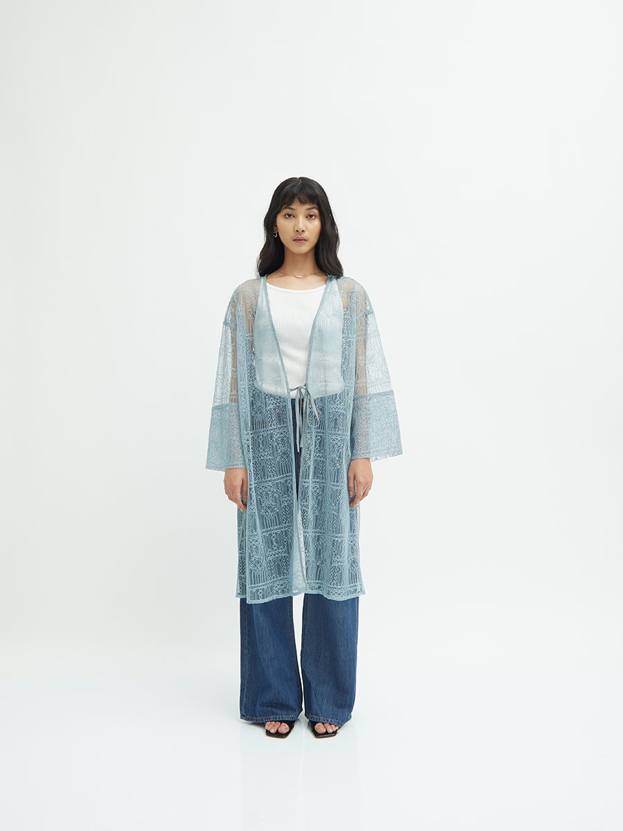 Luaran dengan aksen renda yang elegan. Memiliki tali di bagian belakang. Cocok untuk dipakai dalam kegiatan sehari-hari, baik itu untuk acara formal atau informal.