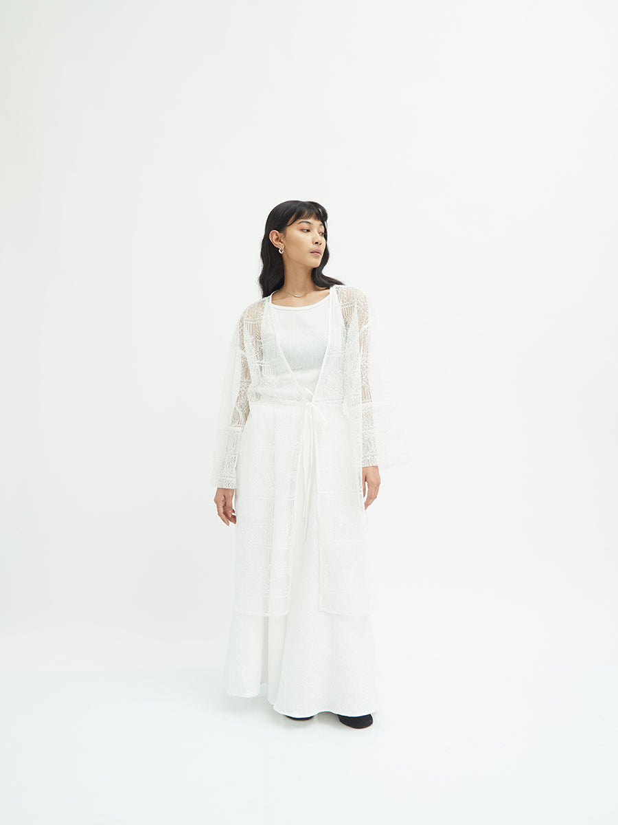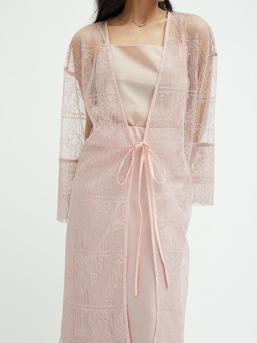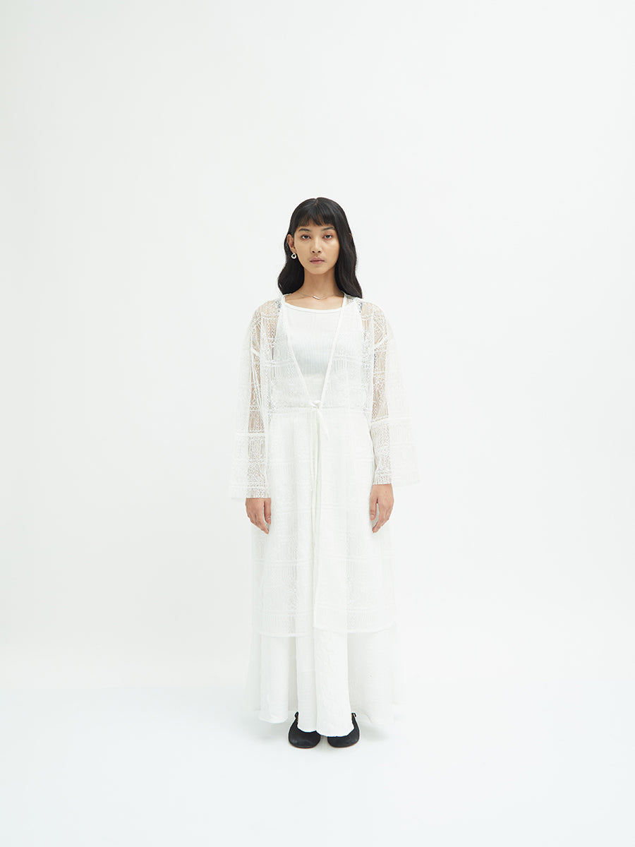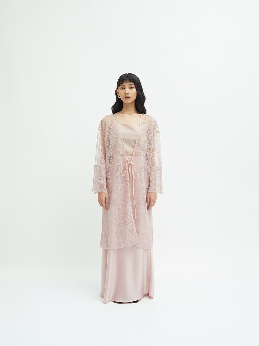 Luaran dengan aksen renda yang elegan. Memiliki tali di bagian belakang. Cocok untuk dipakai dalam kegiatan sehari-hari, baik itu untuk acara formal atau informal.