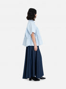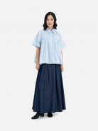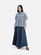 Blus chambray dengan detail tiered dan lengan pendek ini memberikan nuansa kasual yang manis dan ringan. Desain kerah klasik dipadukan dengan siluet mengembang yang nyaman, menjadikannya pilihan sempurna untuk gaya santai sehari-hari.