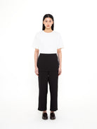 Terdapat detail ikat pinggang, celana ini juga memiliki lipatan garis tengah di bagian belakang.