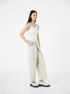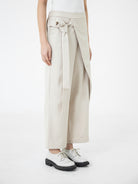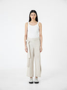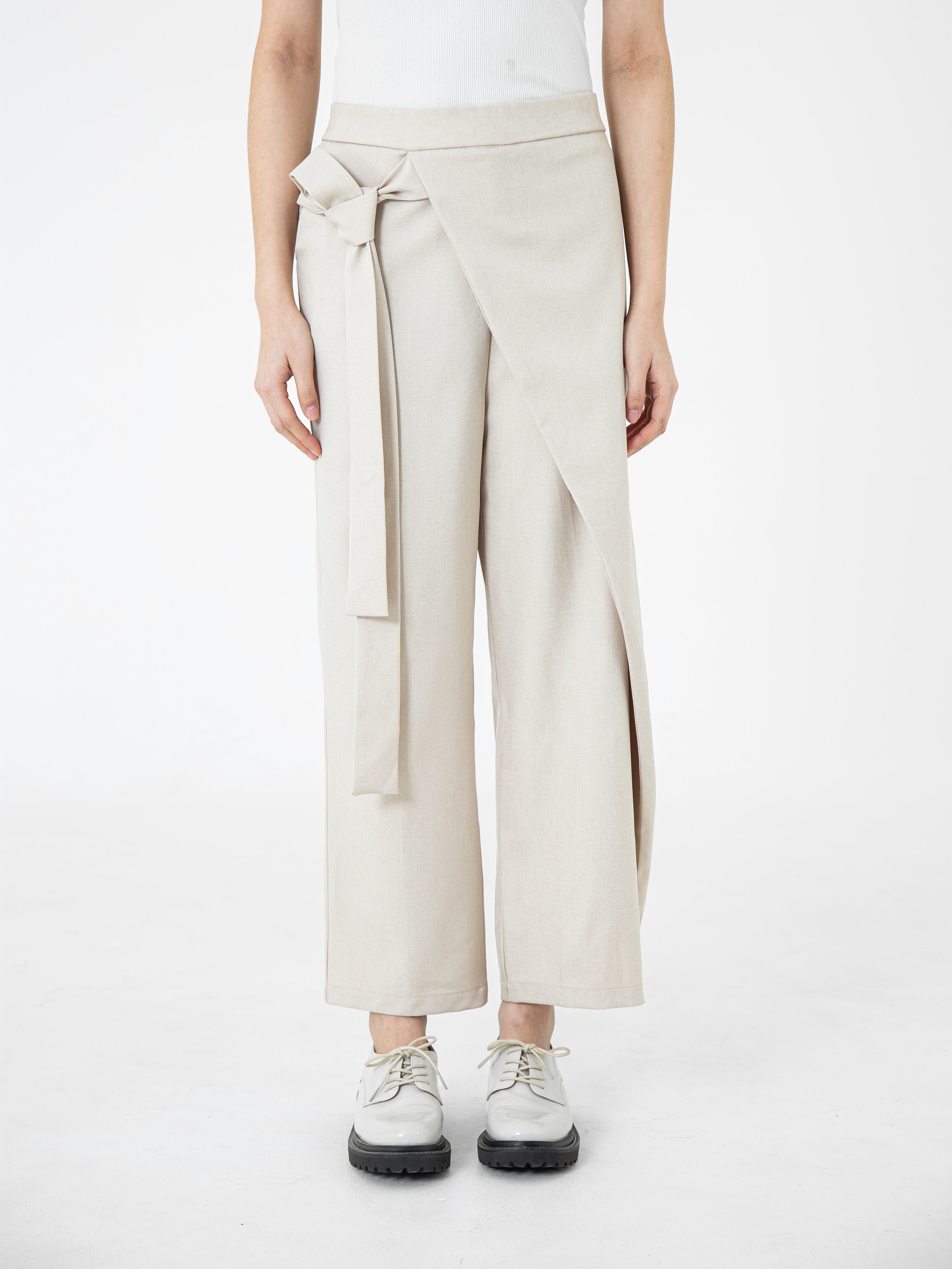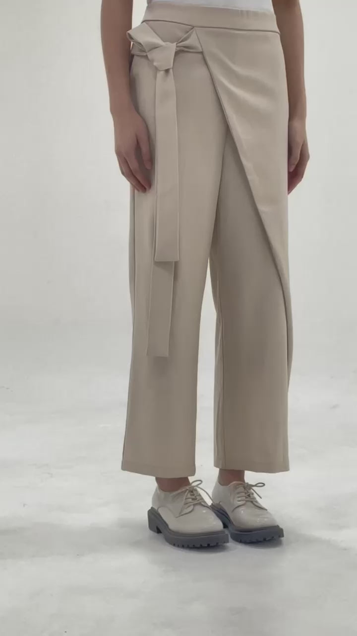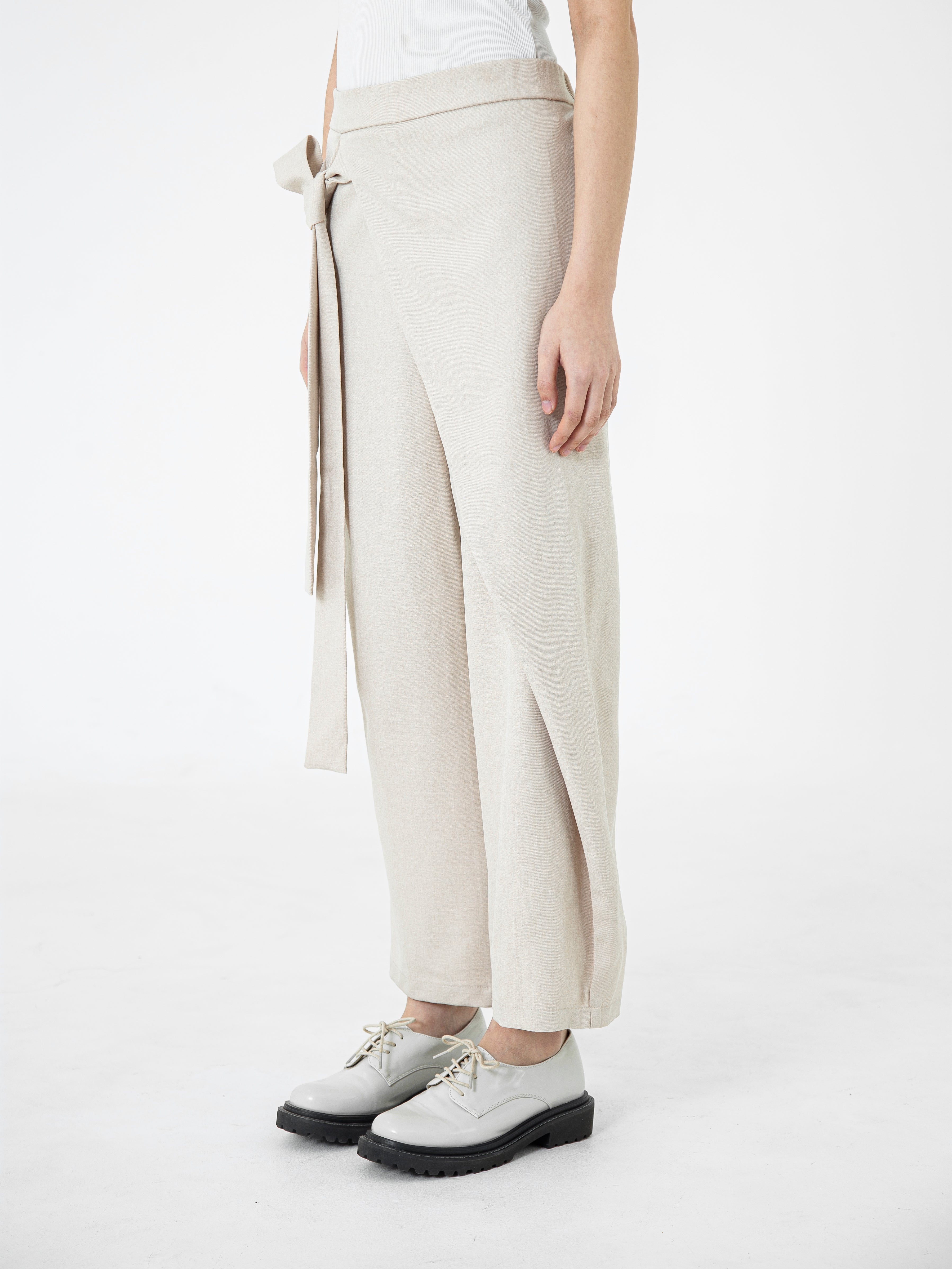 Celana panjang wanita ini didesain dengan wrap di bagian depan. Memiliki tali yang dapat disesuaikan. Terdapat karet di bagian pinggang sehingga nyaman saat dipakai. Memiliki satu saku disisi celana. Memiliki bahan yang halus sehingga nyaman saat dipakai. Cocok untuk dikenakan pada acara formal maupun non formal.