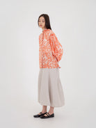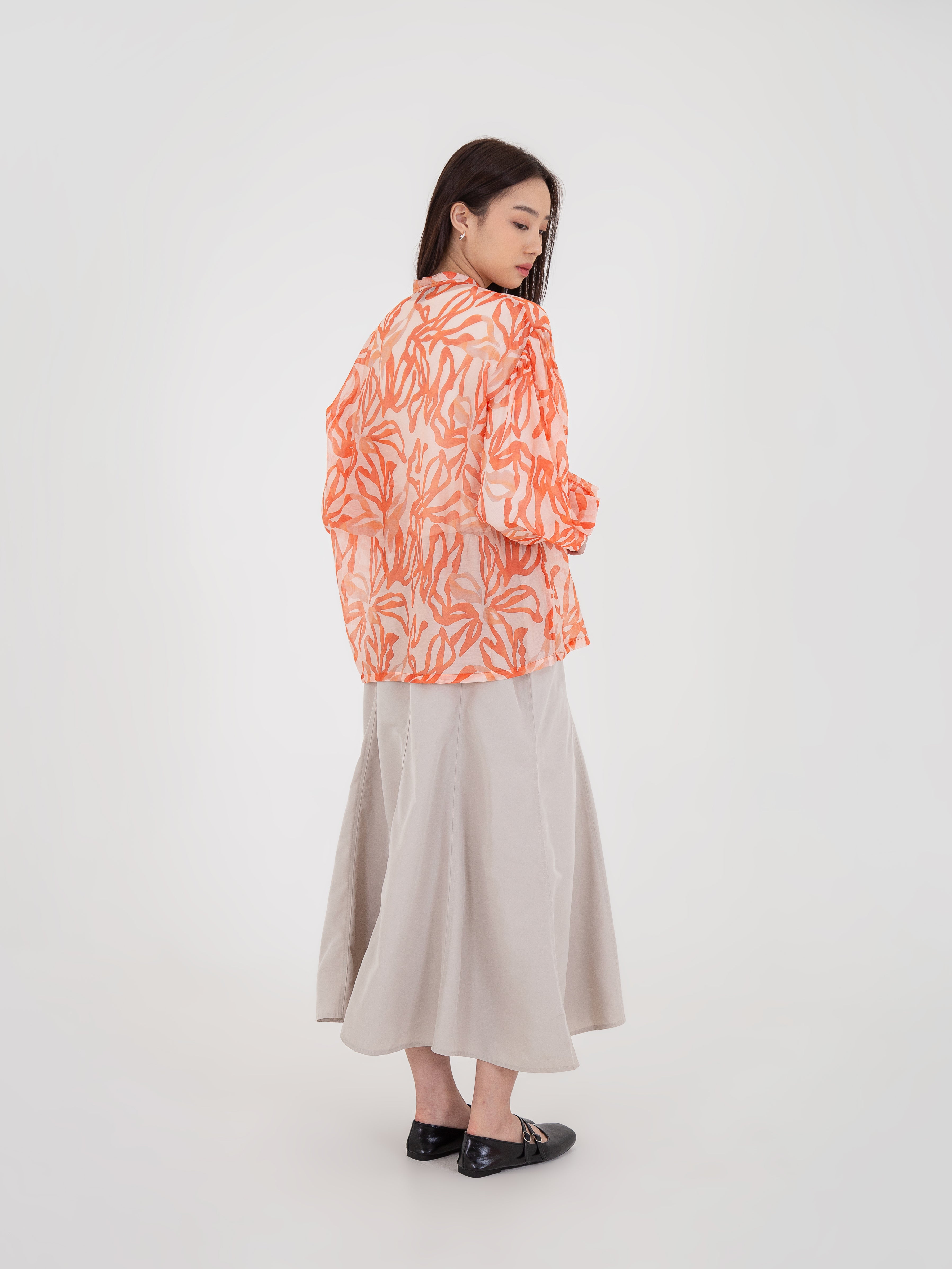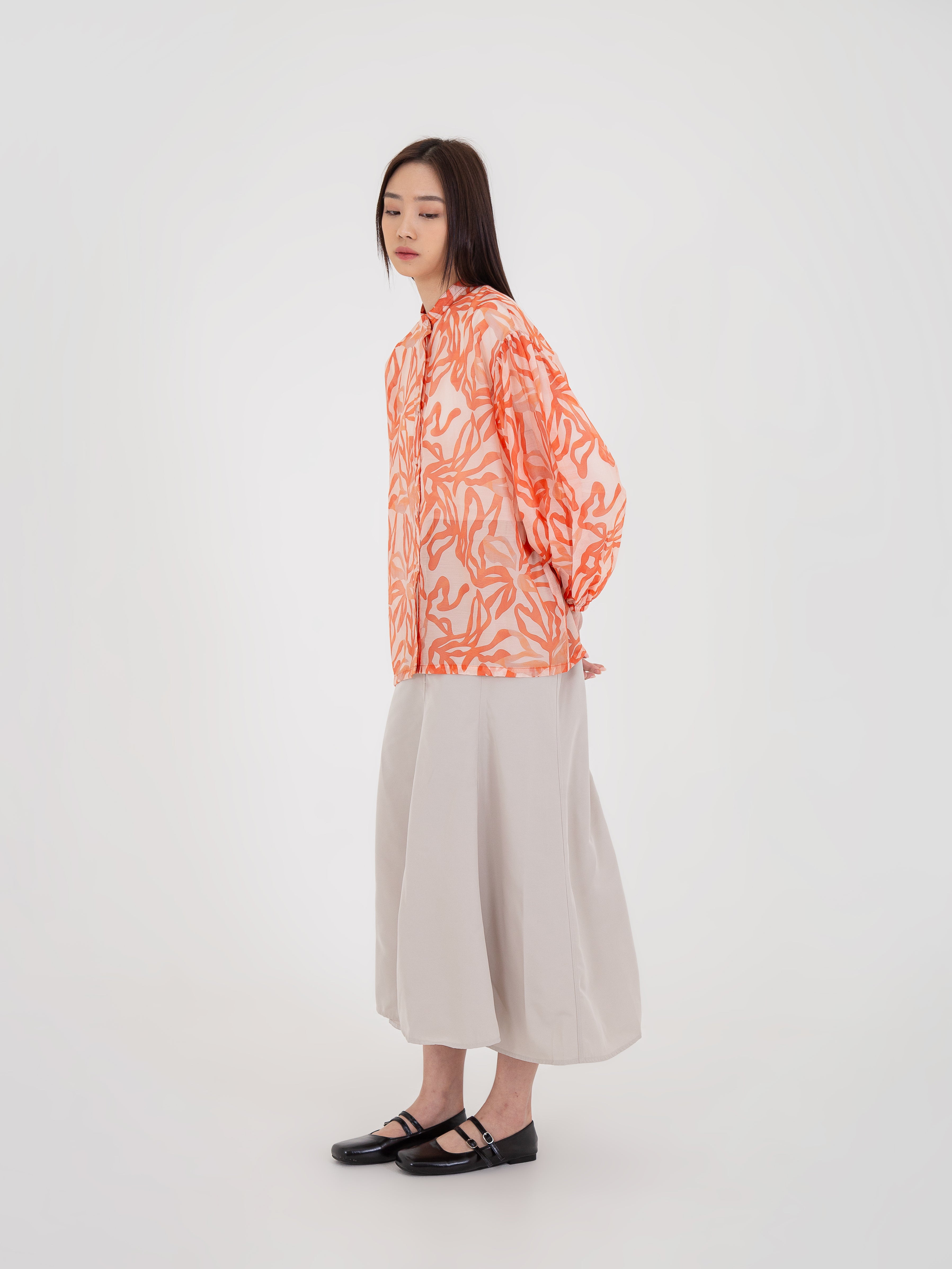 Desainnya menampilkan silhouette loose fit yang memberikan kesan effortless. Detail kerah bulat dengan kancing depan menambah sentuhan klasik, sementara lengan balloon dengan manset elastis menciptakan volume yang dramatis tanpa mengurangi kenyamanan.