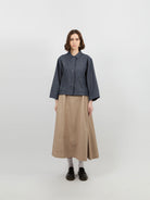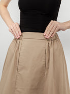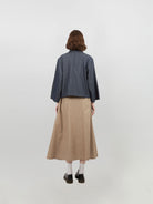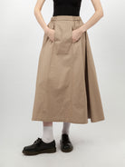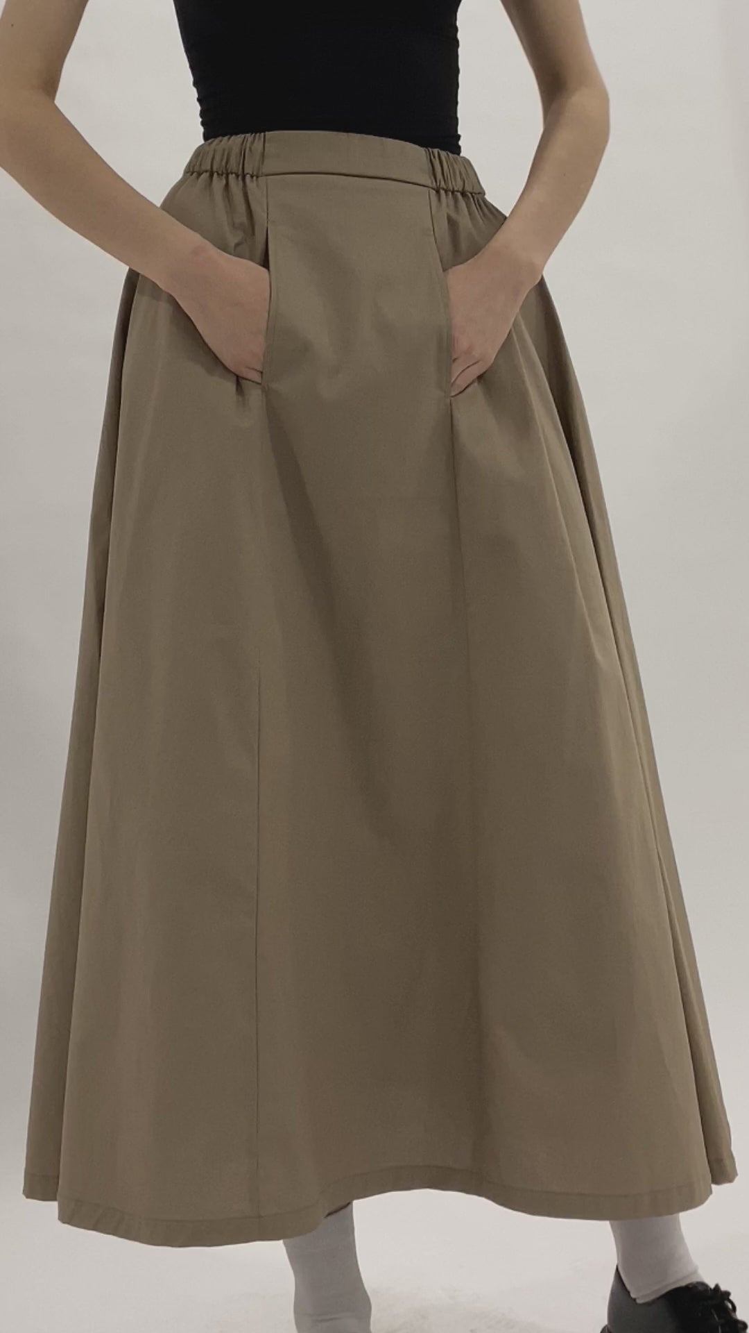 Rok wanita ini di desain dengan volume yang melebar pada bagian bawah. Memiliki detail saku kanguru yang memberikan kesan elegan. Terdapat karet di bagian sisi rok. Cocok dikenakan untuk acara formal maupun kasual.