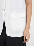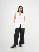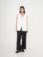 Liliana Vest adalah rompi bergaya tailored yang menghadirkan kesan clean, modern, dan effortlessly chic. Desain tanpa lengan dengan potongan lurus serta belahan samping memberikan sentuhan edgy sekaligus fungsional, cocok dikenakan sebagai outer layering maupun sebagai item utama dalam gaya formal atau kasual.