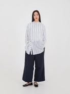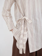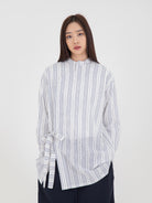 Aksen knot di bagian samping memberikan detail unik yang bisa disesuaikan untuk tampilan lebih fitted atau tetap loose sesuai selera. Dilengkapi dengan kerah tinggi, kancing depan, dan lengan panjang dengan manset, blouse ini menawarkan kesan smart casual yang mudah dipadukan dengan berbagai outfit.