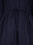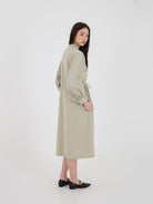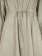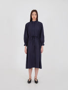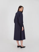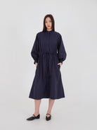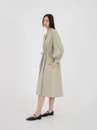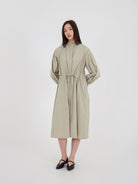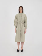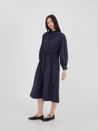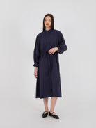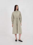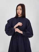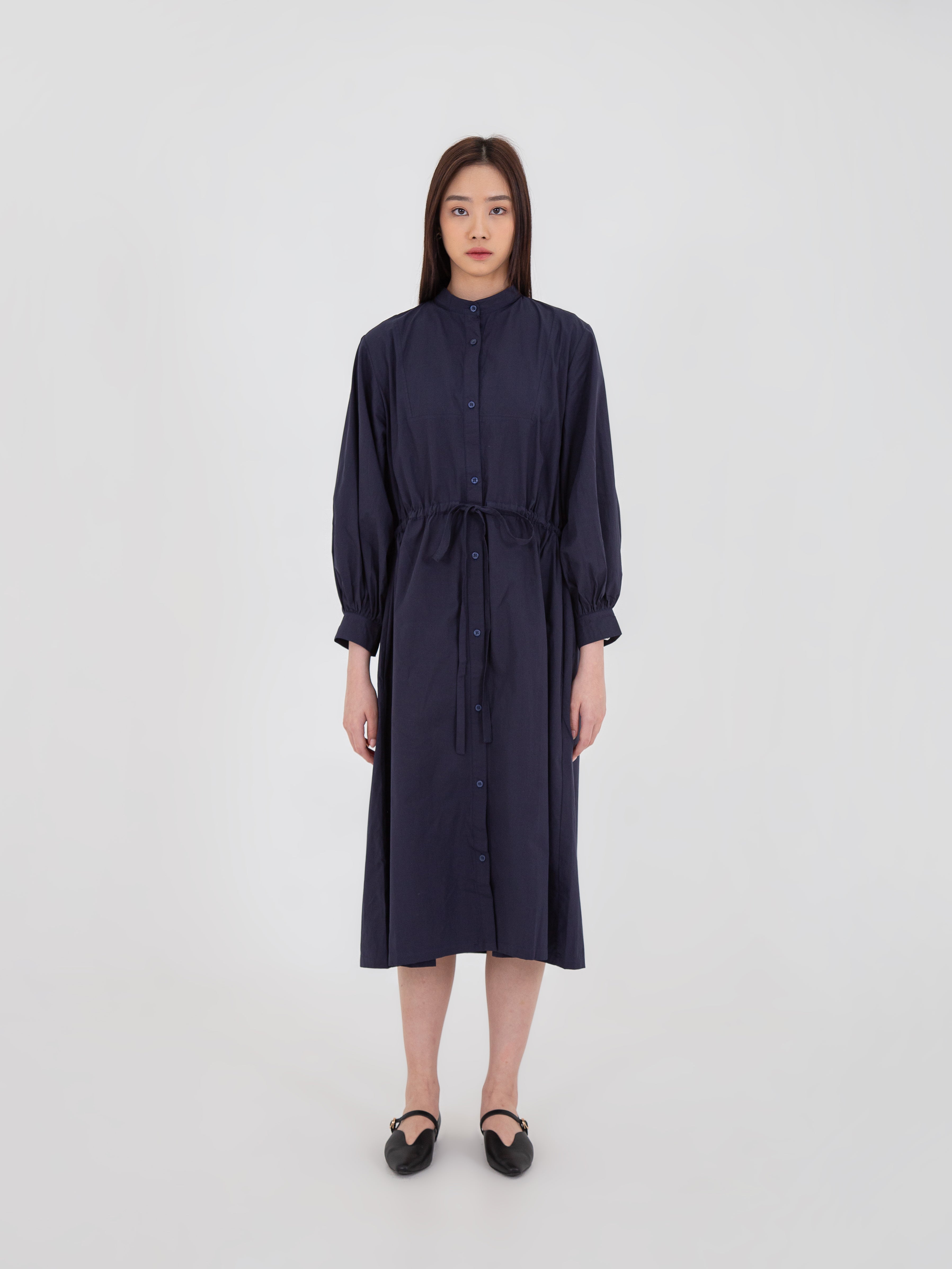 Dilengkapi dengan detail kerah shanghai yang memberikan sentuhan klasik serta kancing full di bagian depan, dress ini bisa dikenakan sebagai tunik atau outer. Tali serut di pinggang memungkinkan Anda menyesuaikan siluet agar lebih fit atau loose sesuai preferensi. Sementara lengan puff dengan manset kancing memberikan volume yang elegan.