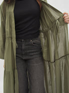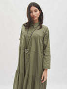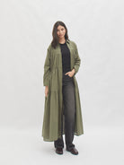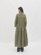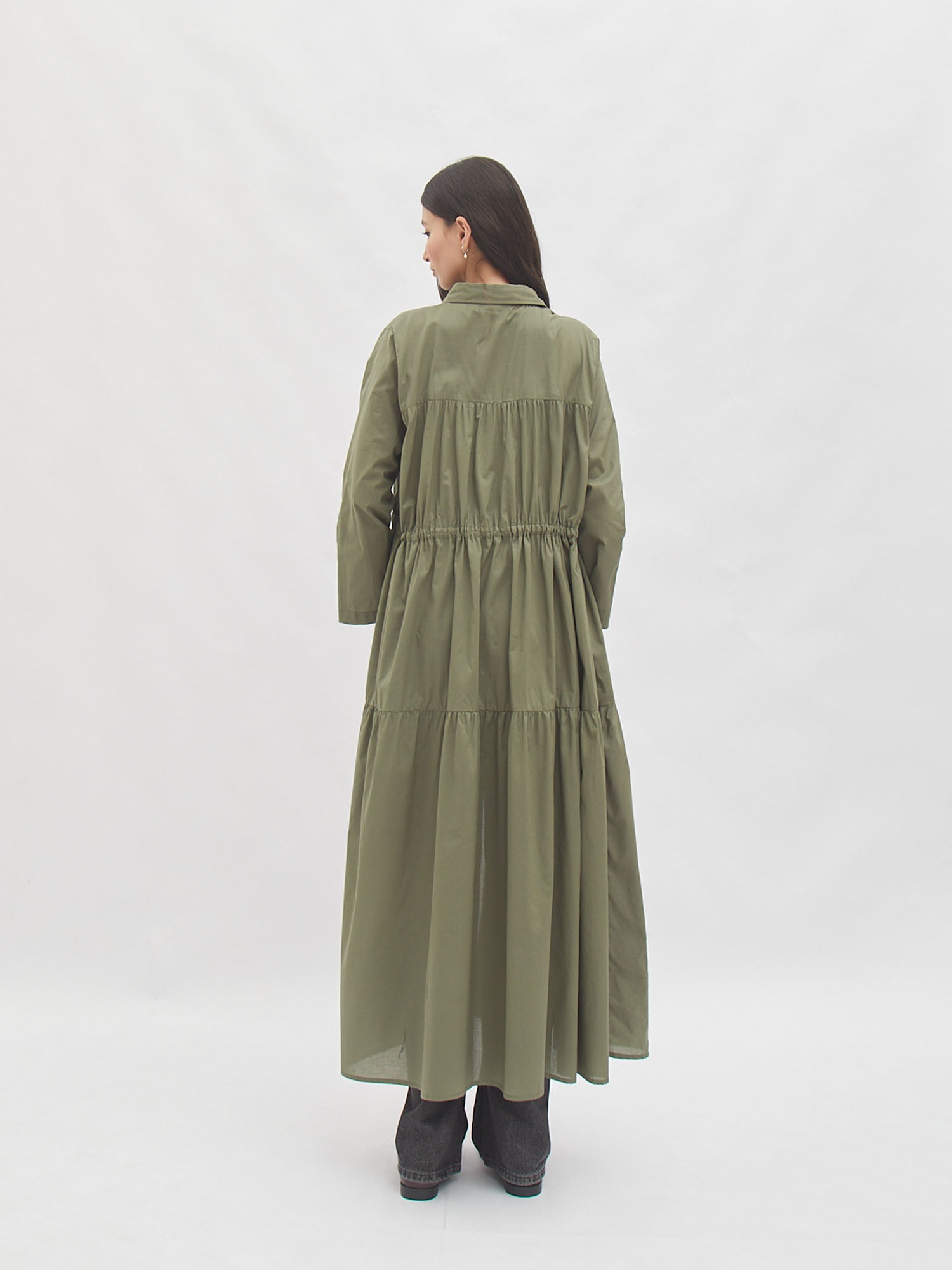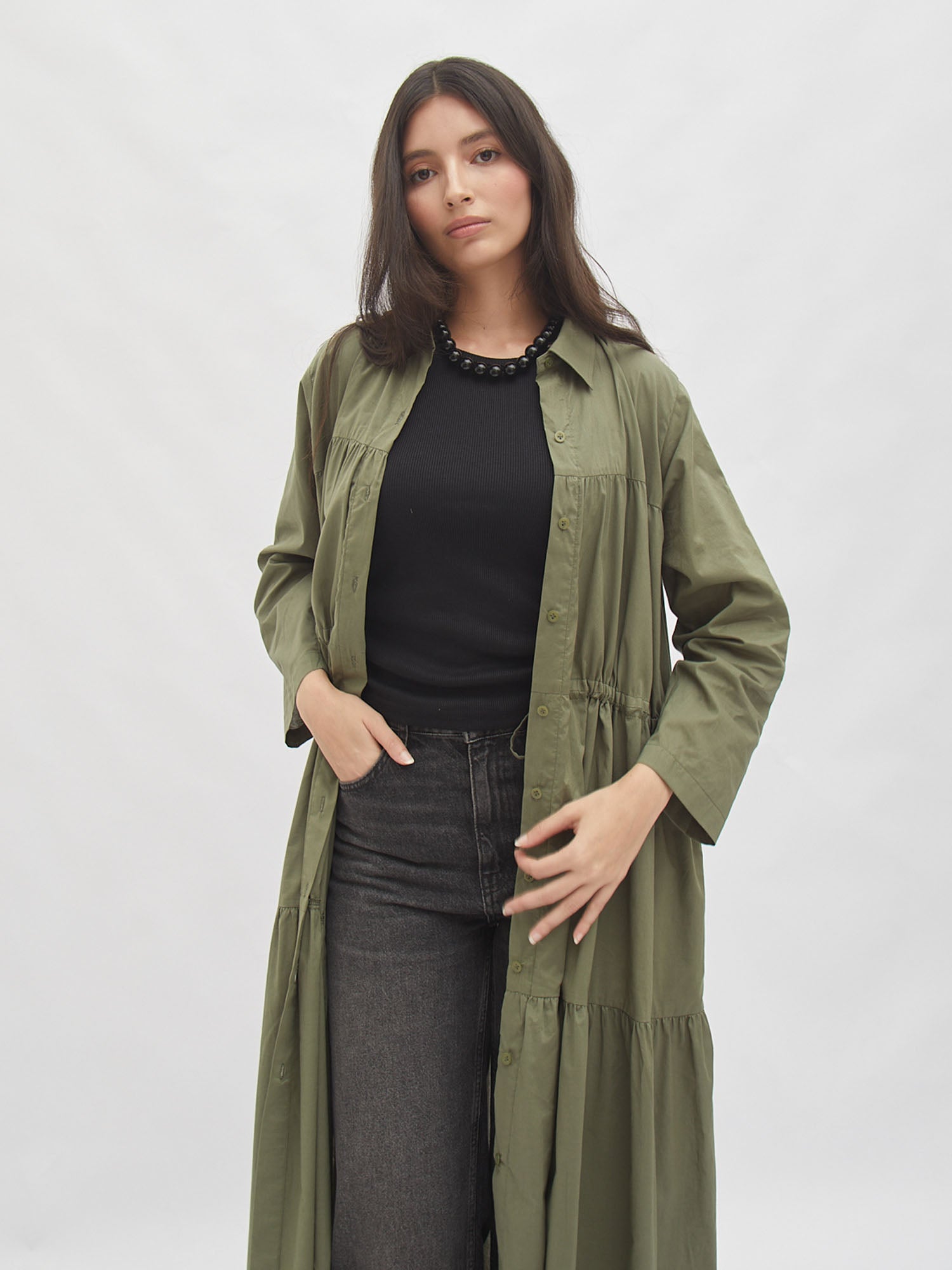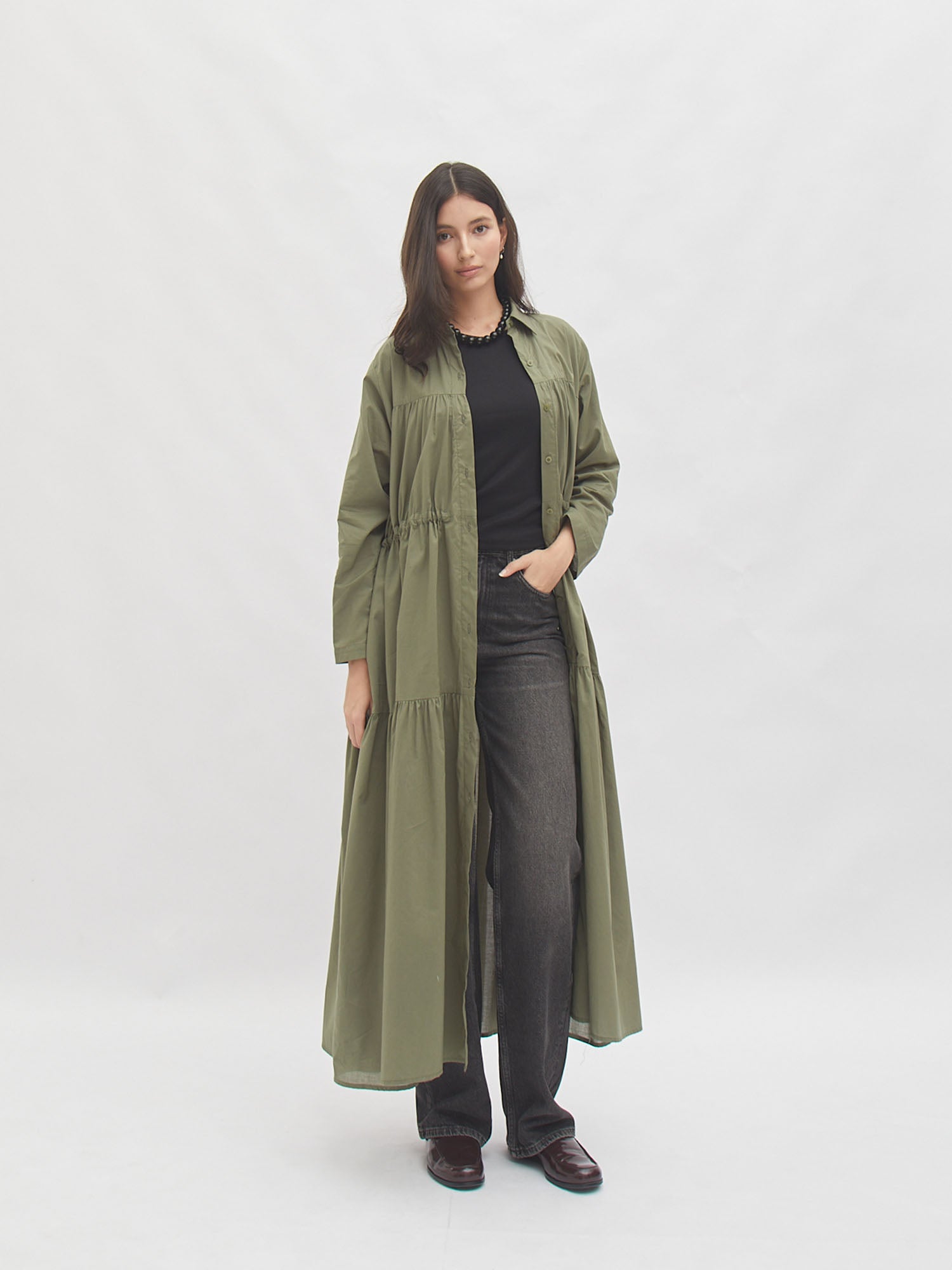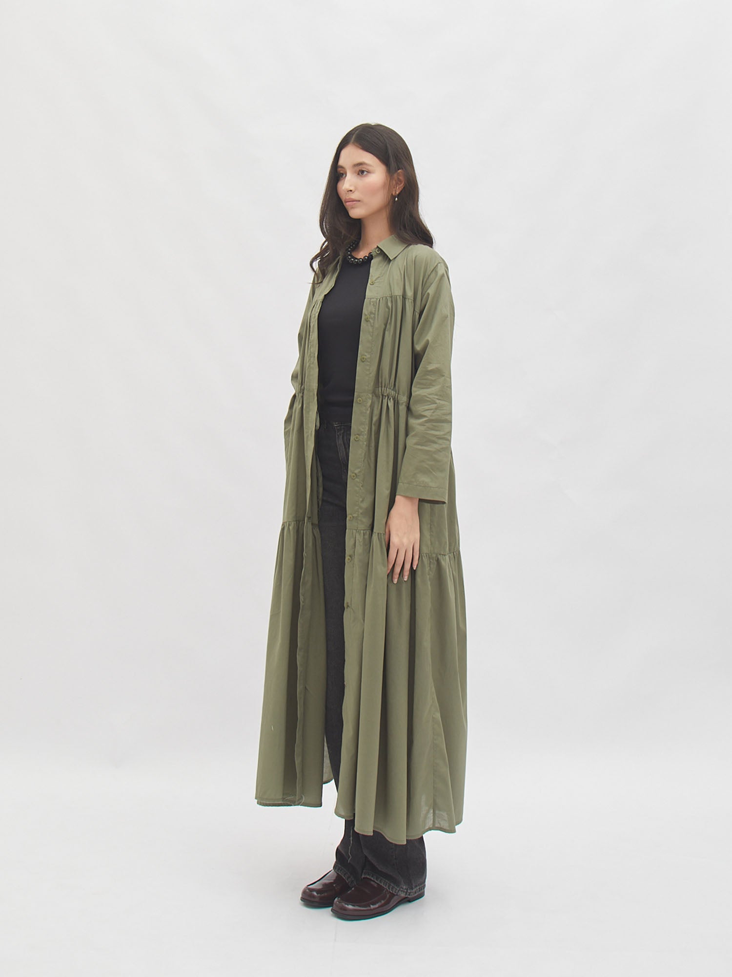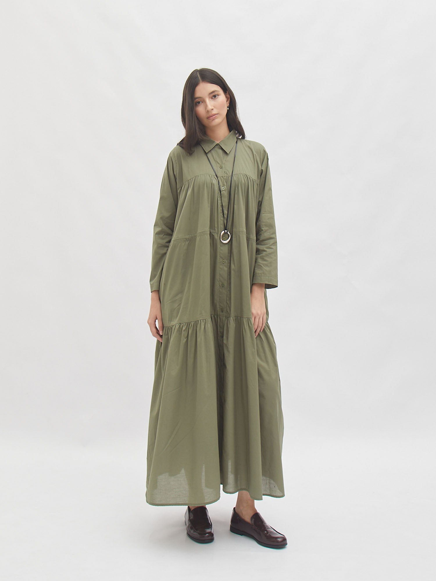 Dress panjang dengan desain longgar yang nyaman dan serbaguna. Hadir dengan kerah klasik, kancing depan penuh, serta potongan bertingkat yang memberi siluet flowy. Bisa dipakai sebagai dress maupun outer untuk layering.