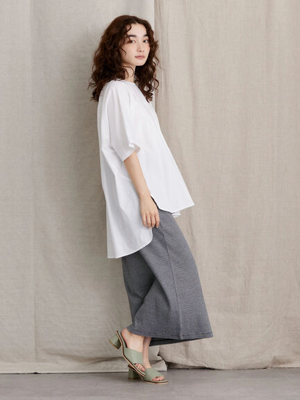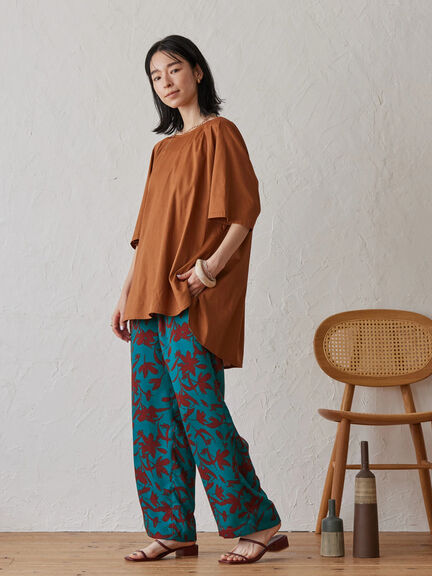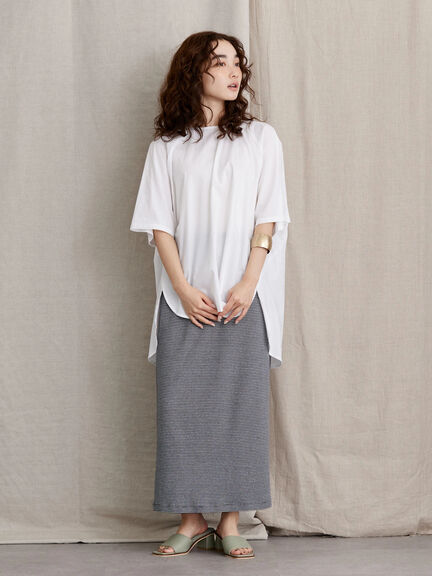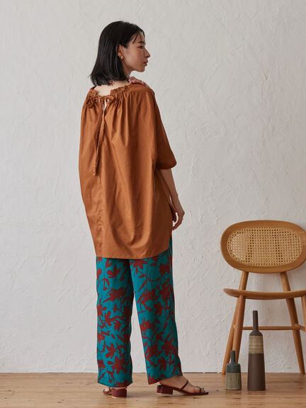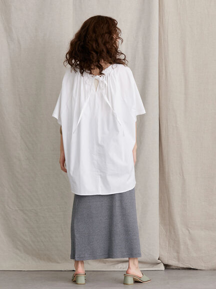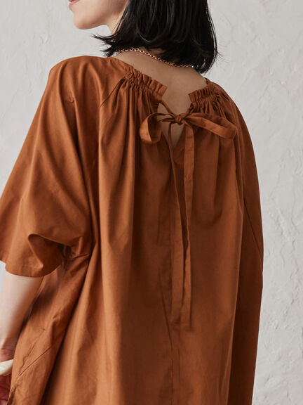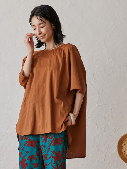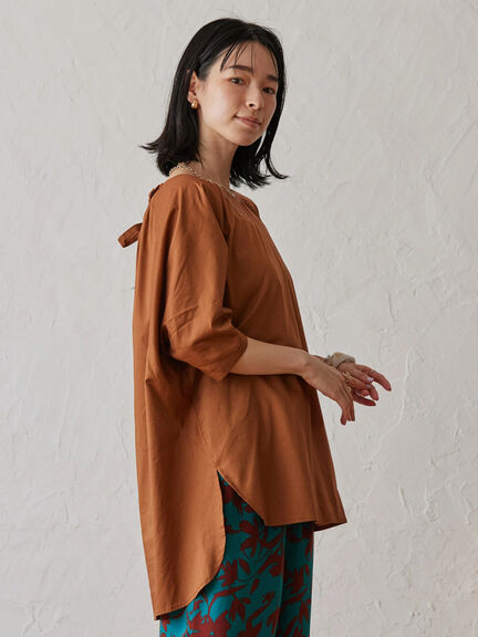Atasan wanita ini di desain dengan model cutting yang loose sehingga sangat nyaman saat dikenakan, terdapat slit pada bagian samping serta di desain dengan panjang yang berbeda antara bagian depan dan belakang. Terdapat tali pita yang dapat di sesuaikan pada bagian belakang yang memberikan kesan feminin.