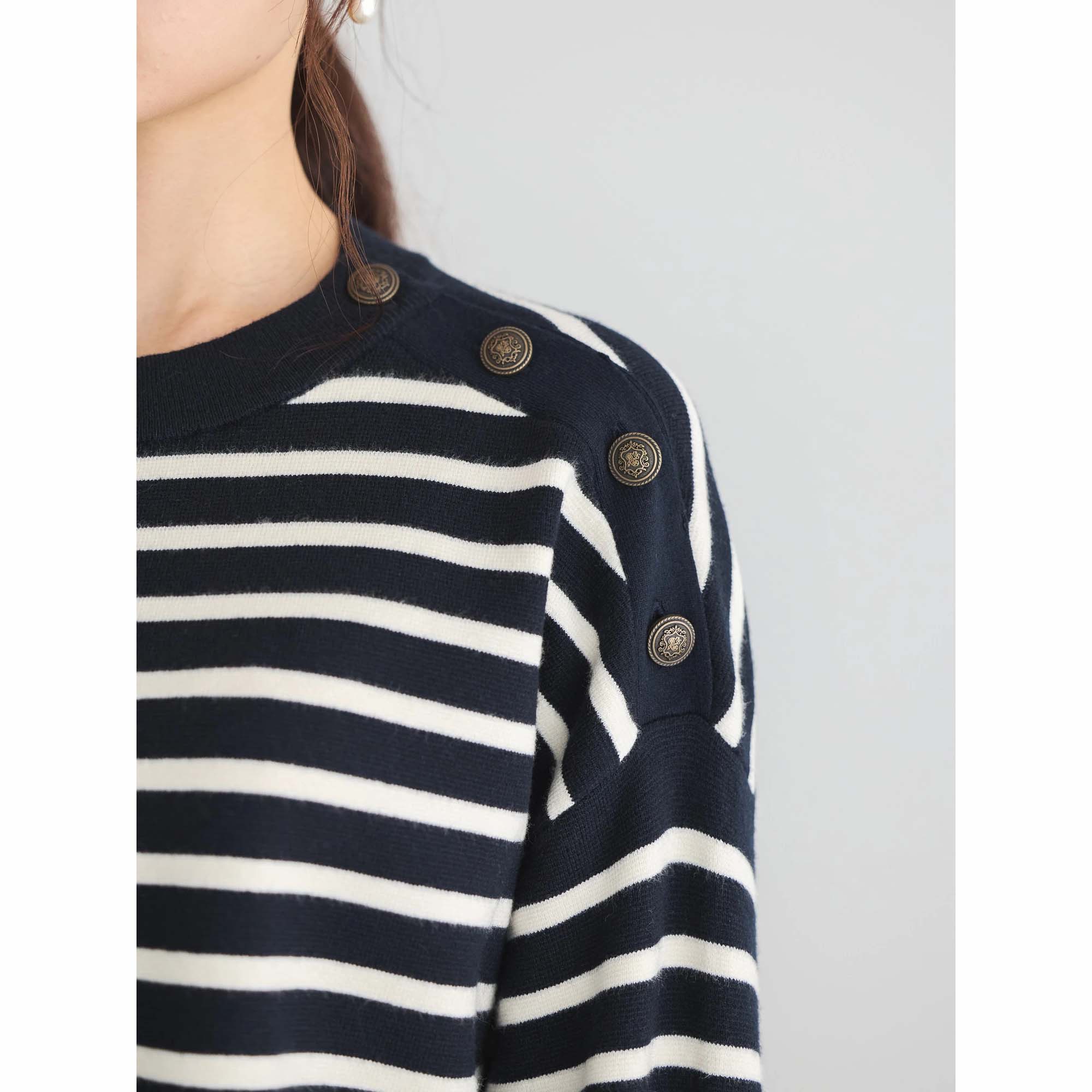 Pullover rajut wanita ini didesain dengan model kerah bulat. Memiliki aksen kancing sebagai hiasan pada bagian lengan yang memberikan kesan feminim. Memiliki bahan yang halus sehingga nyaman saat dipakai. Cocok untuk dikenakan pada acara formal maupun non formal.