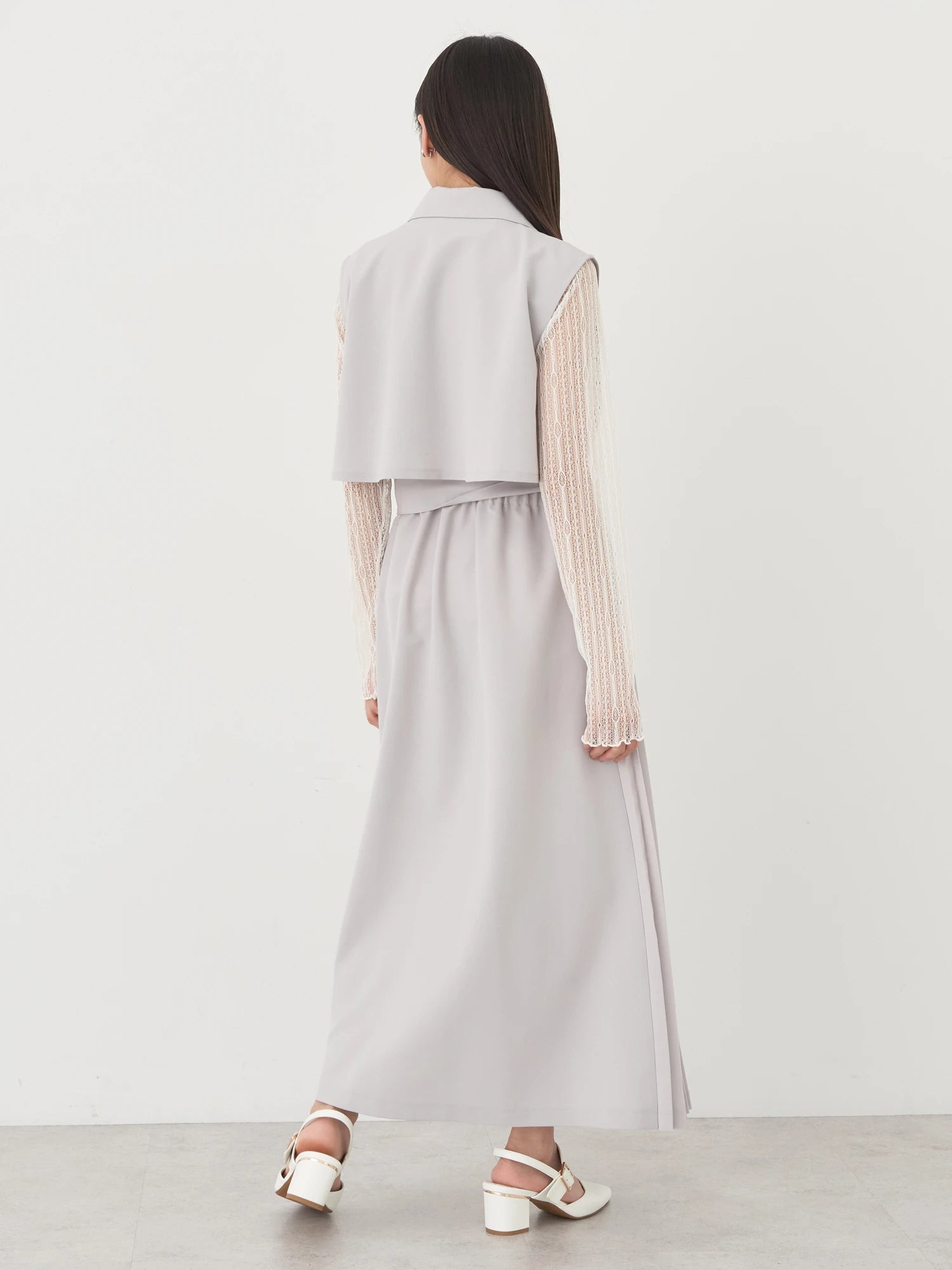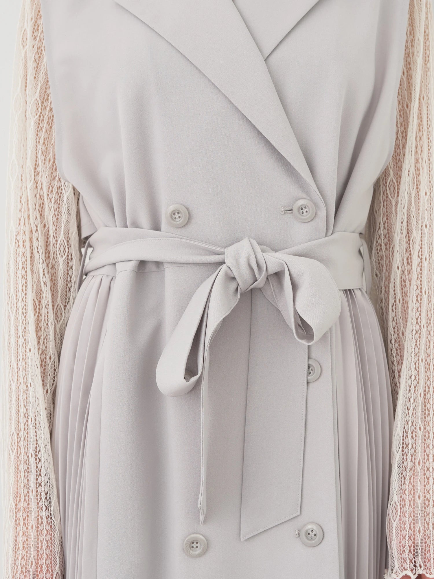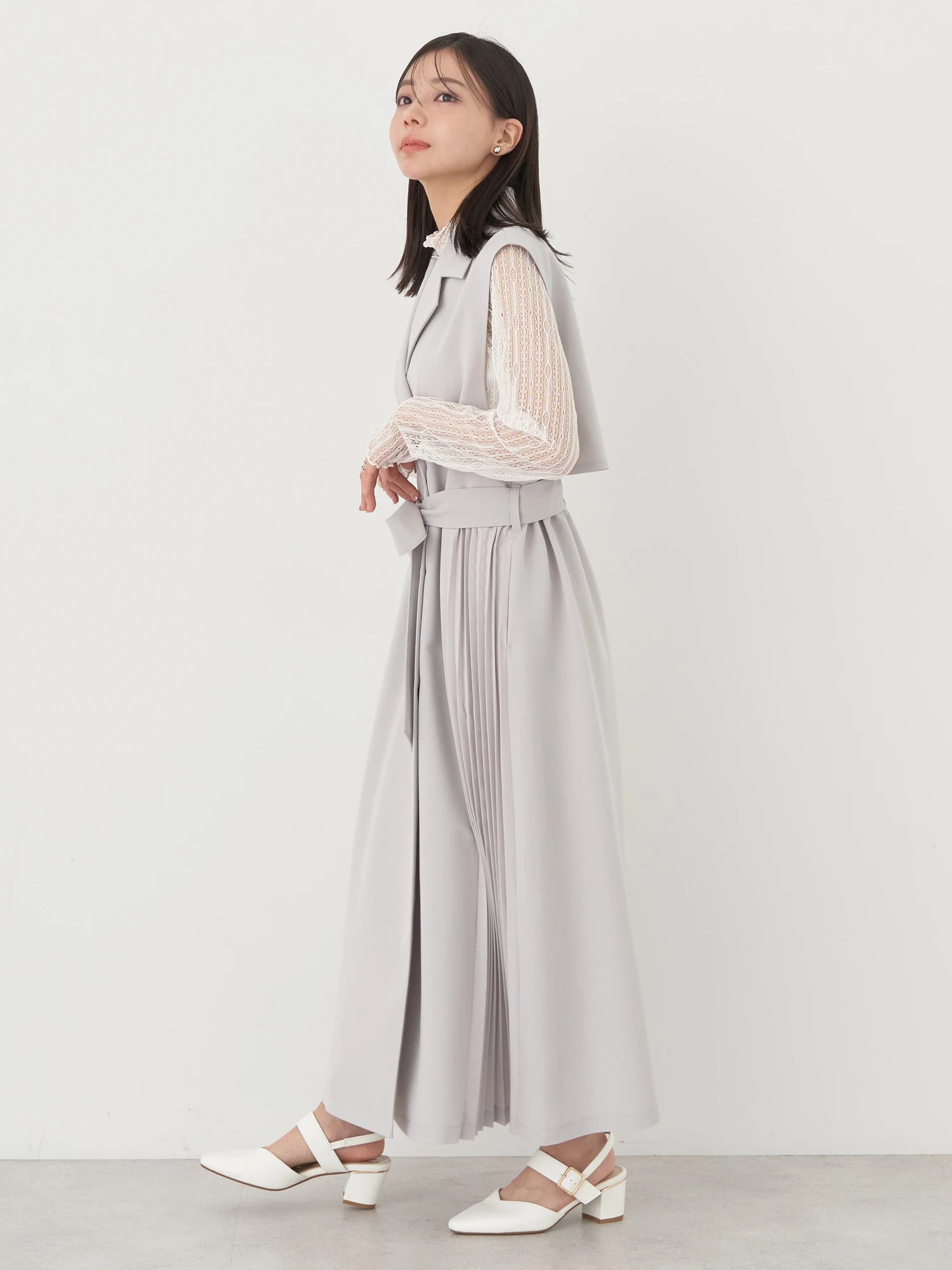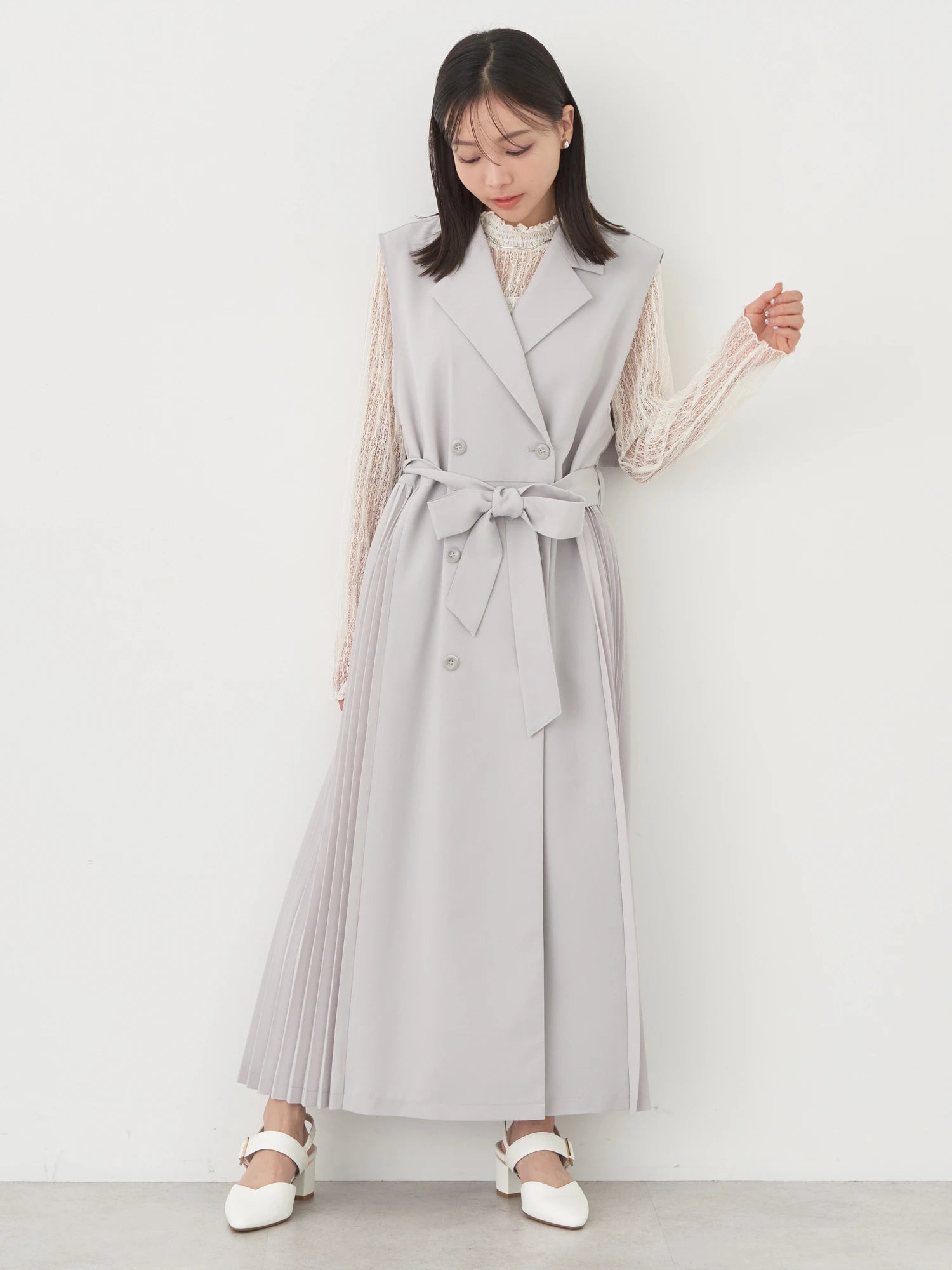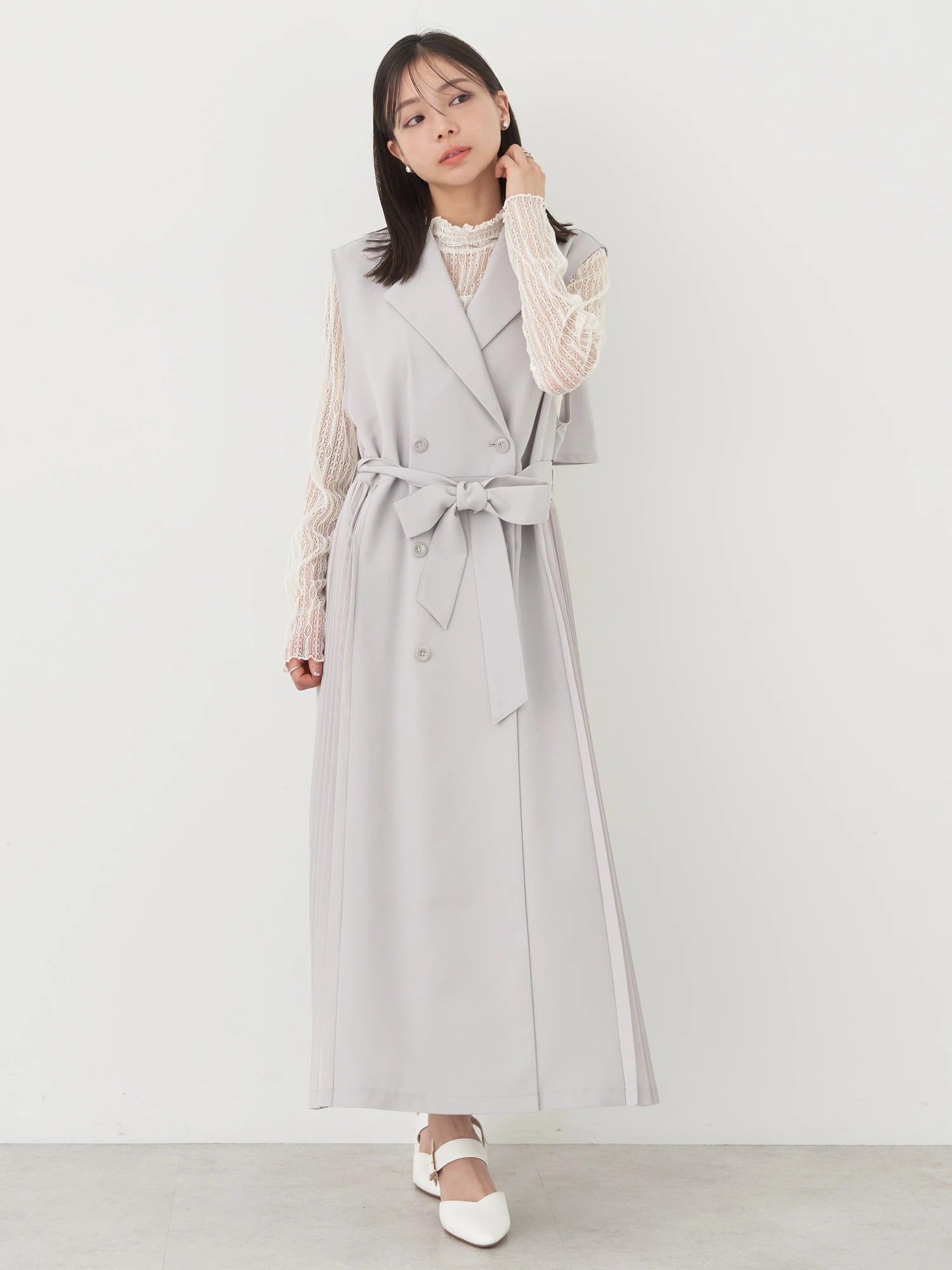 Outer ini didesain dengan model kerah blazer tanpa lengan. Memiliki tiga kancing pada bagian depan dan tali pinggang yang dapat diseusaikan. Terdapat pleats di sisi kanan kiri sehingga membuat yang memakai outer ini terlihat elegan. Cocok untuk dikenakan pada acara formal maupun non formal.
