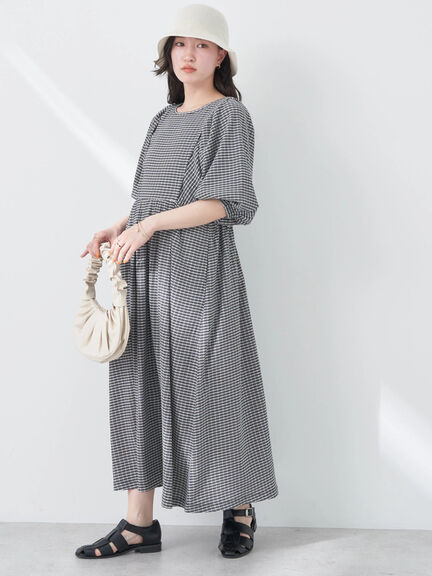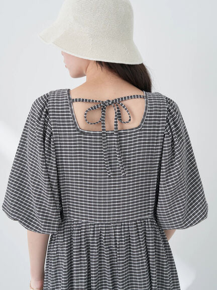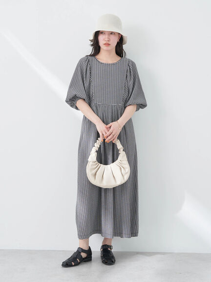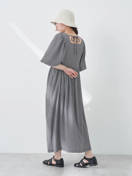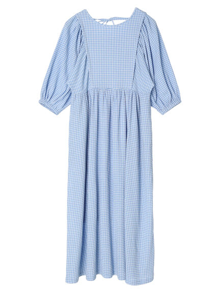 Dress wanita ini terbuat dari bahan dengan tekstur wrinkle yang di desain bervolume pada bagian lengan, serta pola siluet lebar yang memberikan kesan feminin. Terdapat tali pita pada bagian belakang yang dapat disesuaikan, di bagian ujung lengan terdapat karet.