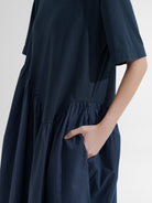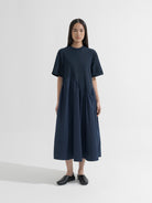 Dress ini hadir dengan detail sambungan unik di bagian pinggang yang memberikan kesan playful dan modern. Potongan A-line yang longgar membuatnya nyaman dipakai untuk aktivitas sehari-hari.