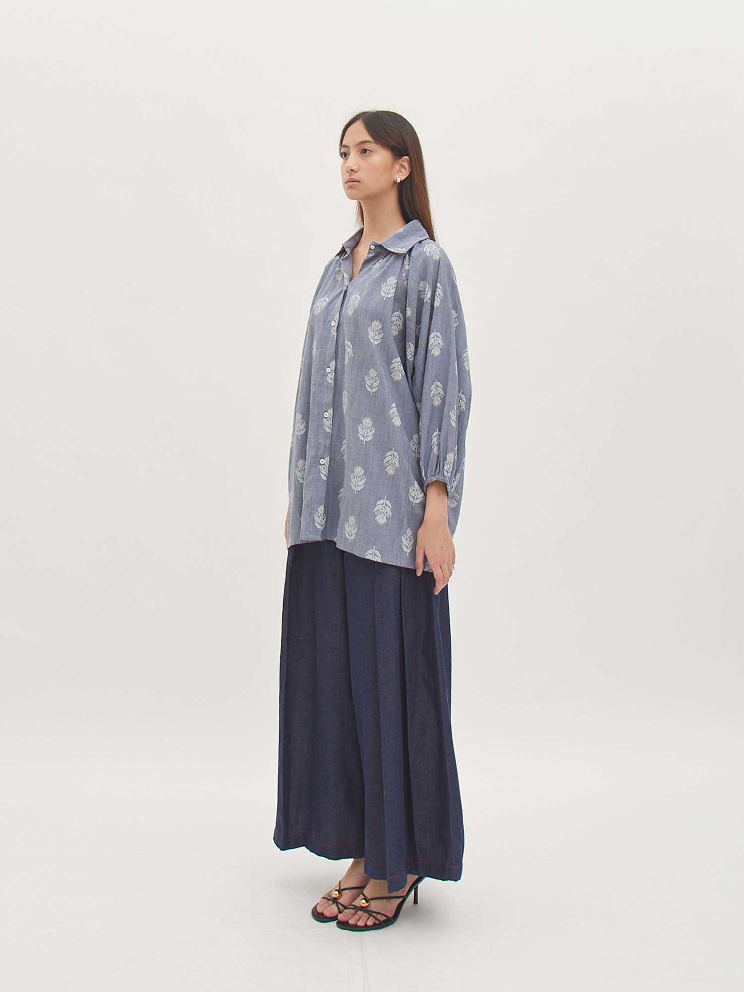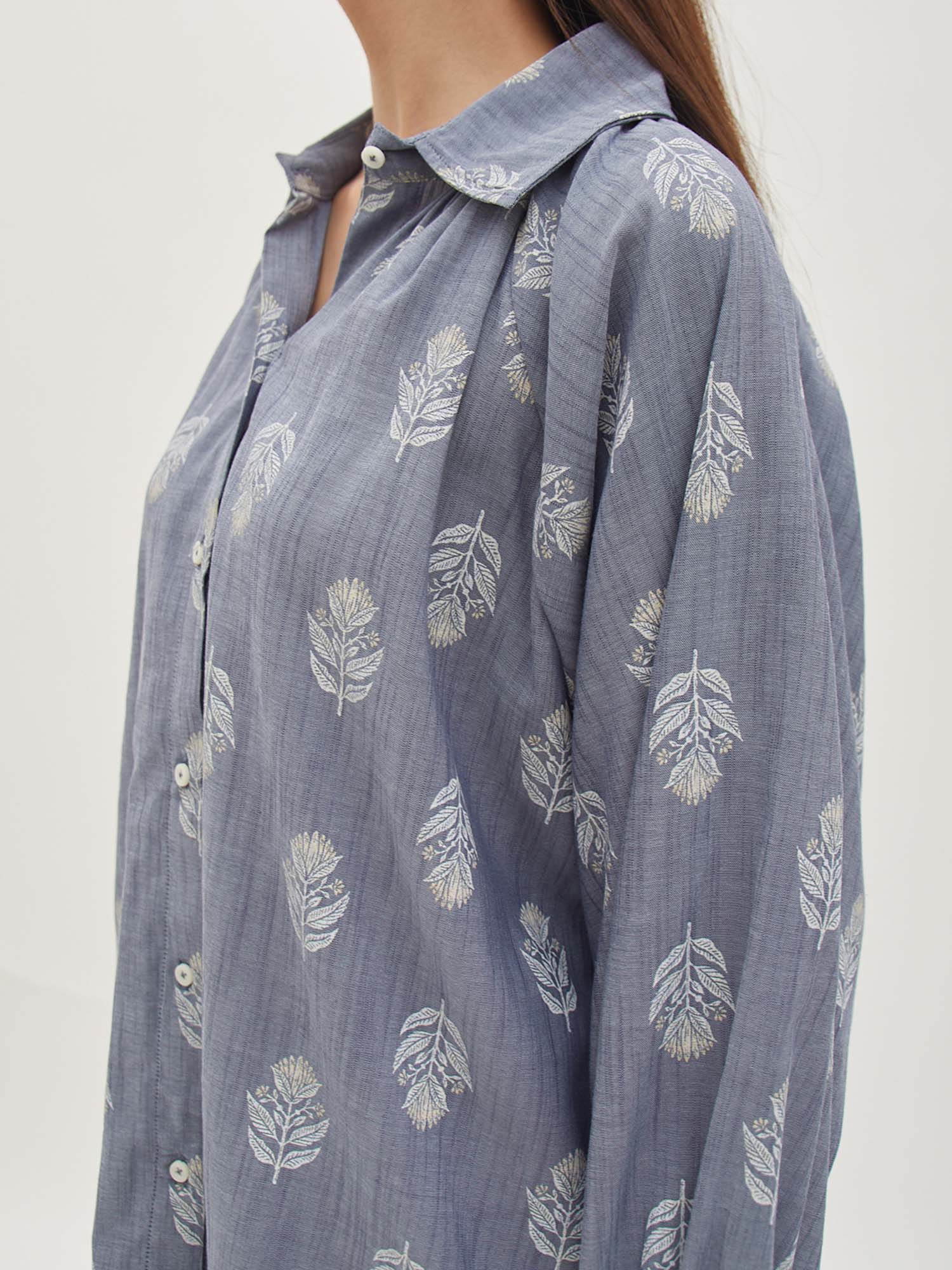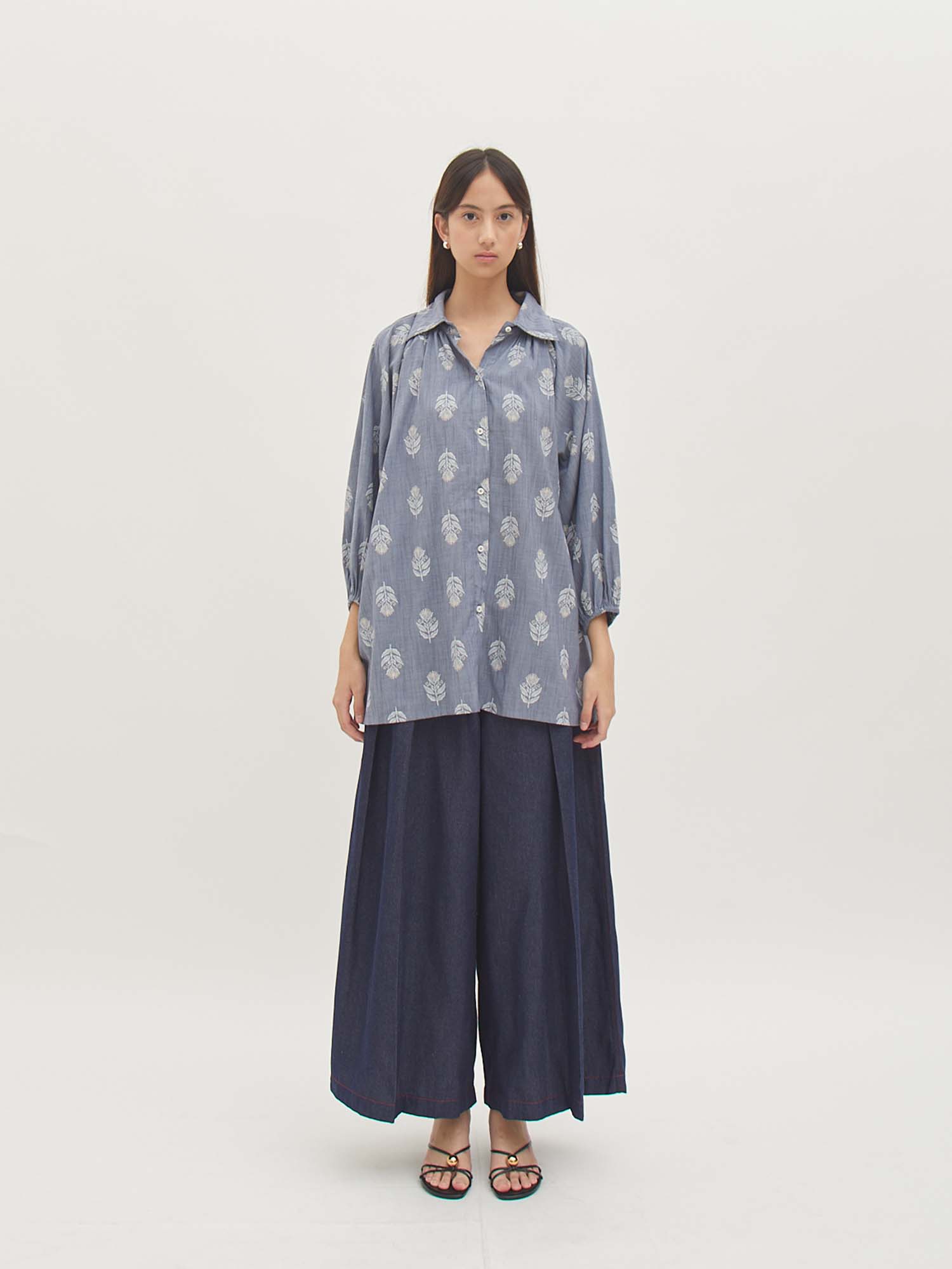Kemeja longgar bermotif botanical dengan nuansa lembut dan potongan relaxed fit. Dilengkapi detail kerutan di bagian punggung yang memberikan efek flowy dan elegan. Lengan raglan menambah kenyamanan serta memberi ruang gerak lebih bebas. Cocok digunakan sebagai atasan santai sehari-hari maupun untuk layering.