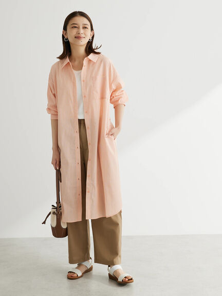 Dress wanita lengan panjang ini di desain dengan motif garis-garis juga model kerah basic dan saku, serta full kancing pada bagian depan. Terdapat tali pada bagian pinggang yang dapat disesuaikan. Bisa juga di kenakan sebagai dress saja atau sebagai outer.
