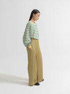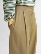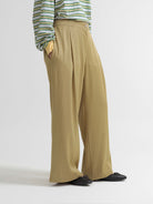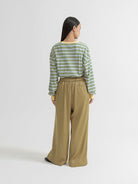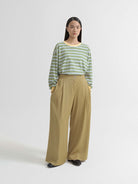 Celana wide-leg dengan siluet jatuh yang elegan, nyaman dipakai untuk aktivitas sehari-hari. Detail pleats di bagian depan memberikan tampilan lebih rapi, sementara pinggang karet di bagian belakang memastikan fit yang fleksibel. Material lembut, jatuh, dan tidak mudah kusut—cocok untuk gaya kasual hingga semi-formal.