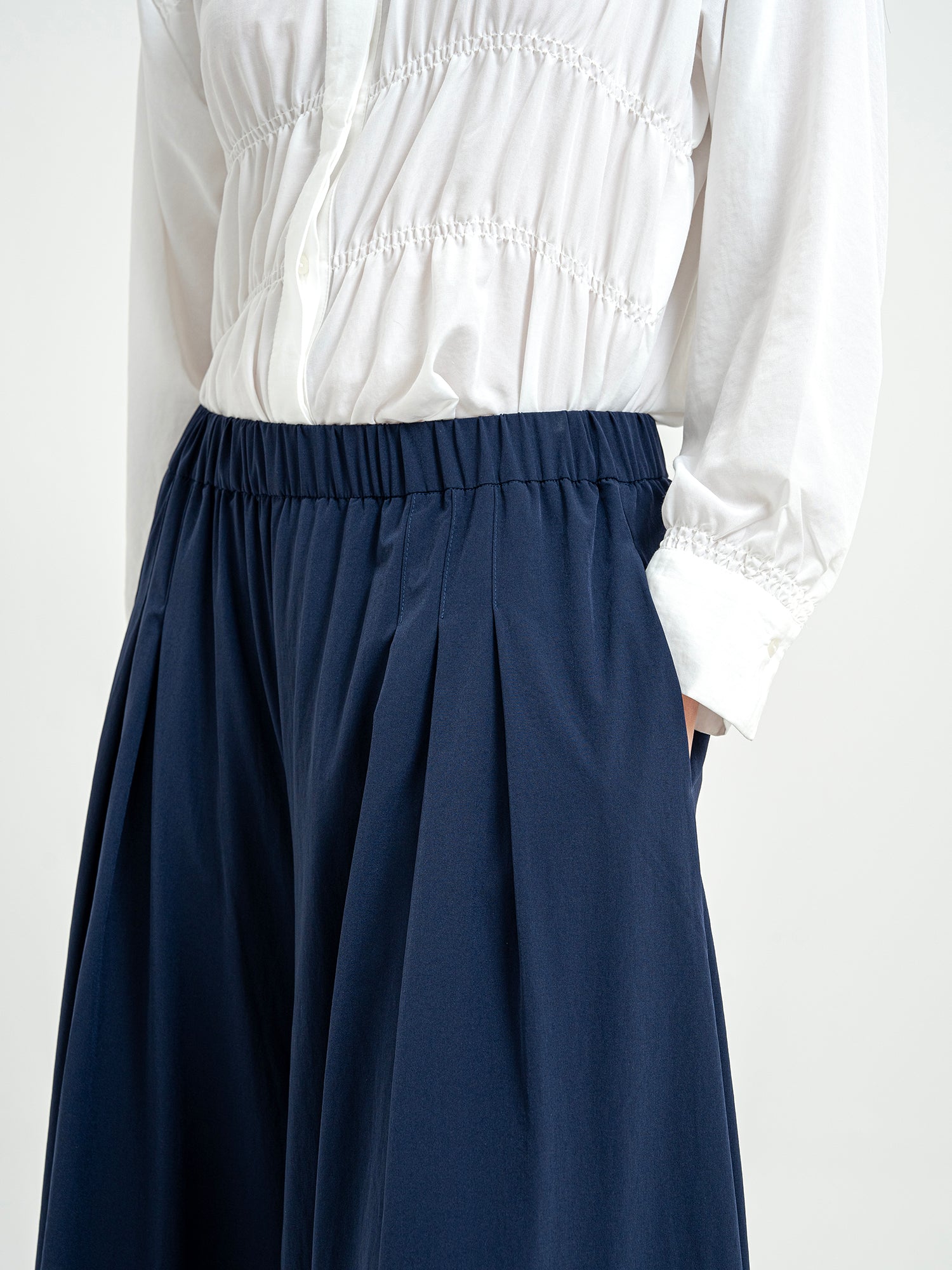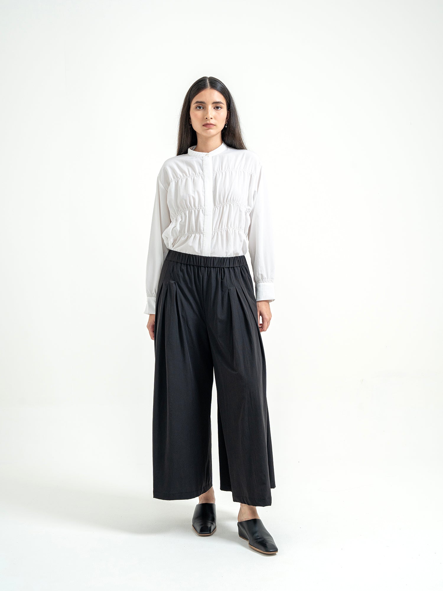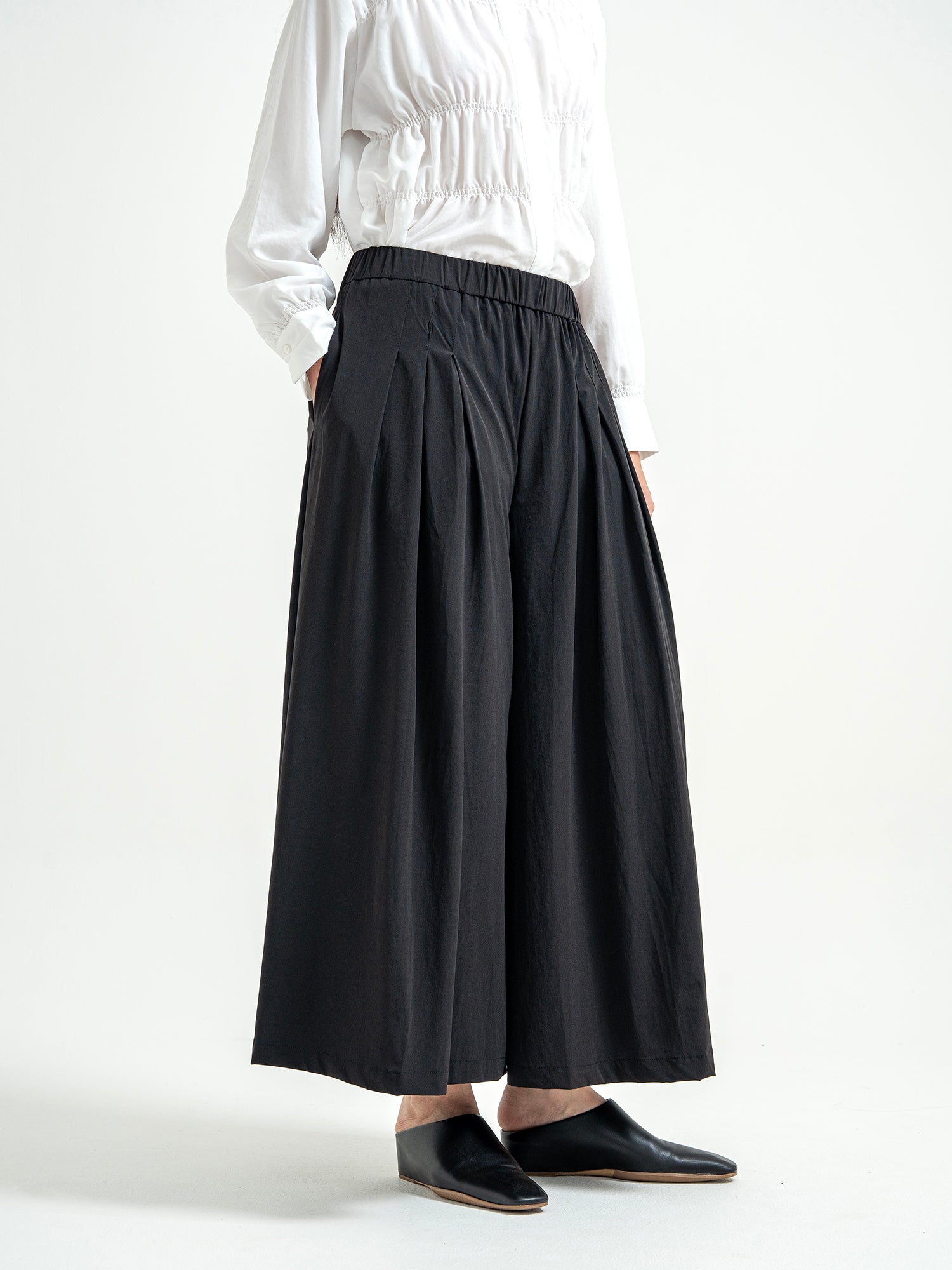 Celana panjang dengan potongan lebar dan detail lipit di bagian depan yang memberikan kesan flowy dan elegan. Dilengkapi karet di bagian pinggang untuk kenyamanan ekstra serta saku di bagian samping dan belakang yang praktis. Terbuat dari bahan nylon yang ringan dan nyaman dipakai sehari-hari.