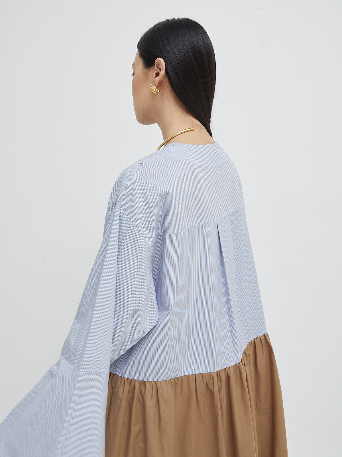 Tampil beda dengan Dress kombinasi desain asimetris dan aksen ruffle yang memberikan kesan chic dan edgy dalam satu tampilan. Dress ini hadir dalam motif Stripe Blue yang klasik yang nyaman dan breathable. Potongan longgar dengan lengan bell sleeve menambah kesan effortless stylish, cocok untuk tampilan santai yang tetap fashionable.