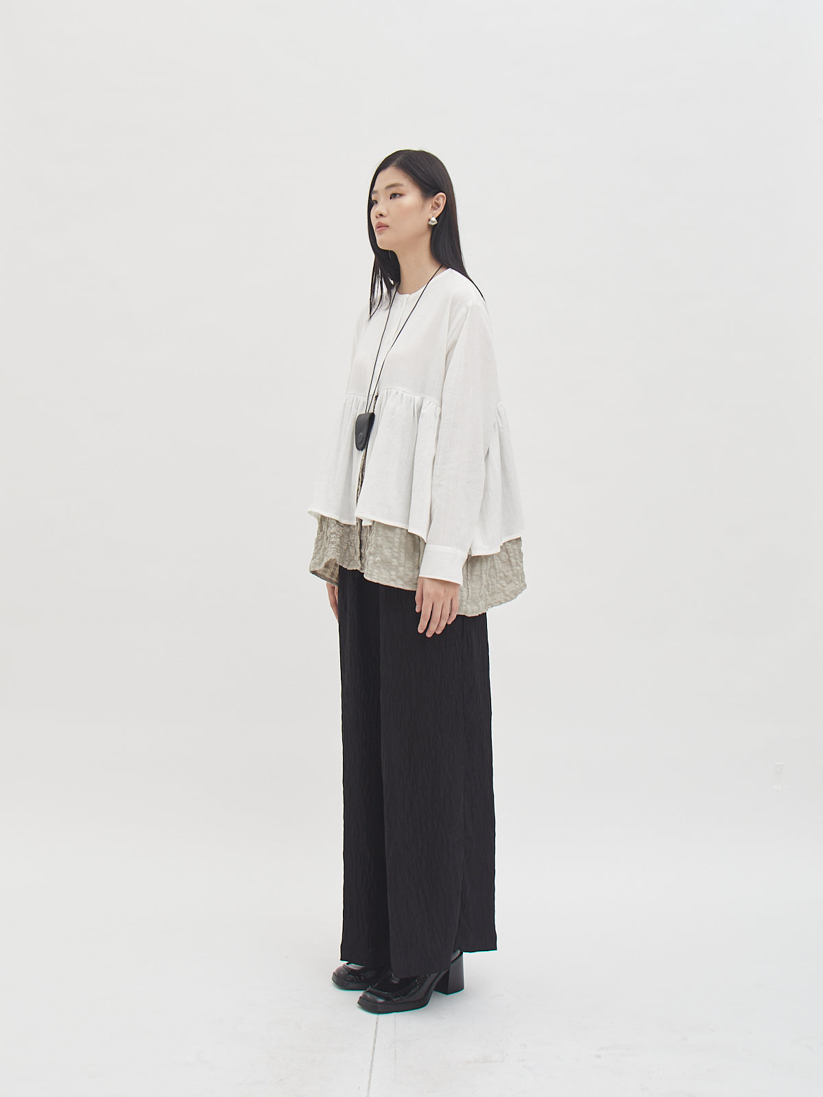 Dengan tekstur linen yang ringan dan breathable, atasan ini jadi pilihan versatile untuk dipakai sepanjang hari.