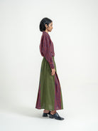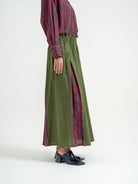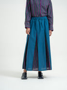 Rumi Skirt menampilkan kombinasi harmonis antara motif garis biru indigo dan panel warna hijau gelap yang memberikan kesan elegan dan modern. Desain A-line dengan potongan lebar di bagian bawah menciptakan siluet anggun, sementara pinggang elastis memberikan kenyamanan maksimal. Dilengkapi dengan saku di sisi kanan dan kiri, rok ini memadukan fungsi dan gaya dengan sempurna. Terbuat dari bahan 100% katun yang breathable dan lembut di kulit, rok ini cocok untuk tampilan kasual hingga semi-formal.
